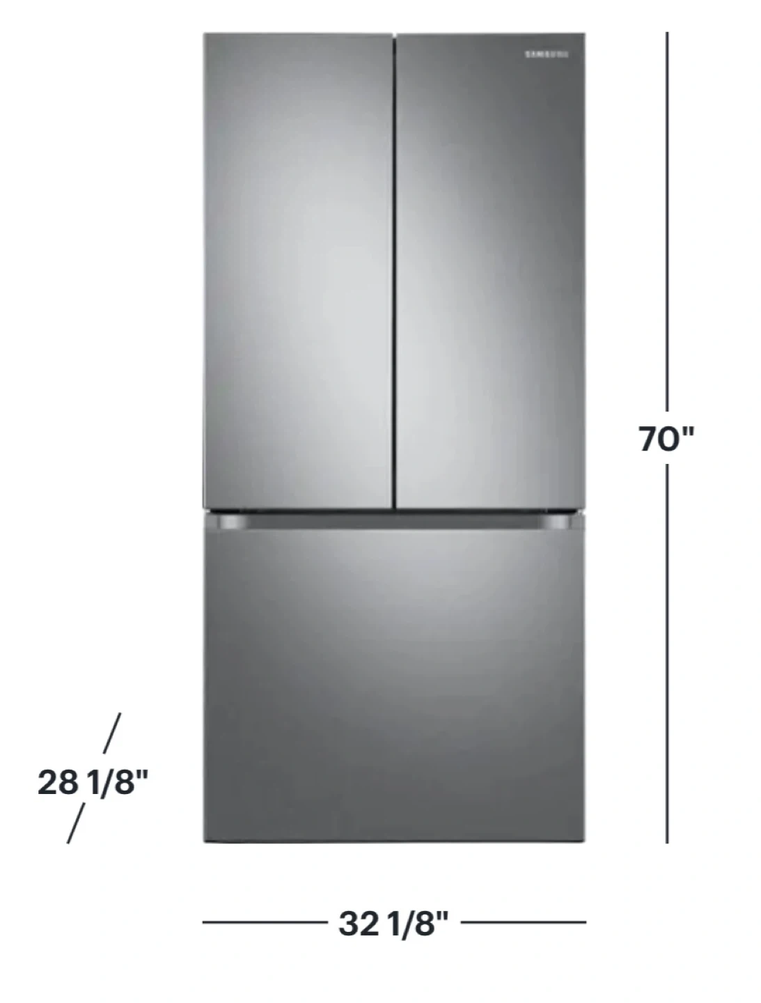 10Selling a Samsung French door refrigerator, model RF18A5101SR. It features Twin Cooling Plus to keep food fresh. Dimensions are approximately 32 1/8" W x 28 1/8" D x 70" H. It also has a SmartThings integration for easy control