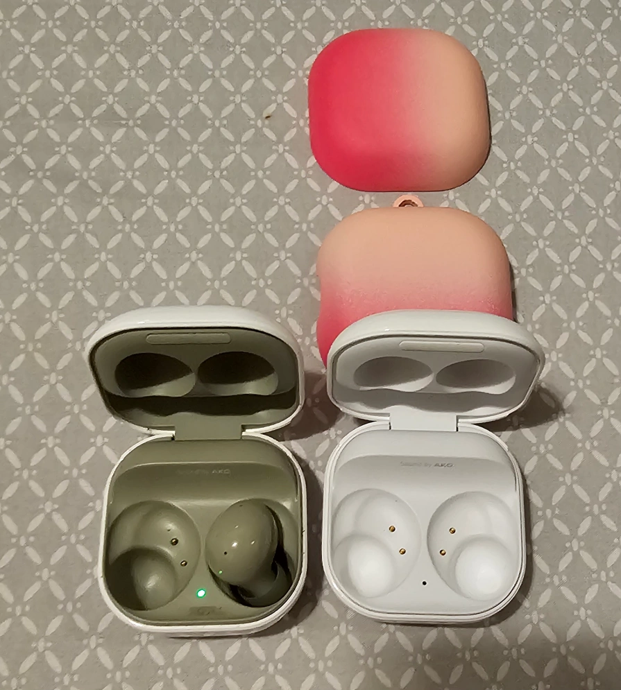 166Samsung galaxy buds 2 two charger cases one green with one right bud the other charger case is white in great condition