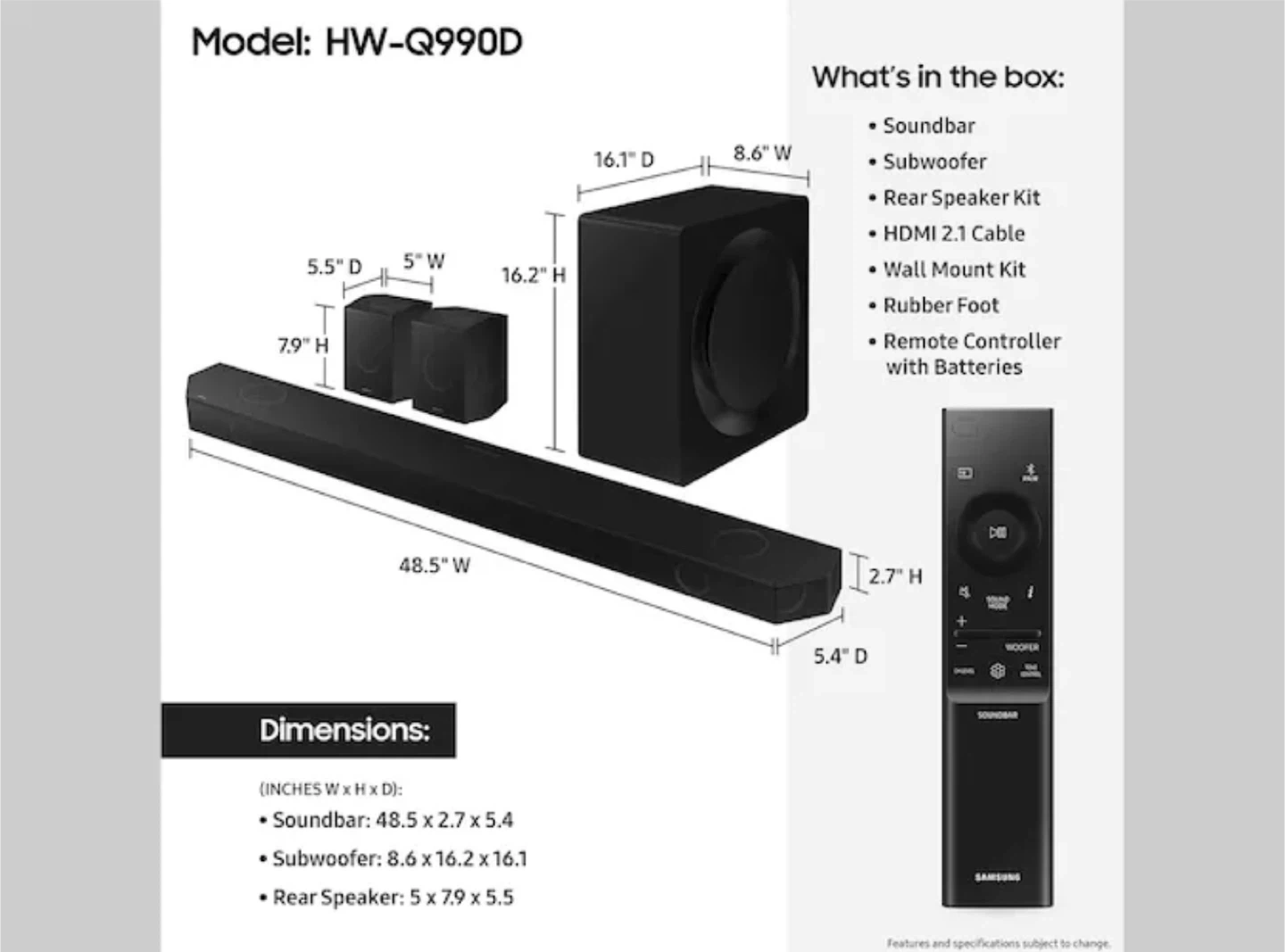 60Selling a Samsung HW-Q990D soundbar system! It includes the soundbar, subwoofer, and rear speakers. What's in the box: - Soundbar - Subwoofer - Rear Speaker Kit - HDMI 2.1 Cable - Wall Mount Kit - Rubber Foot - Remote Controller with Batteries Soundbar dimensions: 48.5 x 2.7 x 5.4 inches Subwoofer dimensions: 8.6 x 16.2 x 16.1 inches Rear speaker dimensions: 5 x 7.9 x 5.5 inches
