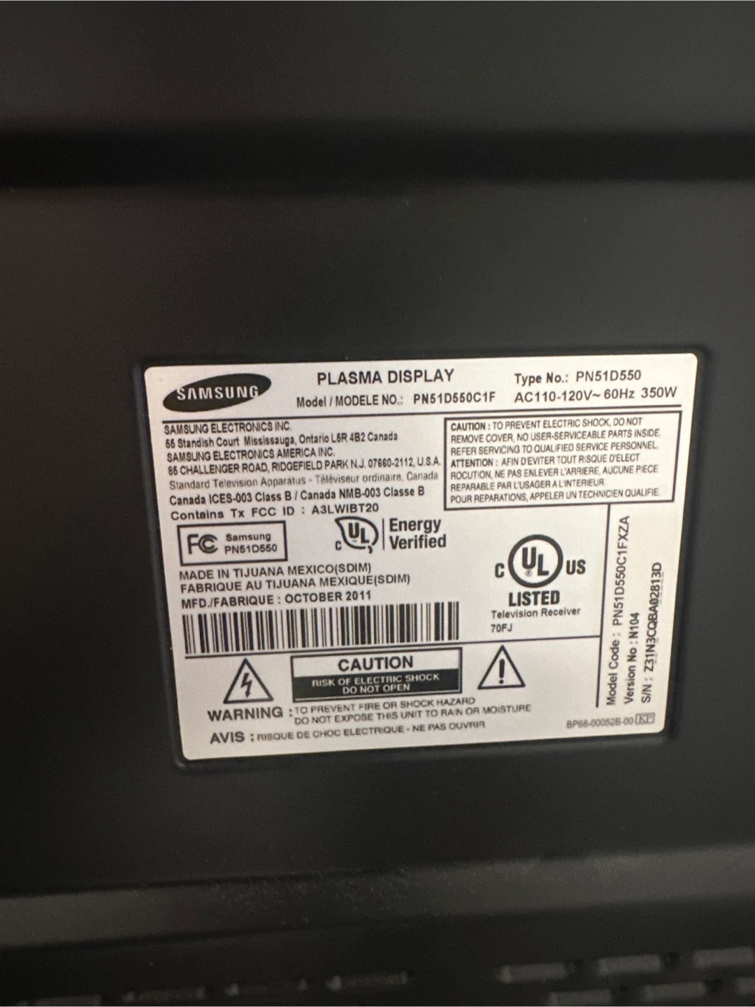 9Selling a Samsung 51-inch Plasma TV, model number PN51D550. It's a great television for any living room or entertainment space.