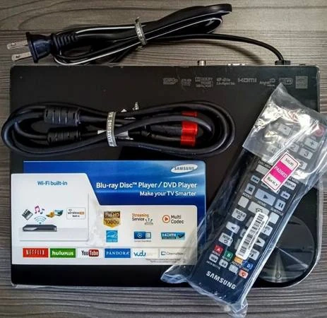38Samsung BD-HM57C Smart Blu-Ray and DVD Player Built in Wi-Fi Apps. Is New Never Used Only Tested Comes With Remote,HDMI Cable & Manual. Features & Details: *Apps Built-in for Streaming Discover more entertainment and enjoy streaming services from built-in Content Partners + Opera TV Apps directly from your Home Theater System that lets you stream music, movies, TV shows and more. *HD Upconversion With HD Upconversion, non-HD video is auto-enhanced to bring you near-HD quality. You'll see your favorite titles with greater detail and clarity that you've never seen before. *Quick Start Mode Your Smart Blu-ray Player is ready when you are in as little as 0.5 seconds. Most other Blu-ray players take up to 10 seconds. Stop waiting and start watching. *Anynet+ Redefine the universal remote with Anynet+ from Samsung. Control up to twelve compatible devices and streamline your device management for a better user experience. *USB Get complete access to stored audio and video files from any USB memory drive or external hard drive. This wide range of compatibility allows you to connect and share content via USB. *HDMI Connect your TV and audio systems for higher quality audio and a better entertainment experience when watching your favorite movies, shows and sports. The HDMI connection transmits video and audio over a single cable. *Dolby Digital Plus Optimizes the TV sound quality when viewing and listening to Internet movies, Internet music and other content played back from wired or wireless mobile phones, PCs and tablet devices. *Dolby True HD Processes standard 2-channel stereo audio tracks to deliver a full range surround sound effect with enhanced bass and dialog clarity. *DTS Surround Decodes DTS-encoded content, such as TV shows, Blu-ray movies and streaming media, and processes stereo content to deliver an optimized surround sound experience with enhanced bass response, clear dialog and consistent volume levels.