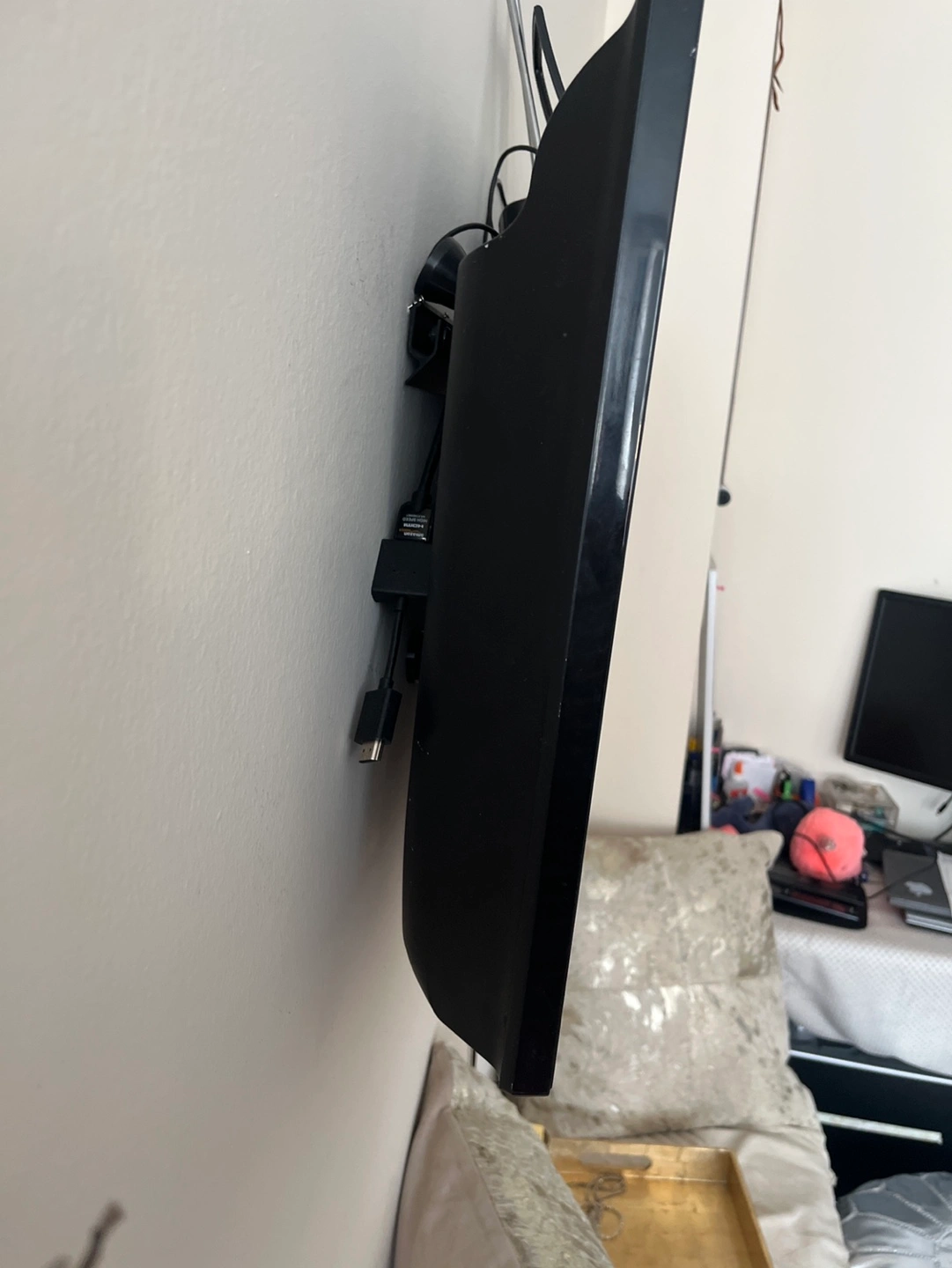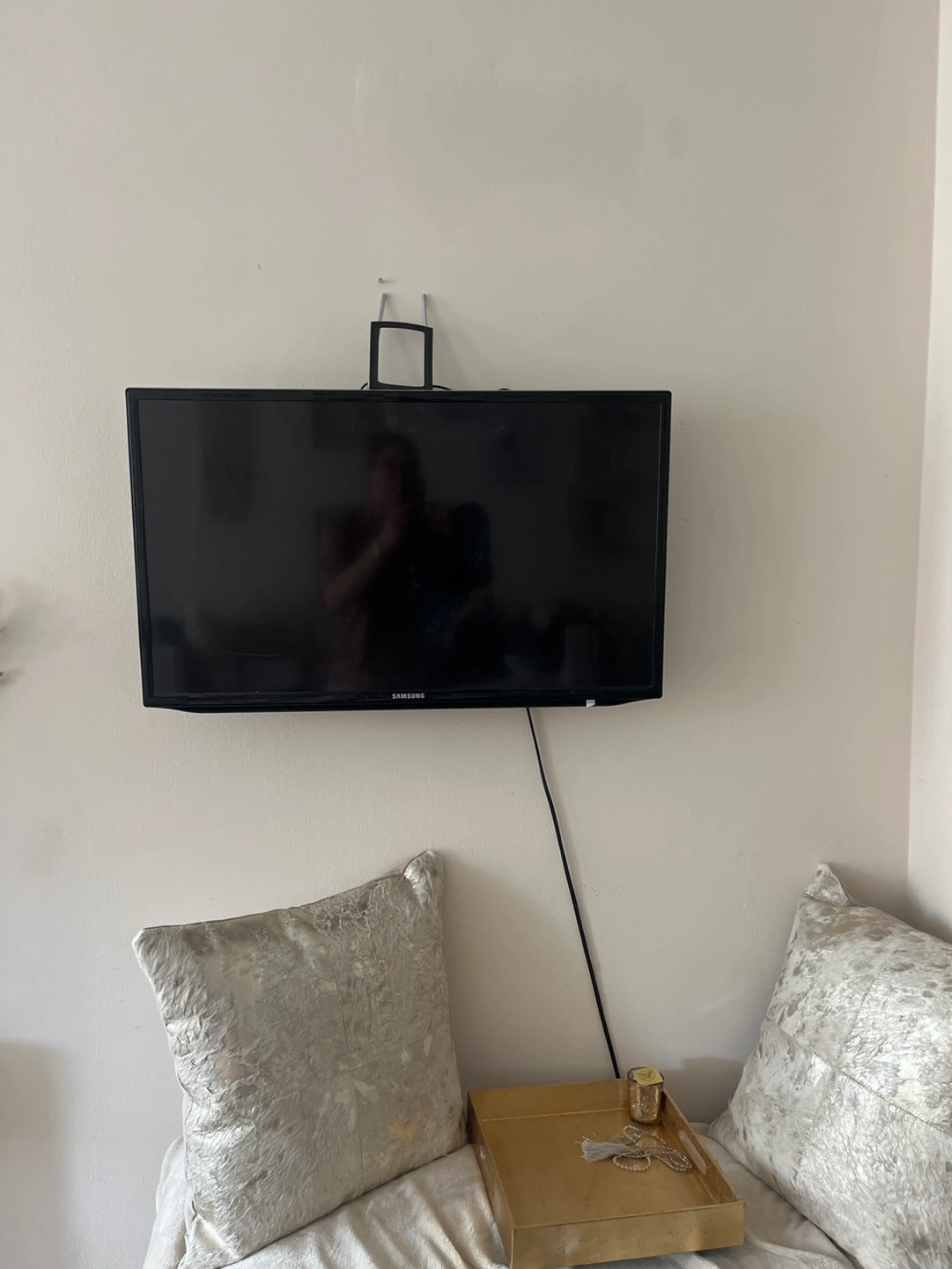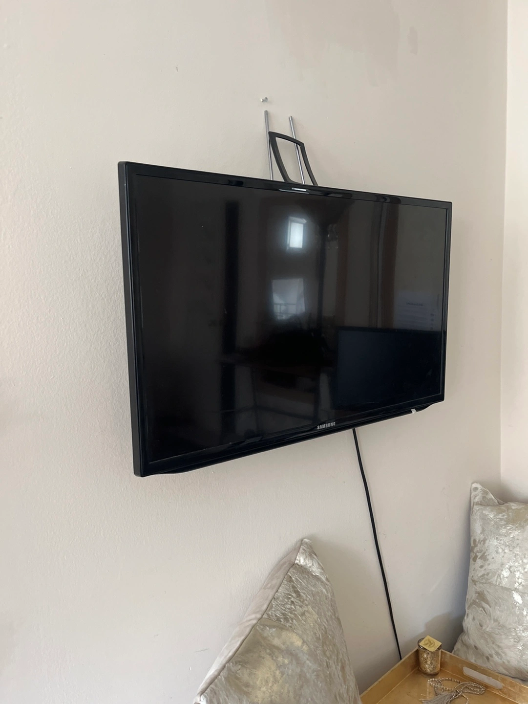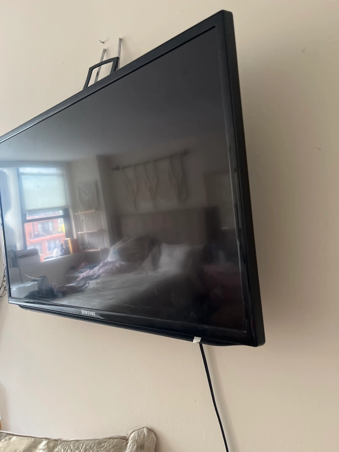Wall-mounted Samsung smart HDTV. Best TV is capable of connecting to your Internet and cable. Antenna is not included television stand shown in pictures will be included. The screen measures 27.75 inches wide, 15.6 inches tall, and 31.75 inches diagonal
