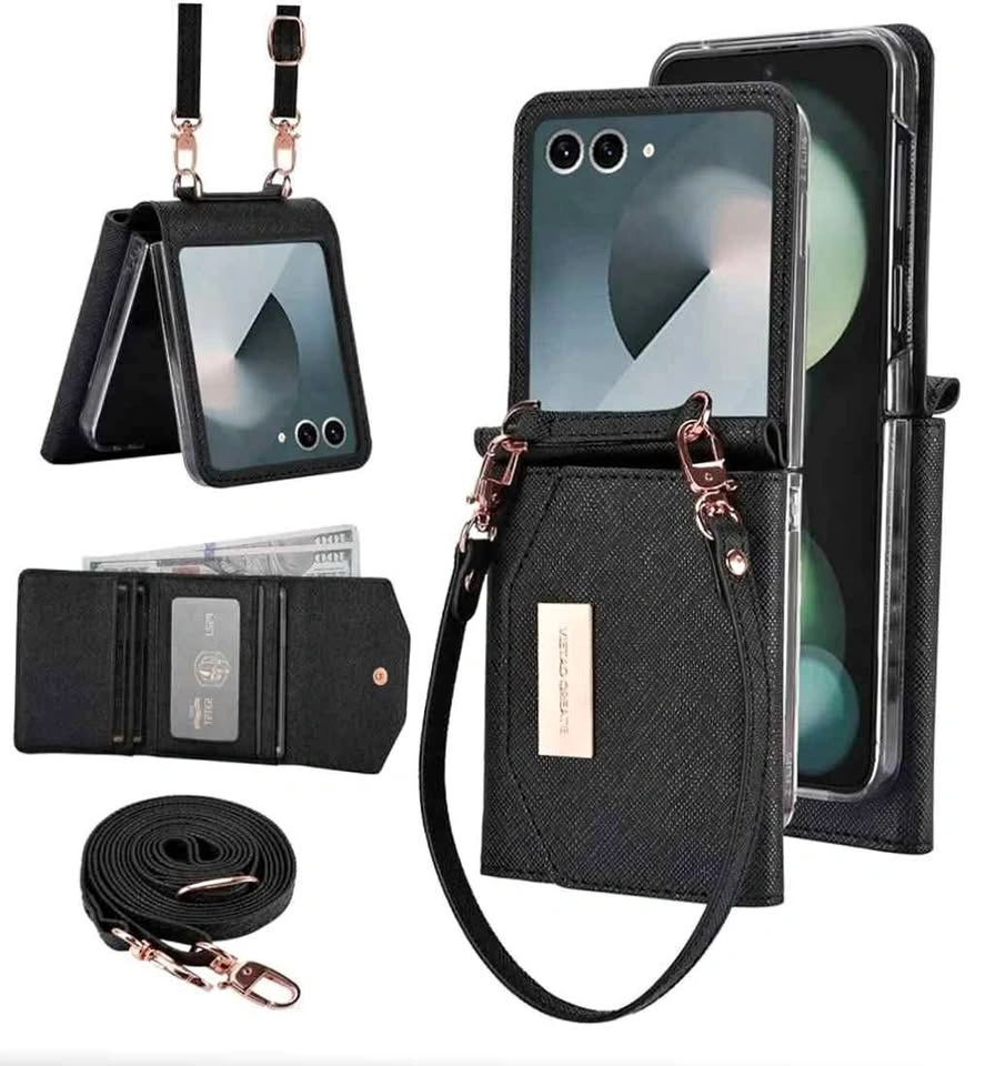 Brand new cell phone case and wallet Compatible Phone Models Samsung Galaxy Z Flip 7 Color Black MaterialFaux Leather Pattern Cross Stripe Soft and Comfortable Microfiber Leather Flip Case, Only Compatible with [Samsung Galaxy Z Flip 7 5g] [Released 2025]. Combining elegance and functionality, serving as both a phone case and a carrying handbag, offering a perfect fusion of style and practicality. This Samsung Z Flip 7 case includes 4 card slots and 1 cash slot, offering storage for ID cards, credit cards, and cash. With its all-in-one design, this purse case eliminates the need for a bulky wallet. Perfect for shopping, walks, business trips, or everyday use. The case comes with two Removable straps, a long cross-body shoulder strap and a wrist-let handle strap, allowing you to easily switch between using it as a cross-body bag or a handbag. versatile clutching pouch with mini flip buttons for both card holder and phone shell sections. This folding phone case includes Hinge Protection for safeguarding the folding hinge. It minimizes wear and damage, ensuring durability and reliable performance.No support for wireless charging. Crafted from high-quality luxury microfiber leather with a timeless color pattern, this case exhibits durability and meticulous sewing. The inner phone shell is constructed with hybrid plastic, while the soft microfiber lining provides protection against scratches and prevents accidental slipping. Accurate cutouts and precise fit.
