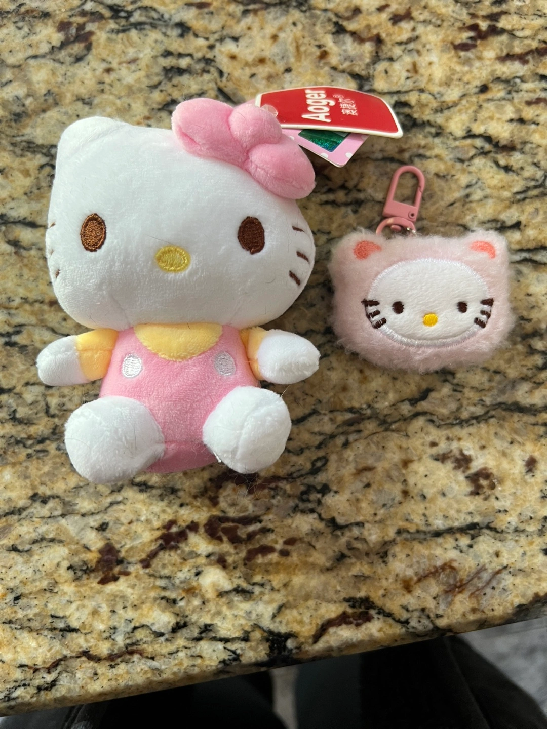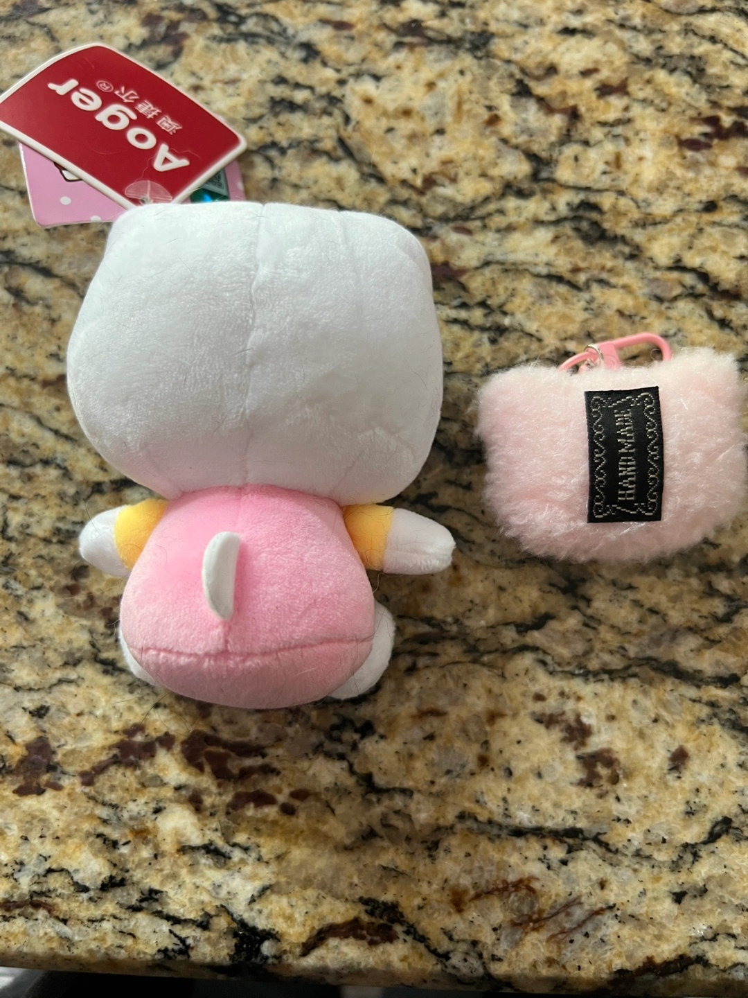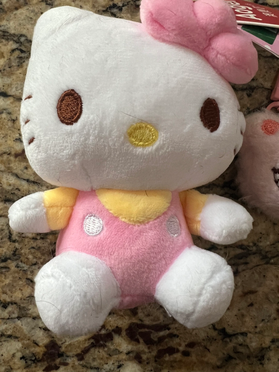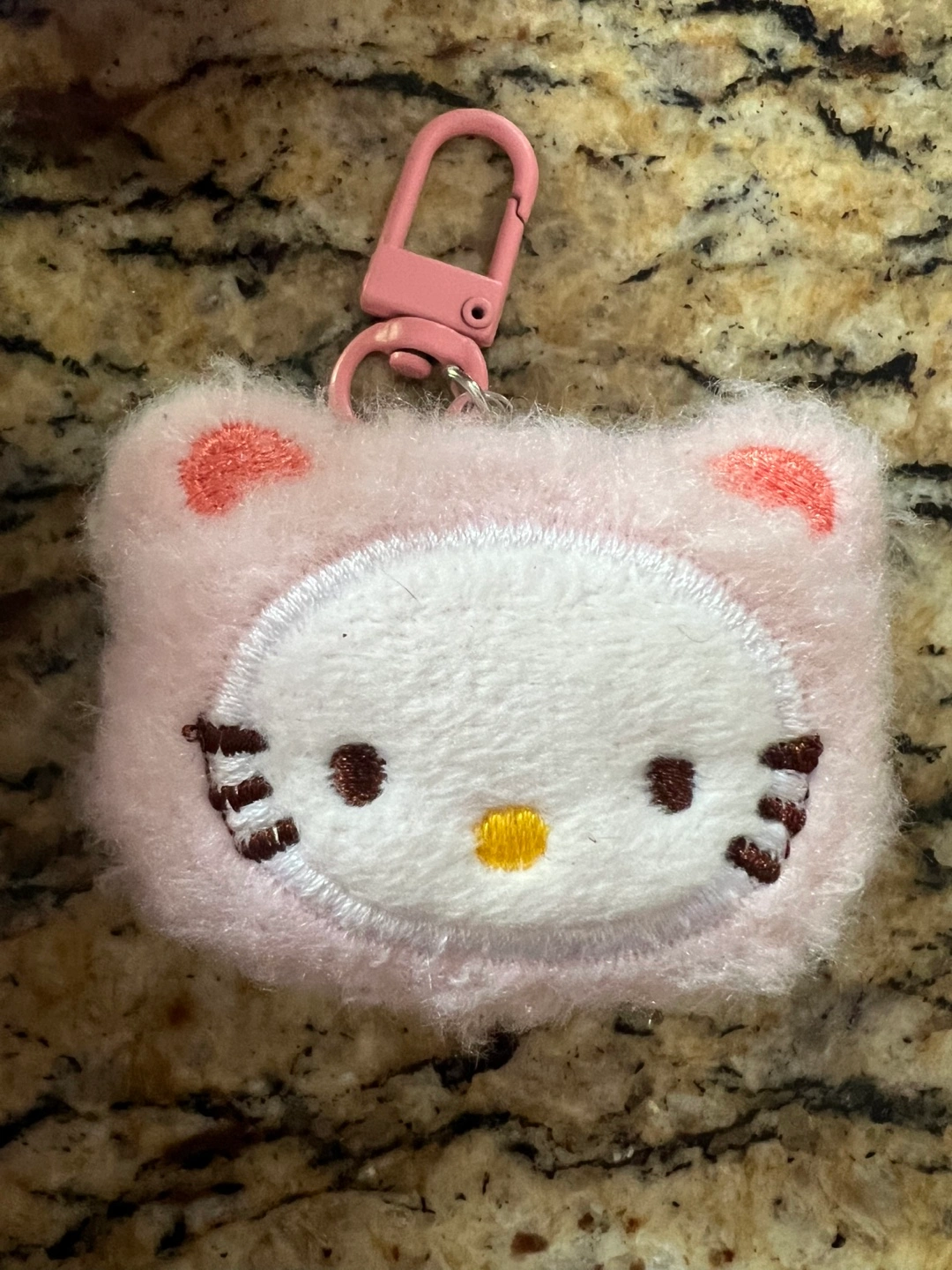 65Adorable Hello Kitty plush keychain set. Includes a small plush Hello Kitty figure and a fuzzy Hello Kitty pouch keychain. Perfect for bags or keys.
