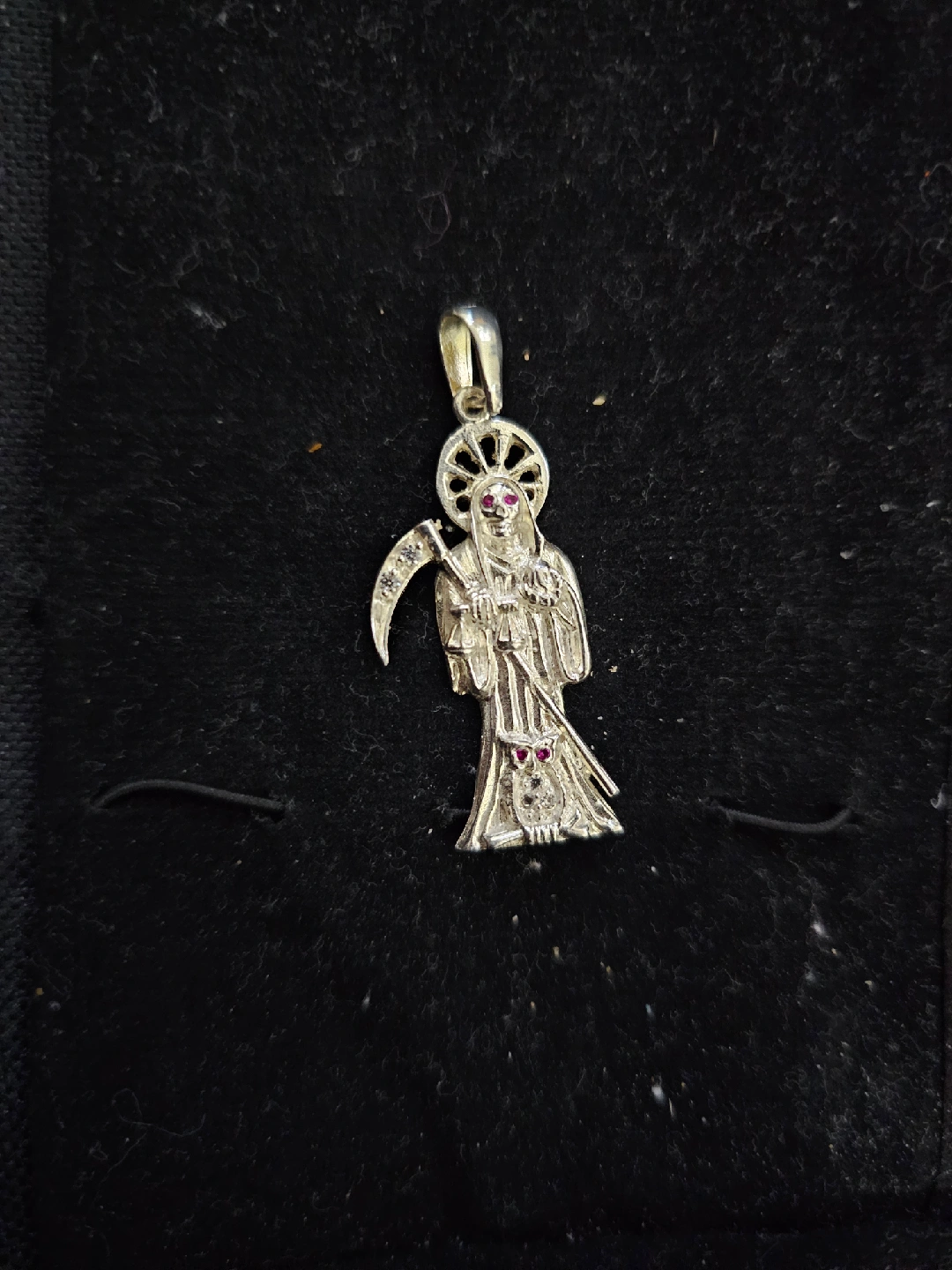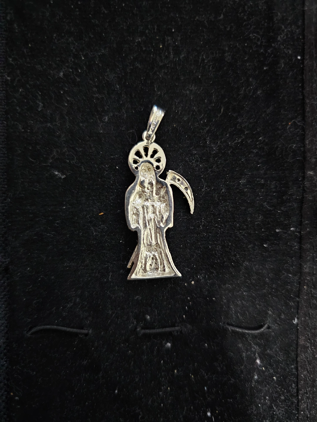 15Selling a Santa Muerte pendant. It appears to be made of silver and features red accents.