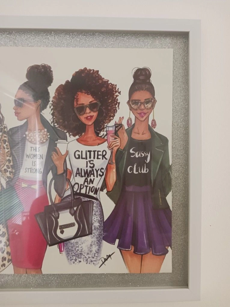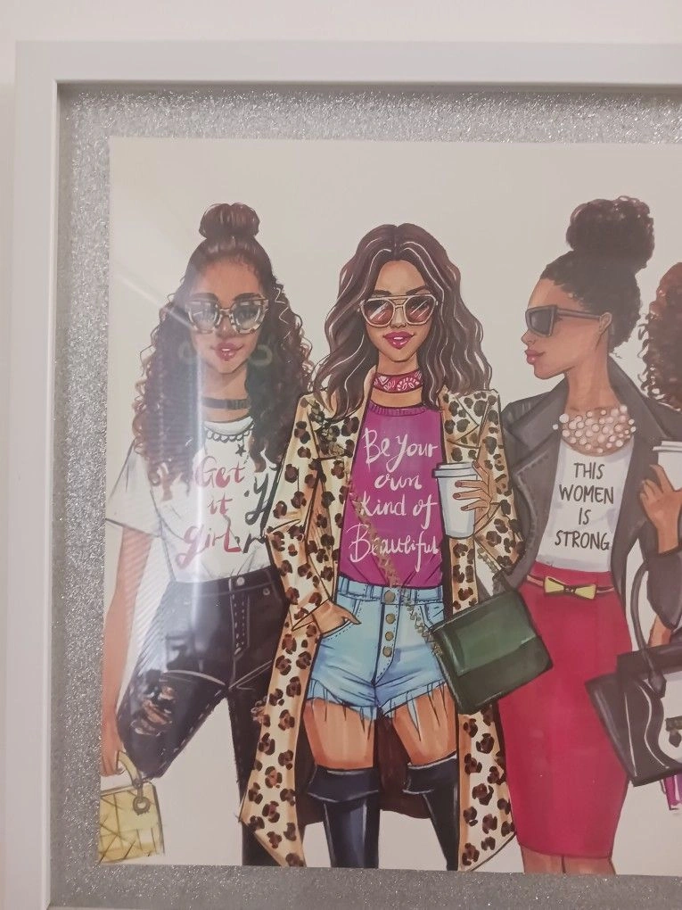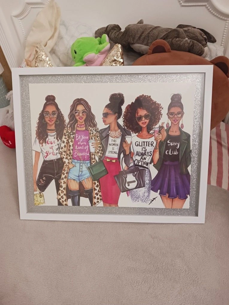 Stylish framed wall art featuring four fashionable women with empowering quotes like “Be Your Own Kind of Beautiful” and “Glitter Is Always an Option.” ✨ Glitter silver frame border adds a touch of sparkle ✨ Vibrant illustration with a confident, fashion-forward vibe ✨ Perfect for bedrooms, salons, or vanity décor 📏 Approx. 12” x 16” 📍 Pick-up in Bronx, NY