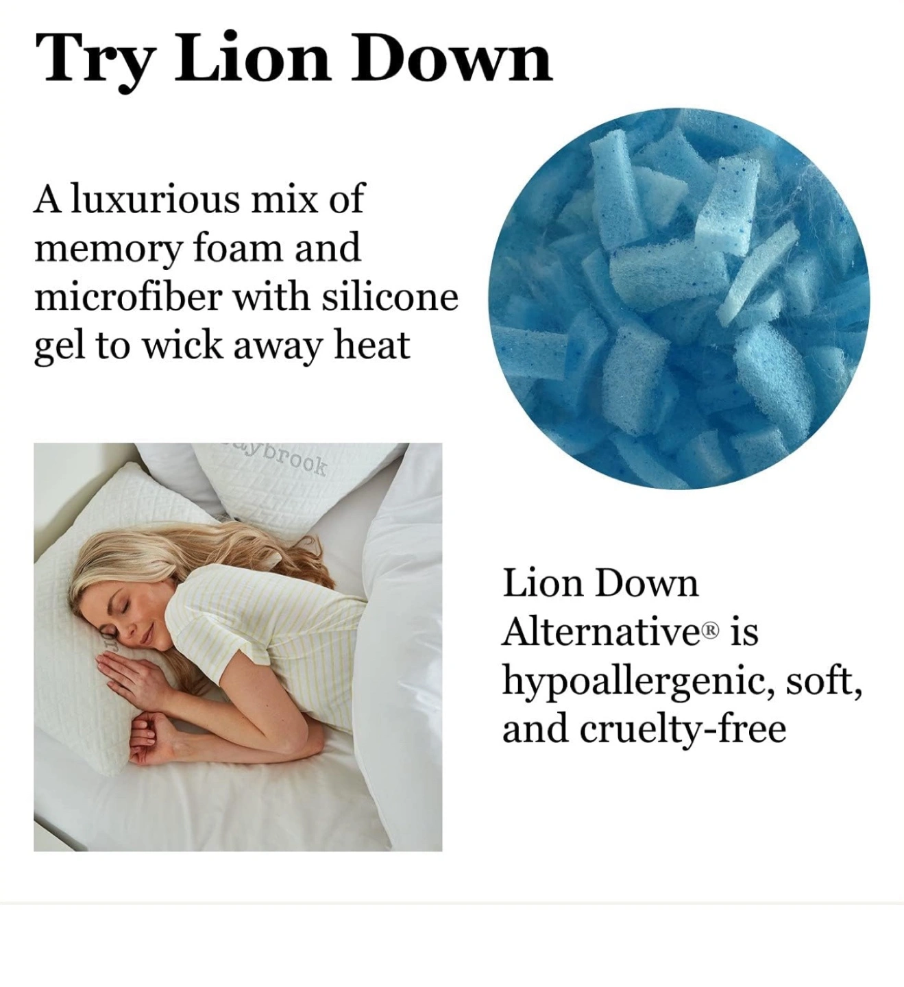 109Get a good night's sleep with this Saybrook Lion Down Alternative pillow! It features a luxurious mix of memory foam, microfiber, and gel beads, designed to wick away heat. The pillow is hypoallergenic, soft, and cruelty-free, so you can rest easy knowing you're making a responsible choice. Comes with the original packaging!