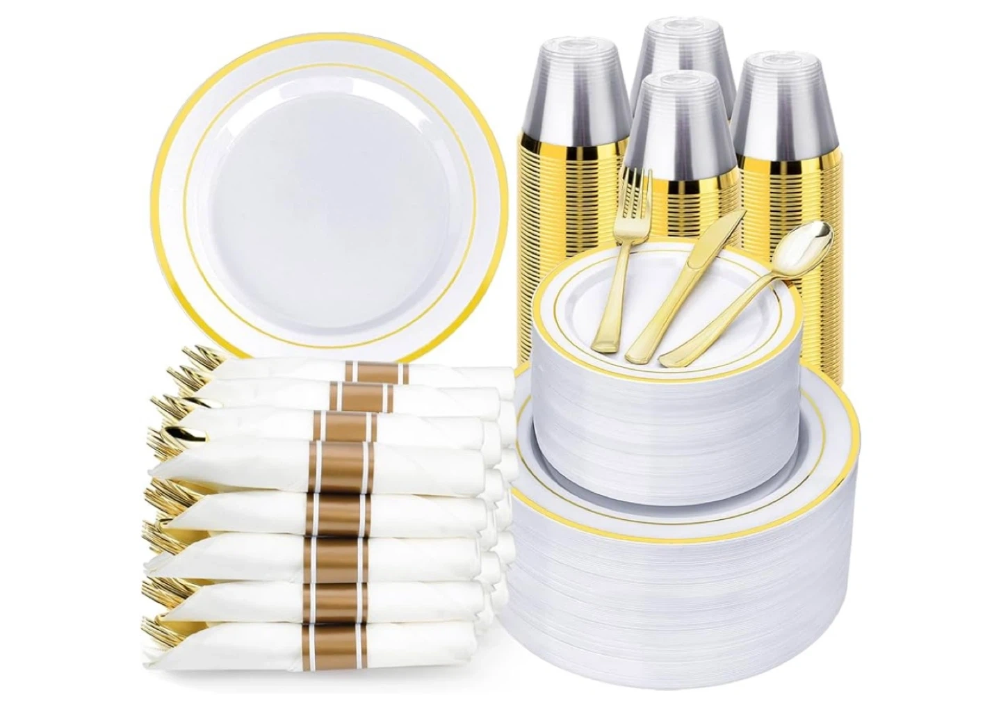 700PCS Gold Plastic Dinnerware Set for 100 Guests, Disposable Plates for Party, Include: 200 Plastic Plates, 100 Pre Rolled Napkins with Gold Silverware, 100 Cups