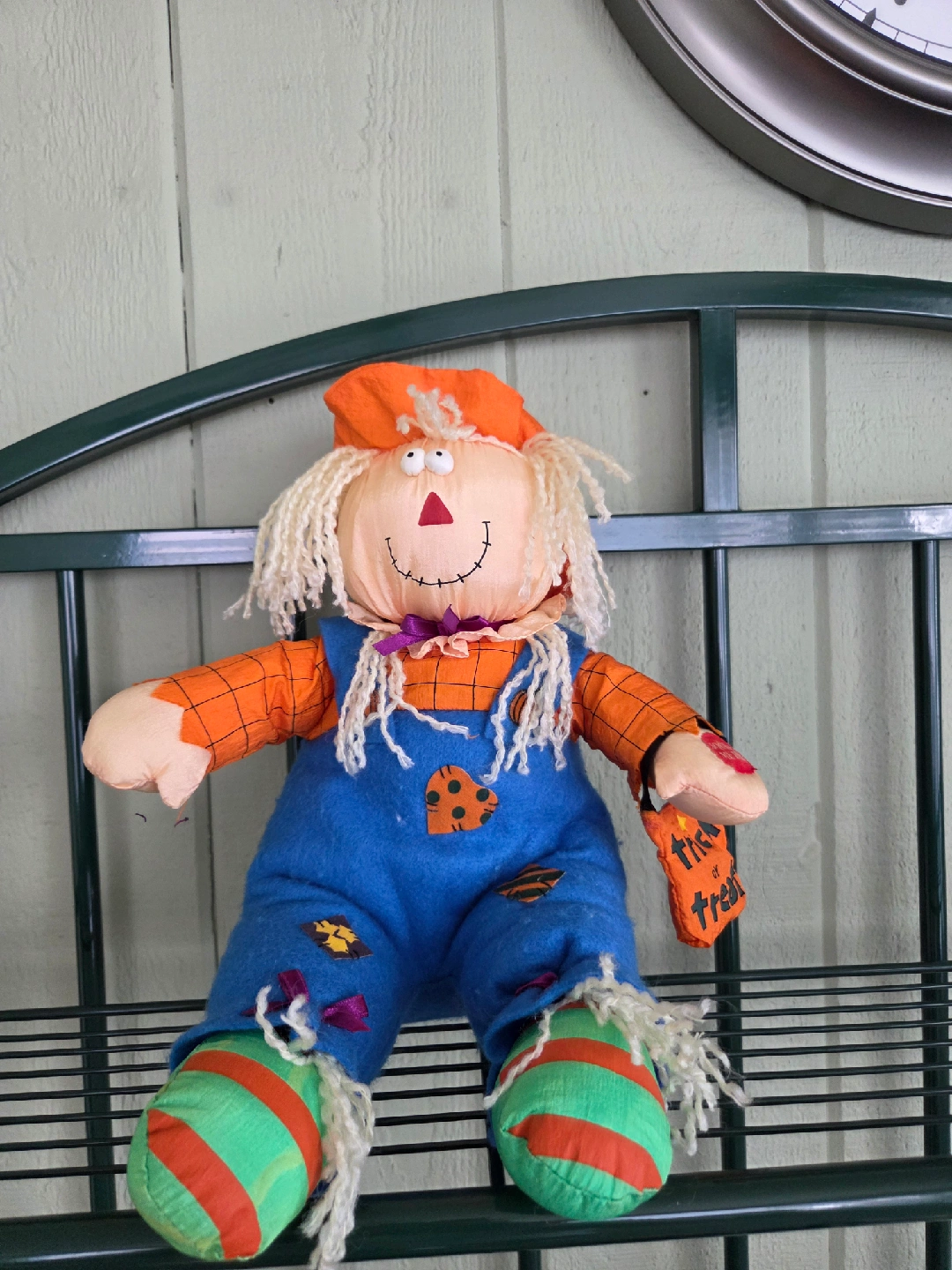 This adorable scarecrow doll is ready to bring some autumn cheer to your home! It's wearing a cute outfit with overalls and a hat, and holding a little trick-or-treat bag. Perfect for decorating your porch or adding a touch of whimsy to any room