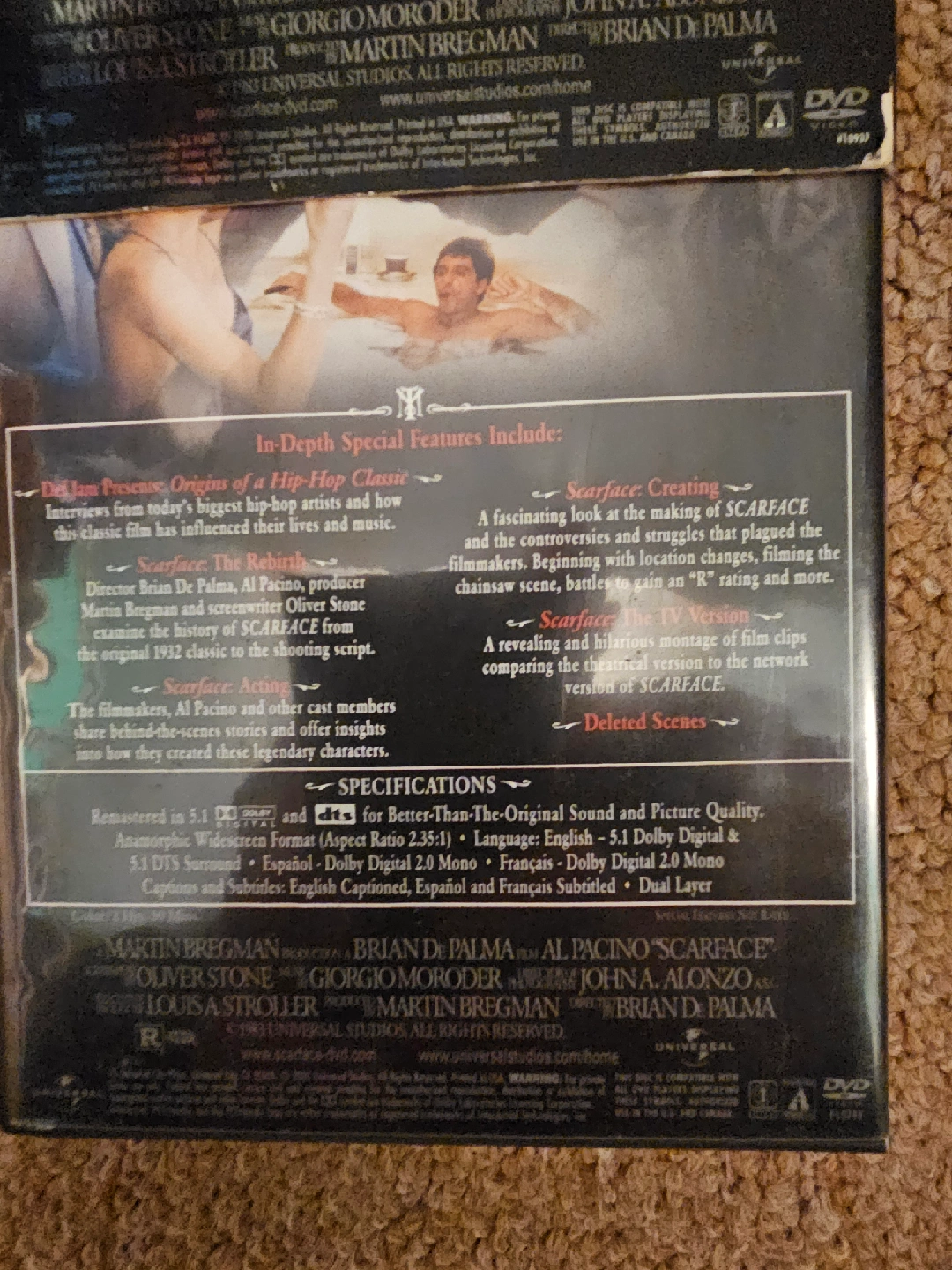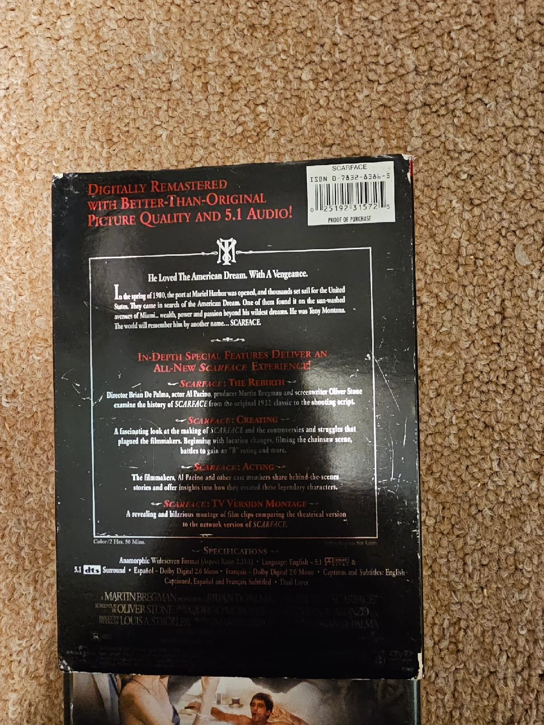 78Selling a Scarface Two-Disc Anniversary Edition DVD It is digitally remastered with better-than-original picture quality and 5.1 audio! In-depth special features include: -Scarface: The Rebirth -Scarface: Creating -Scarface: Acting -Scarface: The TV Version -Deleted Scenes