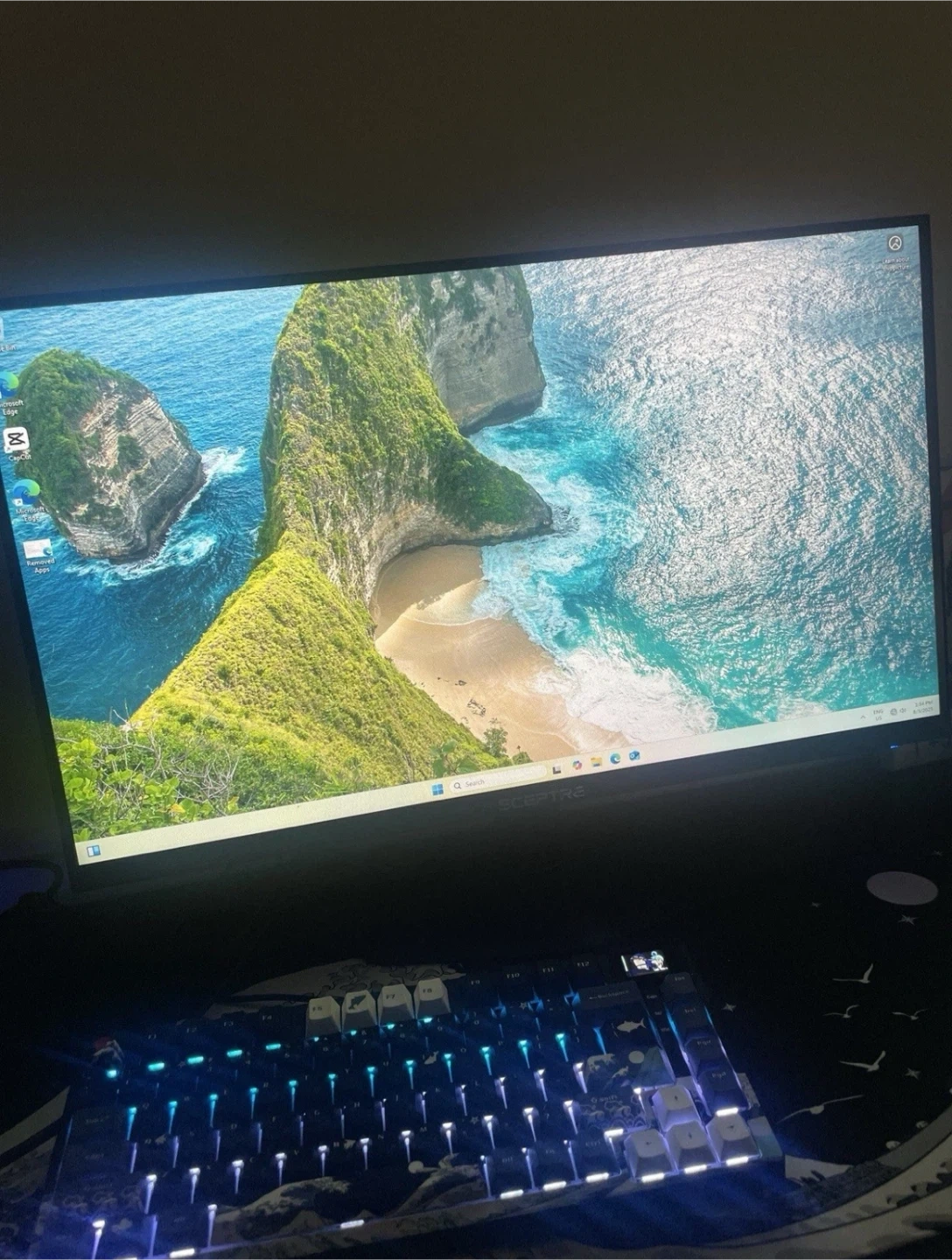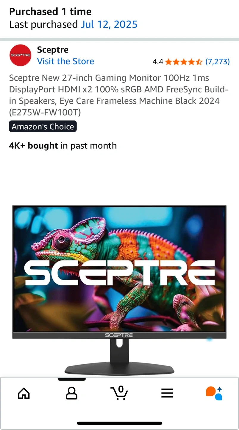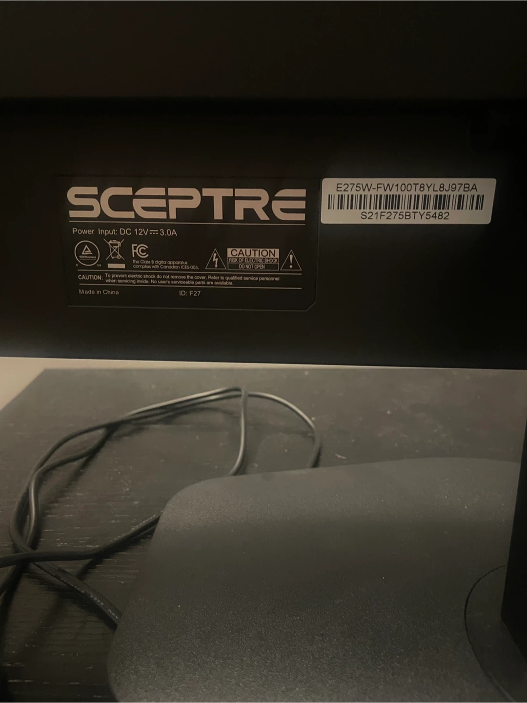 Selling a Sceptre 27-inch gaming monitor in black. It has a 100Hz refresh rate and 1ms response time. It also features DisplayPort, HDMI x2, 100% sRGB, and AMD FreeSync. It's a frameless machine, model E275W-FW100T. Includes the power adapter
