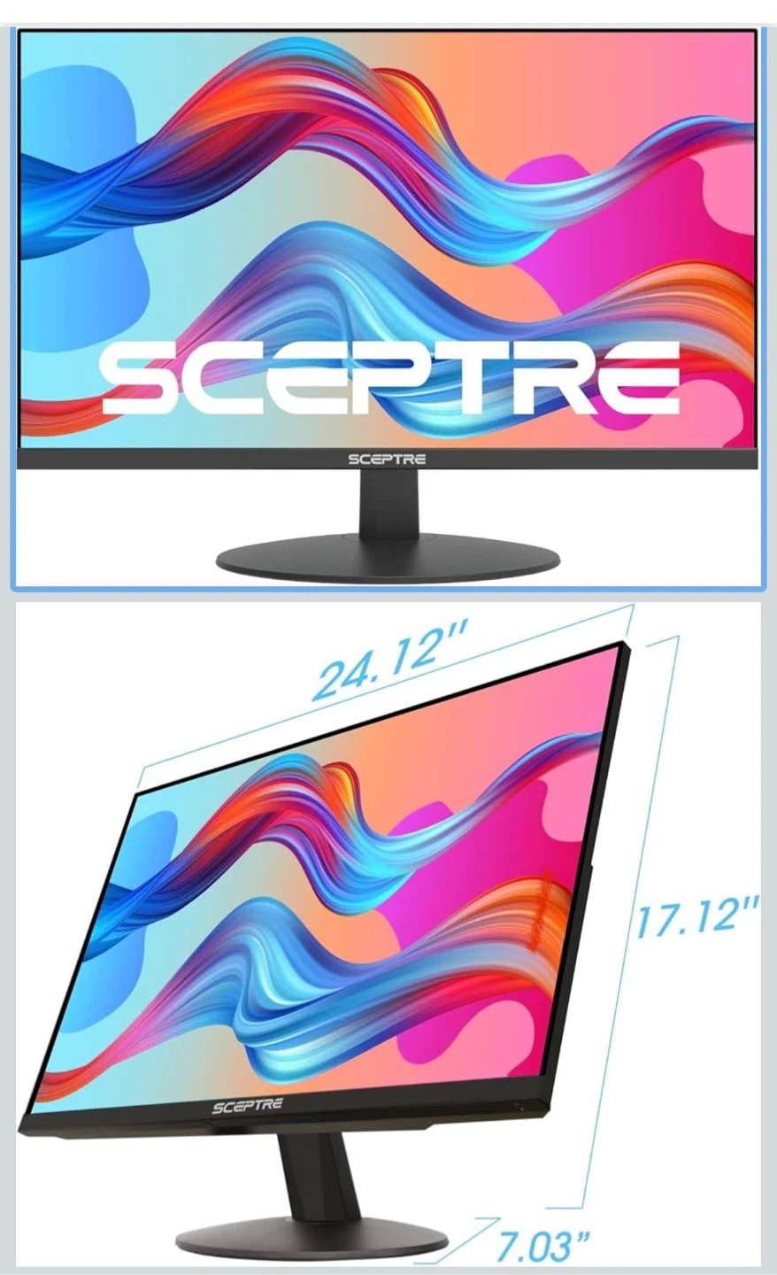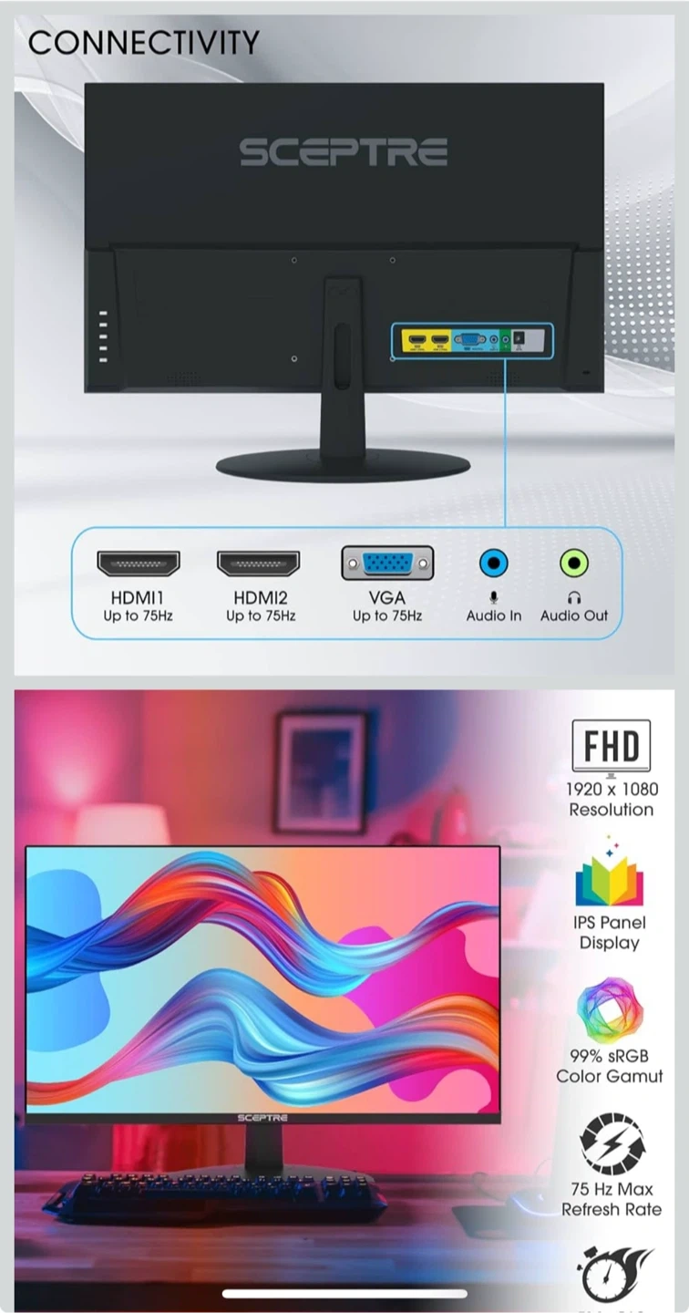 **Pick-Up Only** Brand: Sceptre Screen Size: 27 Inches Resolution: FHD 1080p Aspect Ratio: 16:9 Screen Surface Description: Matte Image Contrast Ratio: High Wide Viewing Angles: Wide viewing angles keep all the action sharply in sight from almost any viewing position while gaming on large monitors or dual-display setup. Fast Response Time: Playing fast action games and watching action adventure movies always require fast and accurate pixel response from an LED. With quick response times, ghosting and blurring are reduced so the user can enjoy the display with clarity and precision. Multiple Ports: Two HDMI ports and one VGA port provide up to 75HZ refresh rate, refining picture clarity in all action-packed gaming sequences and graphic design projects. Audio In and a Headphone Jack provide diverse audio options. Edgeless Design: Edgeless Design completely immerses you in all the captivating action and wondrous scenery that 1080P resolution and 75Hz refresh rate have to offer. 99% sRGB Color Gamut: With 99% sRGB, our display reveals an astonishing brightness and variance in red, green, and blue color across a wide gamut, providing a more defined and naturalistic display of color in every image. Blue Light Shift: Reduce your monitors blue light to protect you from eye fatigue, irritation and strains. This enables you to work on your documents, watch movies, or play games more comfortably for extended periods. Anti-Flicker: Provides a crisper picture by preventing the backlight from flickering periodically.