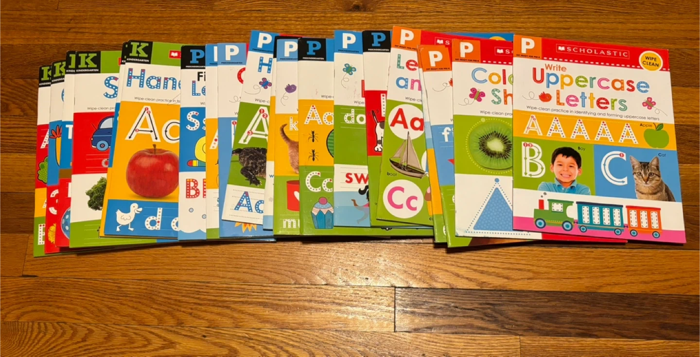 71I'm selling a set of Scholastic Early Learners Wipe Clean workbooks. These are great for preschool practice in reading and writing skills. The set includes a variety of titles such as Phonics Practice, Alphabet Practice, Handwriting Practice, First Concepts, Counting to Ten, ABC, First Letter Sounds, 123, Colors and Shapes, Uppercase Letters, Lowercase Letters, First Phonics, and Letters, Words, and Numbers. Get ready for (5)Pre- K, (9)Pre-K, and (6)Kindergarten books. A total of 20 books!