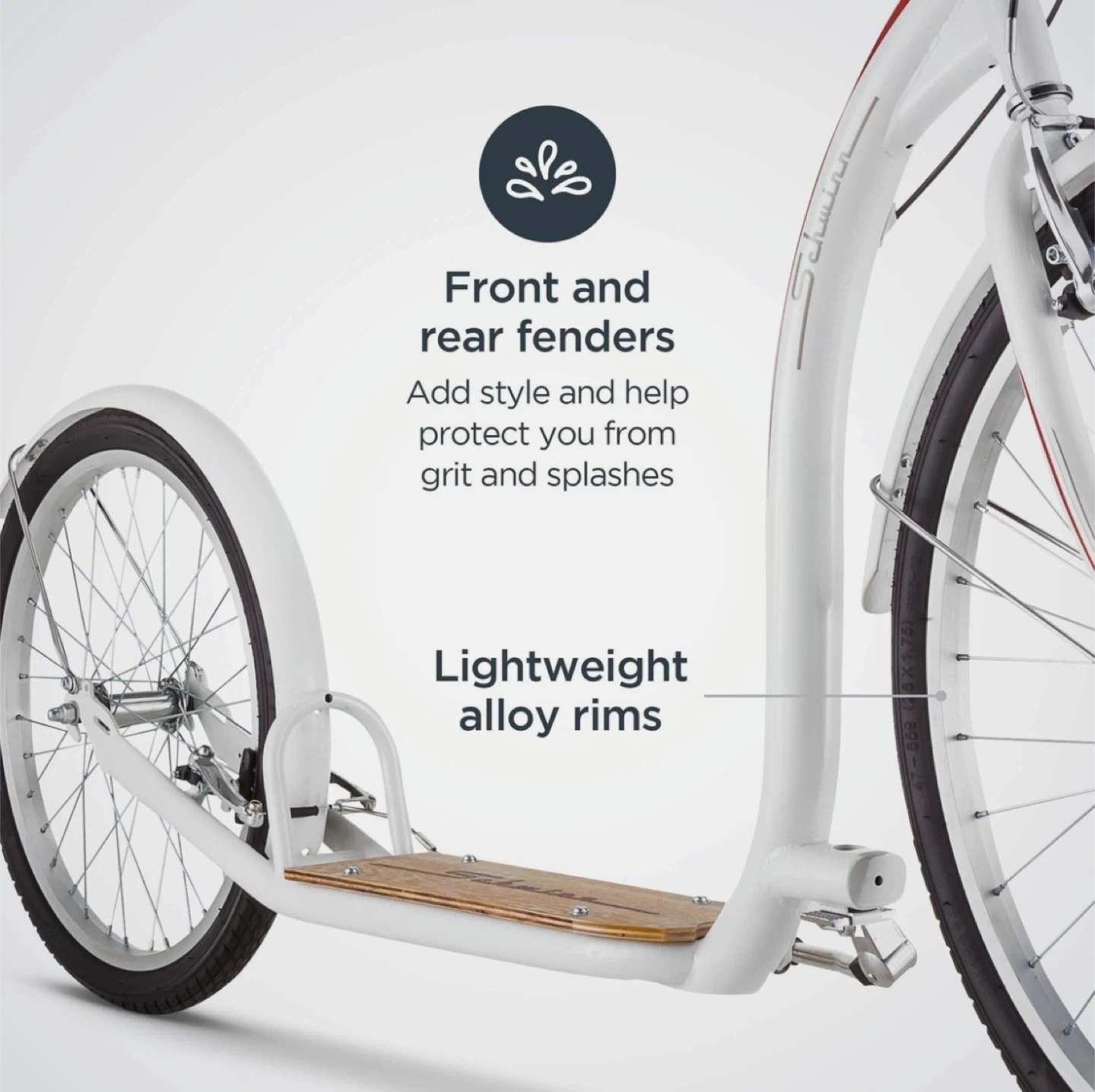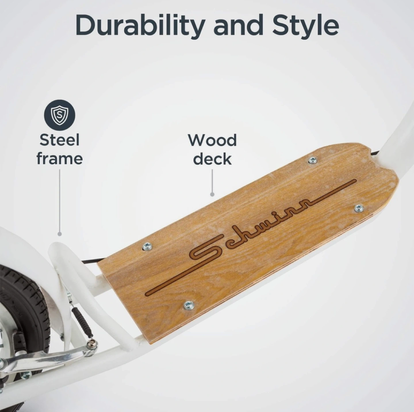 60Get ready to cruise around town with this Schwinn Adult Shuffle Scooter! It features: -Customized electric scooter I added for speed but it can be removed - Front and rear fenders to keep you clean - Lightweight alloy rims - Durable steel frame - Stylish wood deck - Front and rear linear pull brakes for stopping power