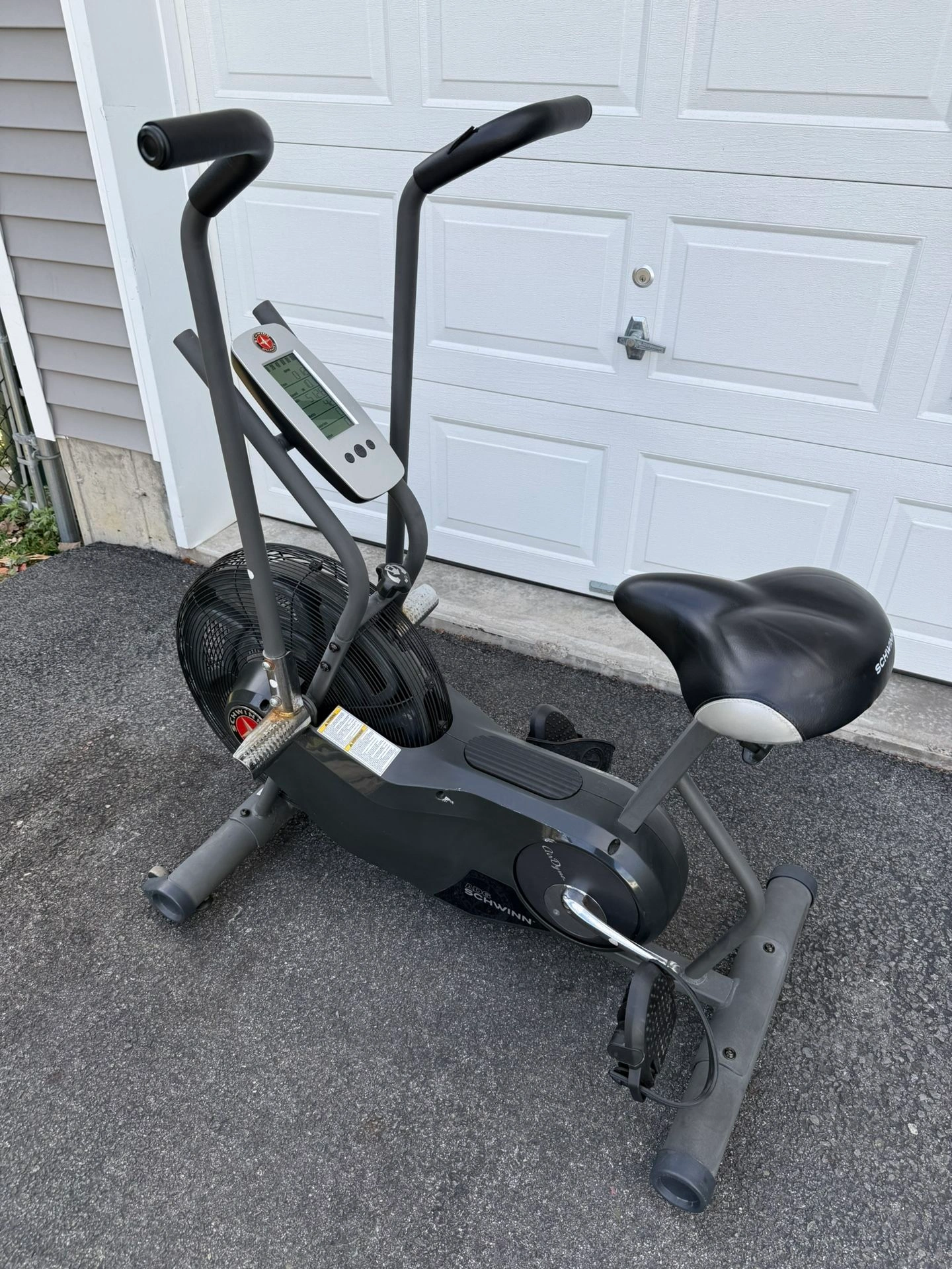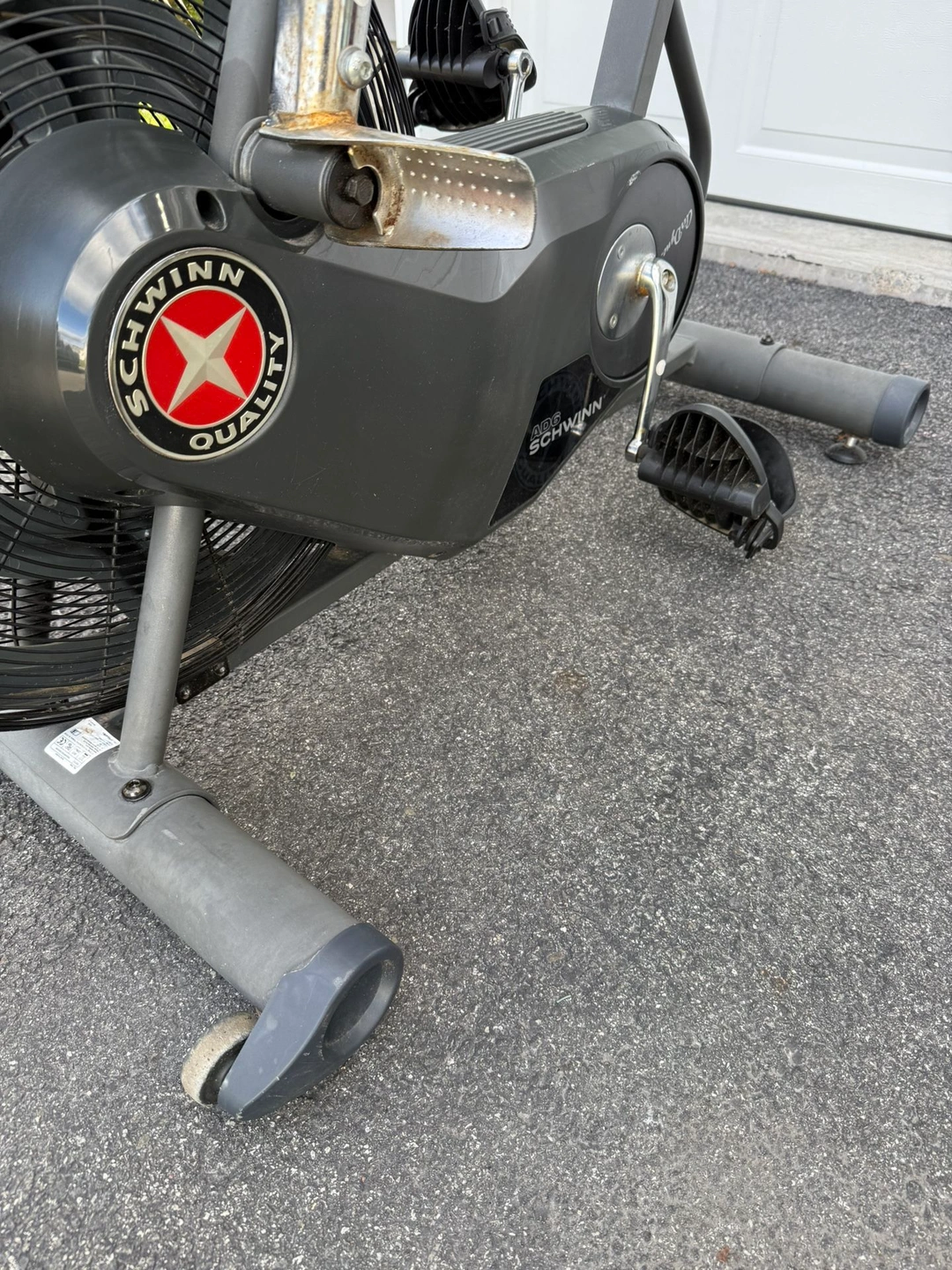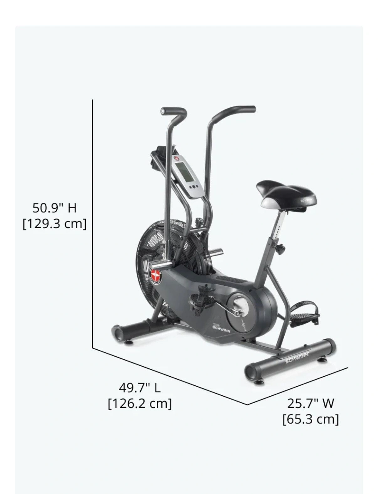 15Open to Offers! I’m selling for a friend. The Schwinn Airdyne AD6 is belt driven like the Rogue Echo Bike, so it requires less maintenance and operates just like the Rogue bike would, just not as heavy and has a smaller footprint. This bike is used, but operates like it should. Brand new batteries and the monitor works. Seat pad is in excellent condition. Brand: Schwinn Resistance: Air