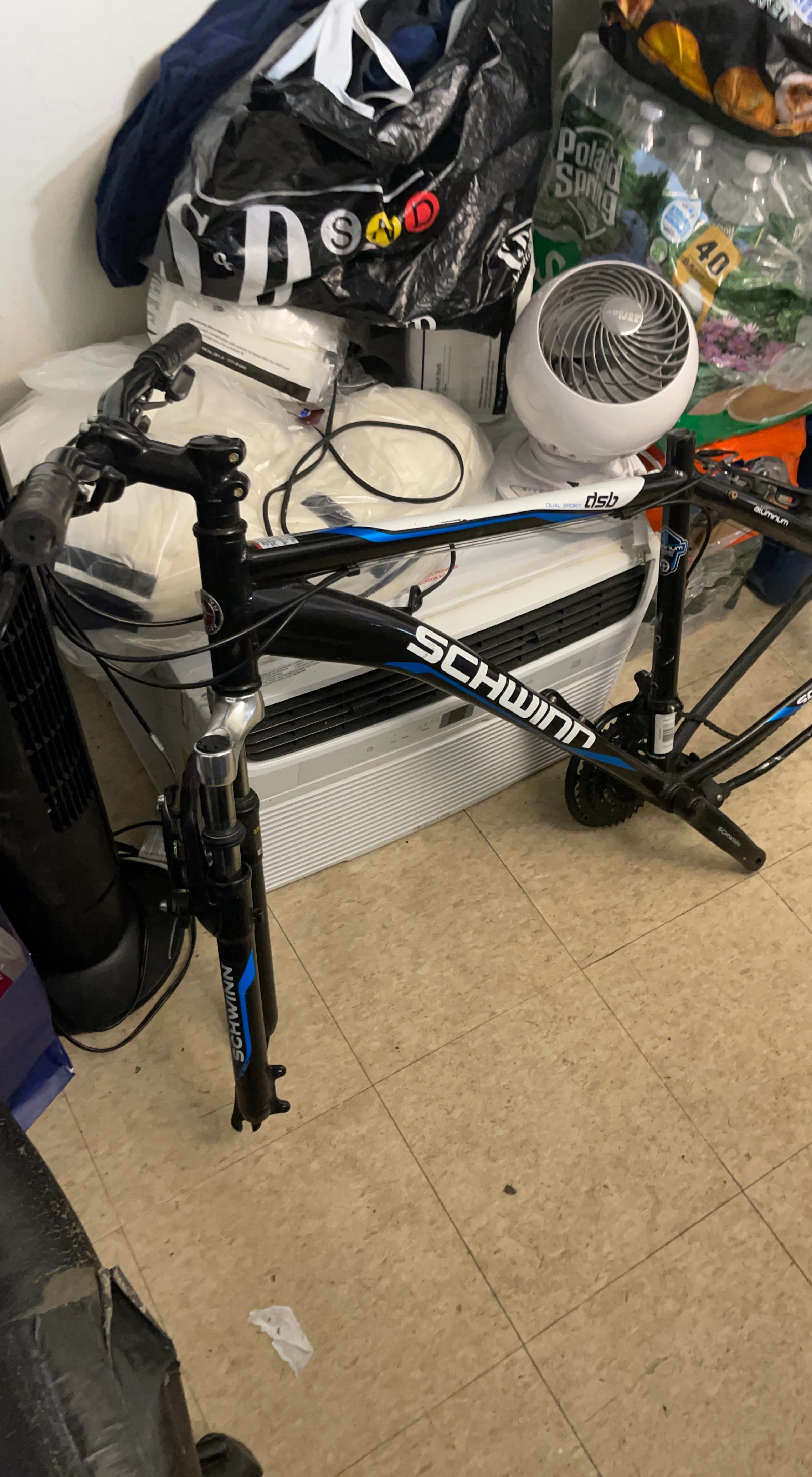 Selling a Schwinn bicycle frame in black and blue. It looks like it could be a fun project for someone who enjoys fixing up bikes!