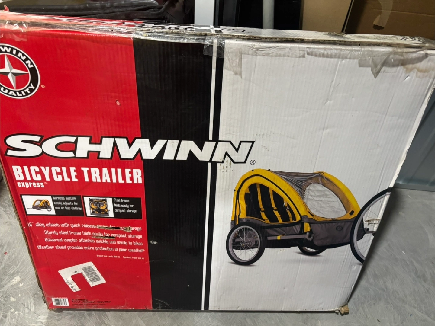 Selling a Schwinn Bicycle Trailer Express! It features a harness system that easily adjusts for one or two children. The steel frame folds easily for compact storage. Also has 16" alloy wheels with quick release. Sturdy steel frame folds easily for compact storage. Universal coupler attaches quickly and easily to bikes. Weather shield provides extra protection in poor weather