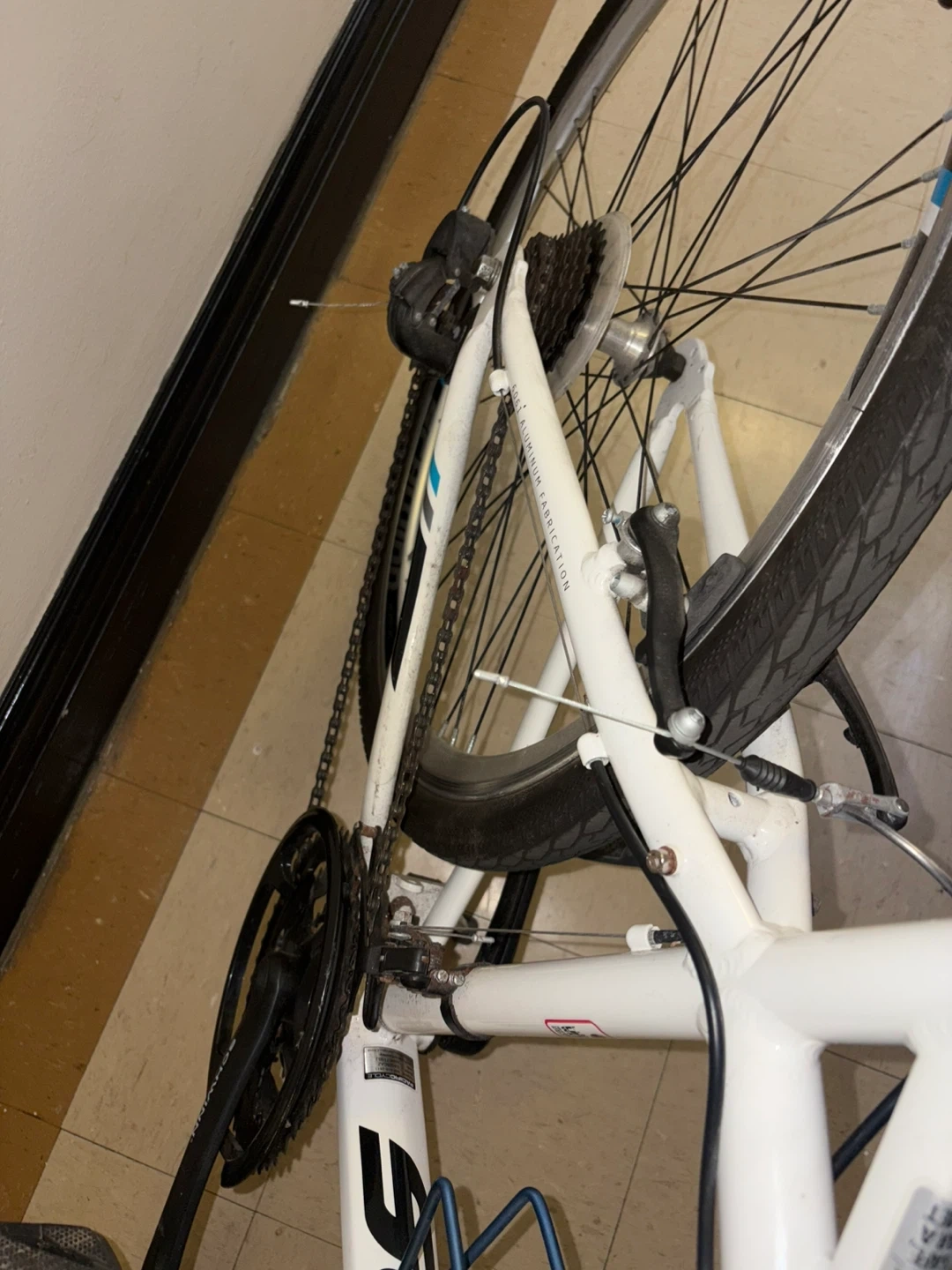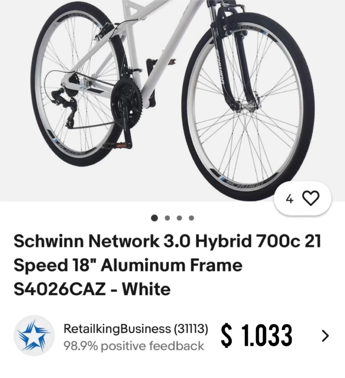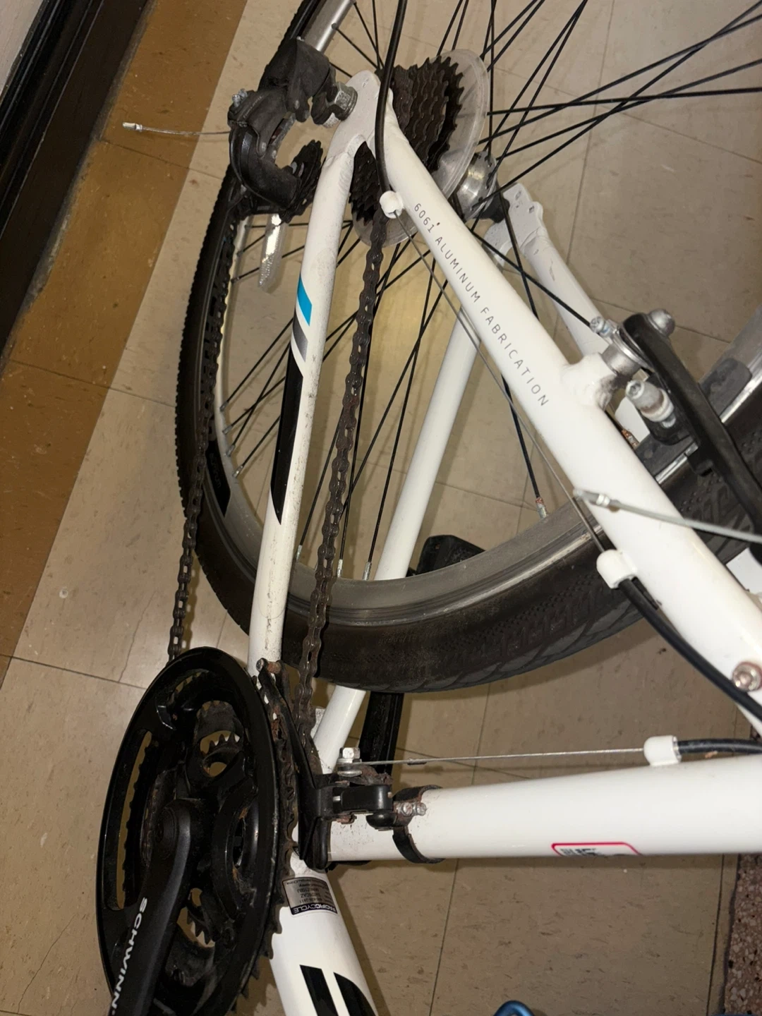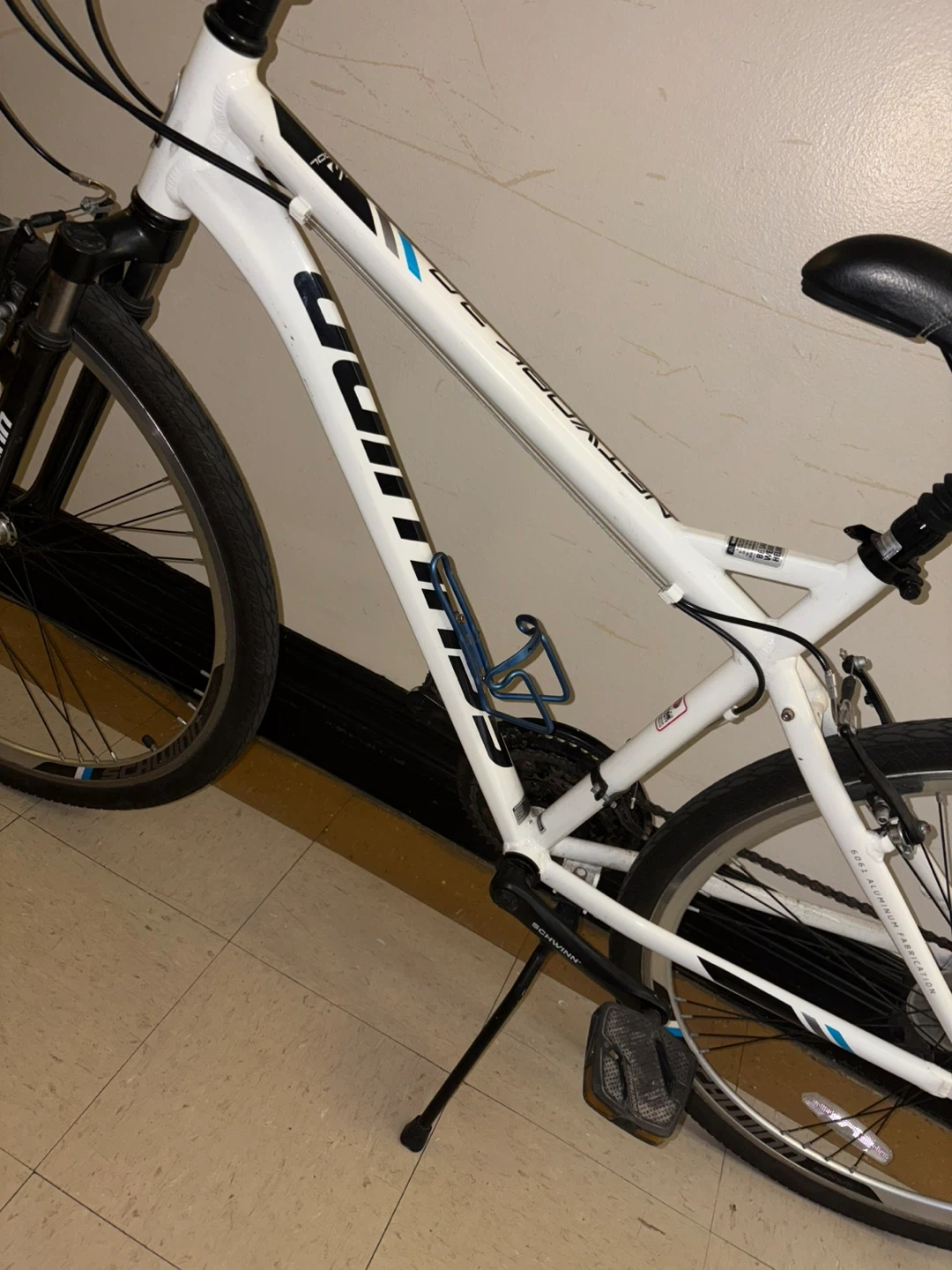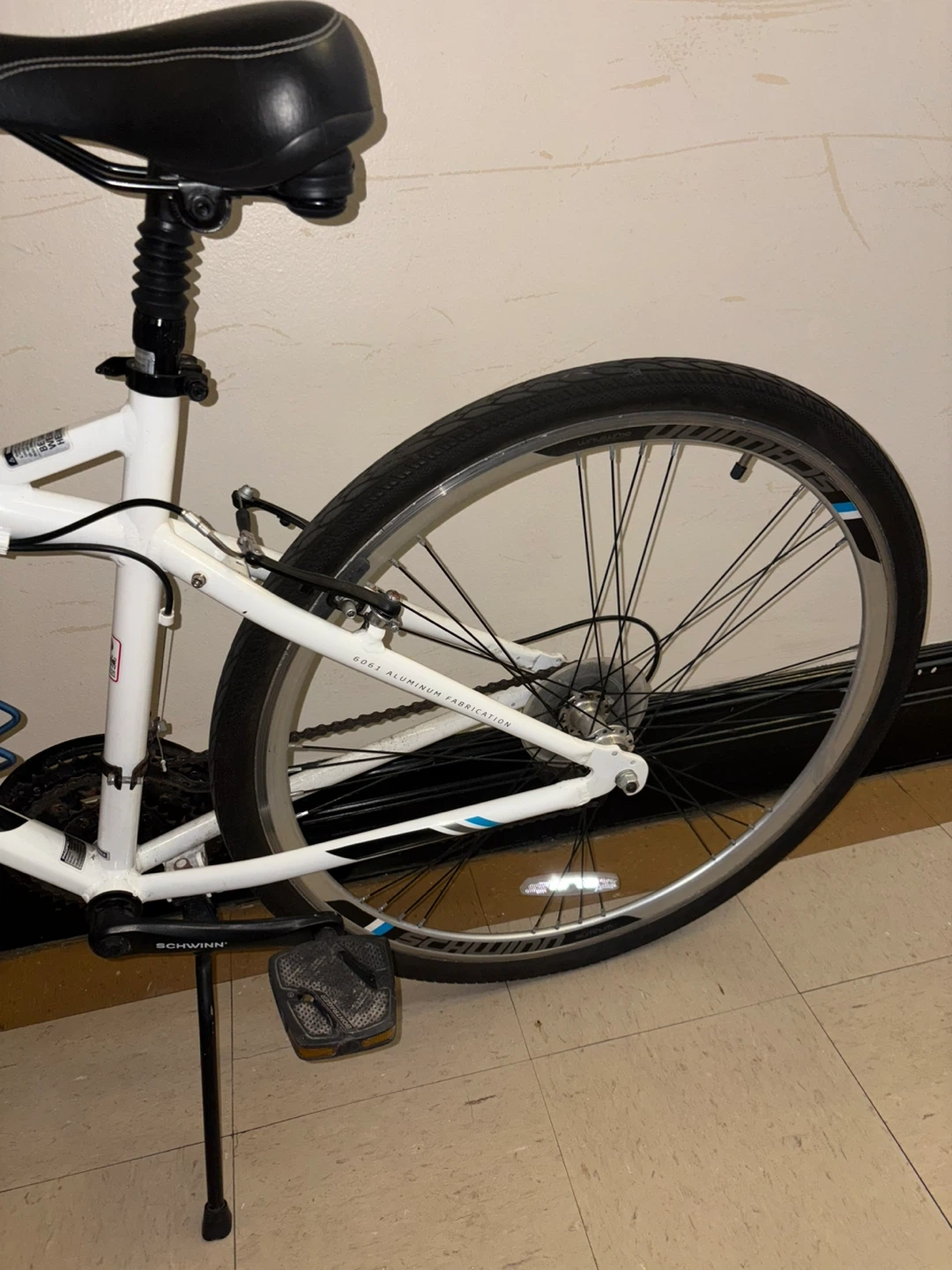 Schwinn Network 3.0 Hybrid 700c 21-Speed 18" Aluminum Frame - White. Purchased June 2025. In specialized stores it goes for $1033. Only used 2 hours and practically new. No time wasters.Schwinn Network 3.0 Hybrid 700c 21 Speed 18" Aluminum Frame -White • Enjoy a smooth and efficient ride with the 18-inch alloy hybrid frame, with 28-inch wheels that fit riders 5'4" and 6'2" in height • Fast and accurate gear changes with the 21-speed twist shifters and rear derailleur • Superior stopping power with alloy linear pull brakes, and strong and lightweight alloy rims • Suspension seat post with a hybrid saddle and ergonomic grips provide a comfortable ride • Arrives 80% assembled, tools required: Philips head screwdriver, Allen wrench 4-8mm, adjustable wrench, pair of pliers with cable cutting ability