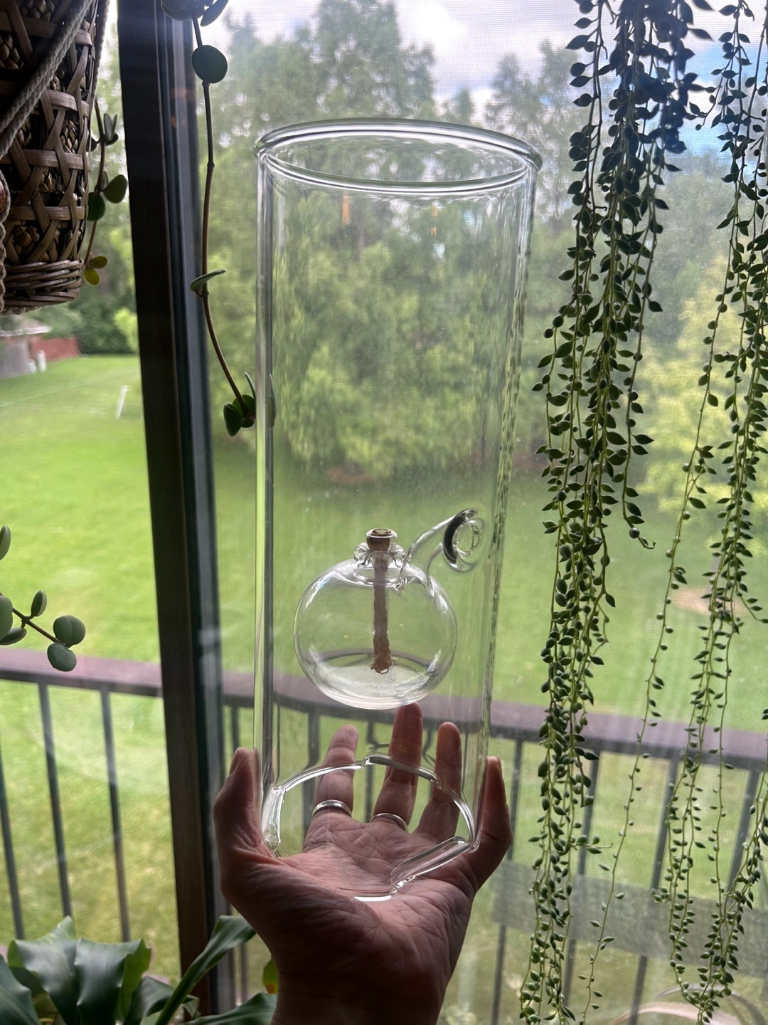 Selling a unique wolford hand blown scientific glass cylinder oil lamp! It's in great condition and ready to add a touch of elegance to your space. The design features a cylindrical glass container with an oil reservoir and wick holder inside. It's a beautiful piece for creating a warm and inviting atmosphere