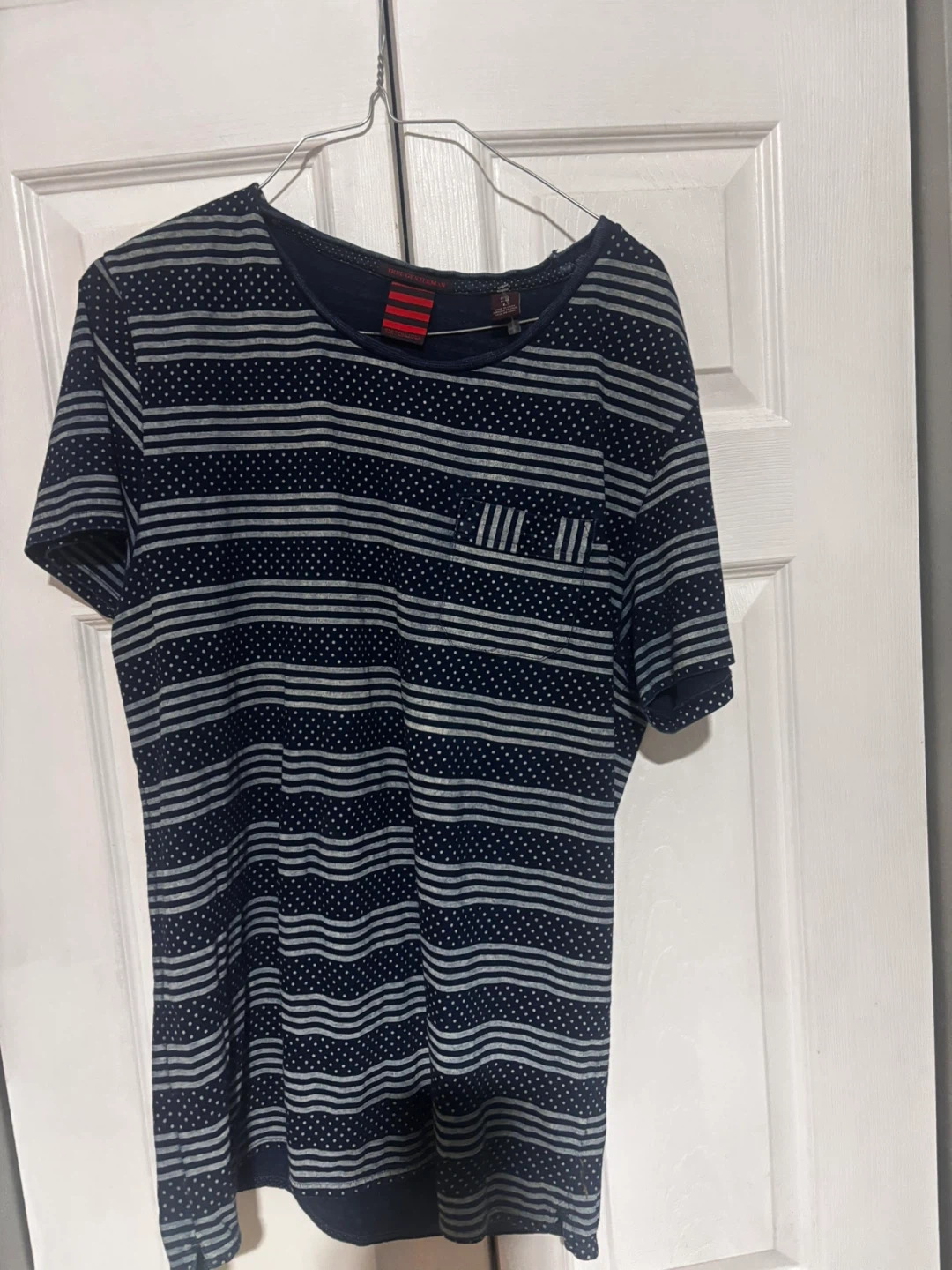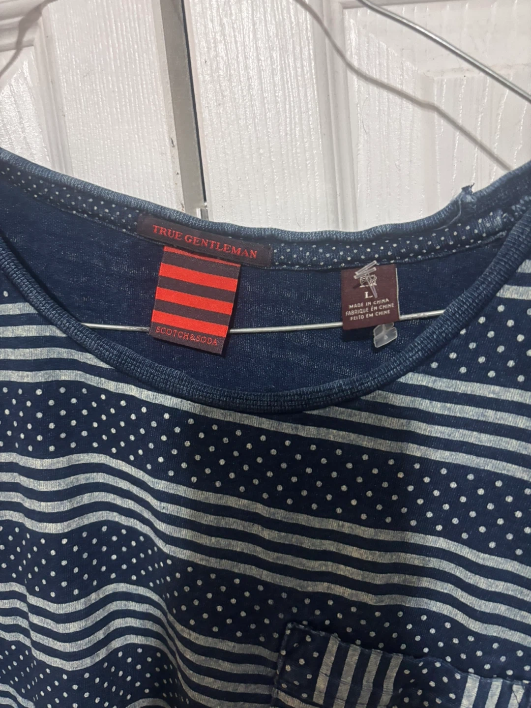 Selling a Scotch & Soda t-shirt from their True Gentleman line. It's a size large and features a unique striped and dotted design. Great for casual wear!