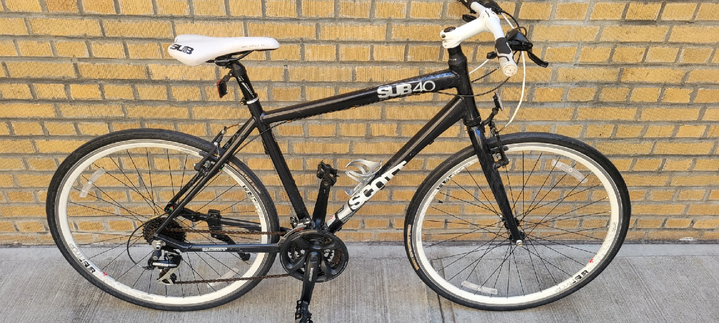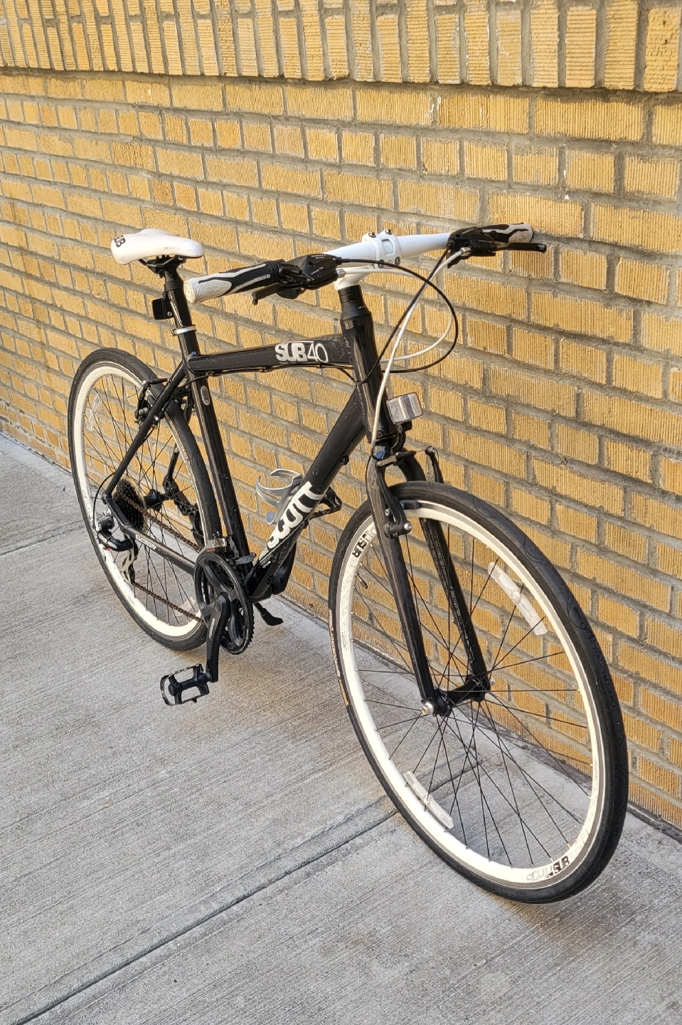 Selling a Scott SUB 40 hybrid bike in black. It's in good condition and ready for a new owner! Perfect for commuting or leisurely rides around town newly tuned up by mechanic everything is working perfectly comes complete with a water bottle holder and good kickstand