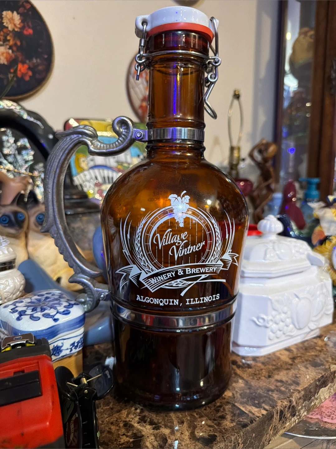 Amber glass bottle from Village Vintner Winery & Brewery in Algonquin, Illinois. It features a metal handle and a flip-top lid. This bottle is great for display or storage of beverages.