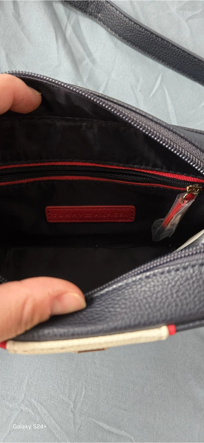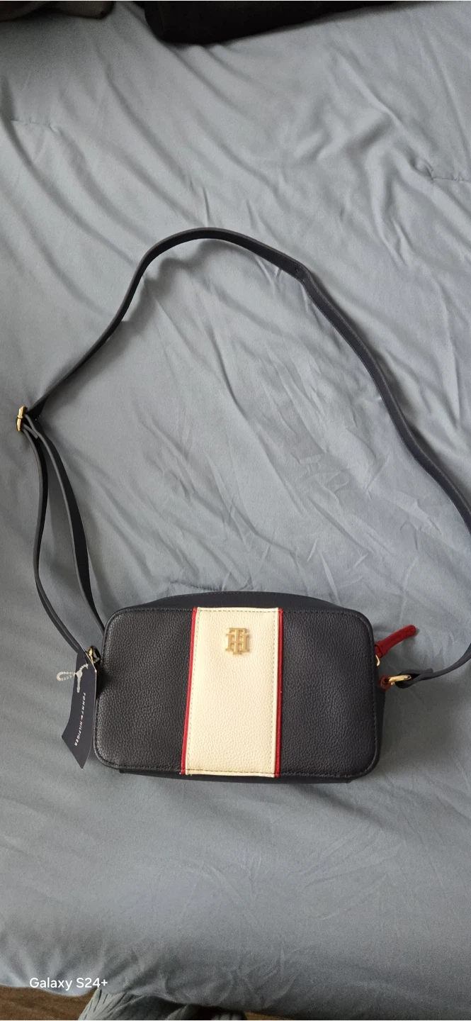 This is a Tommy Hilfiger camera bag with a navy, cream, and red stripe design. It features a zip closure and an adjustable strap. The interior has a zip pocket and a brand tag.
