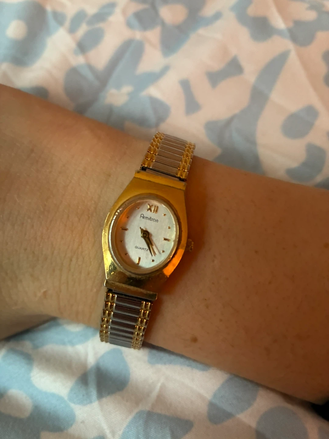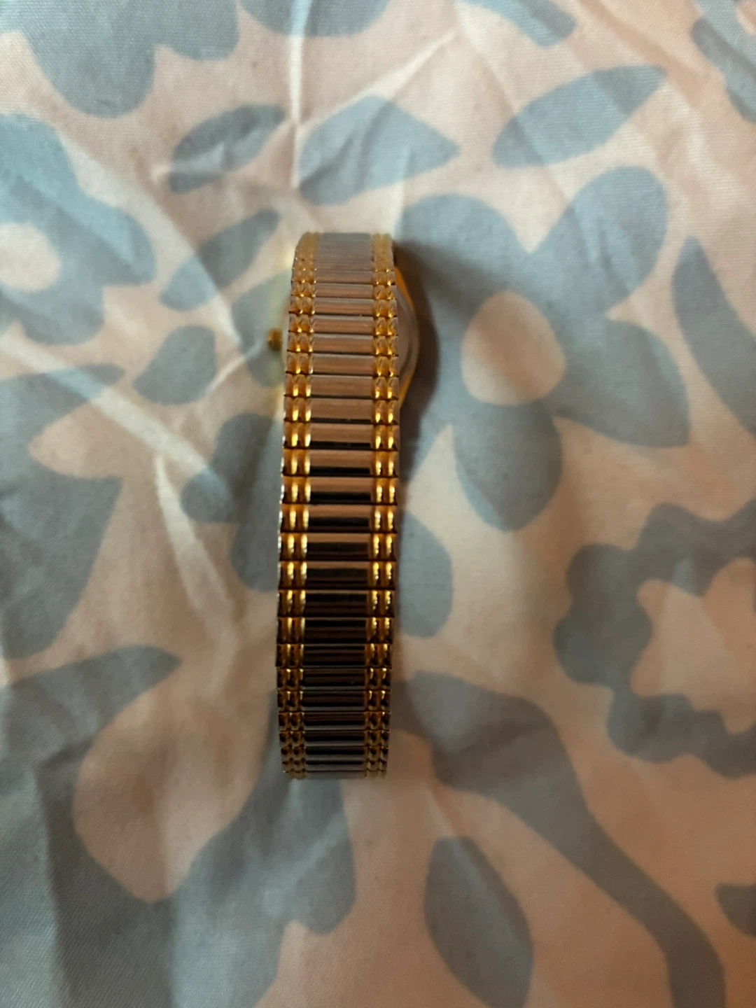 This is an Armitron quartz watch with a gold and silver tone band. It features a classic white dial with Roman numeral XII. The band is a stretch style for easy wear. It's a reliable timepiece for everyday use! Also, it’s stretchable!
