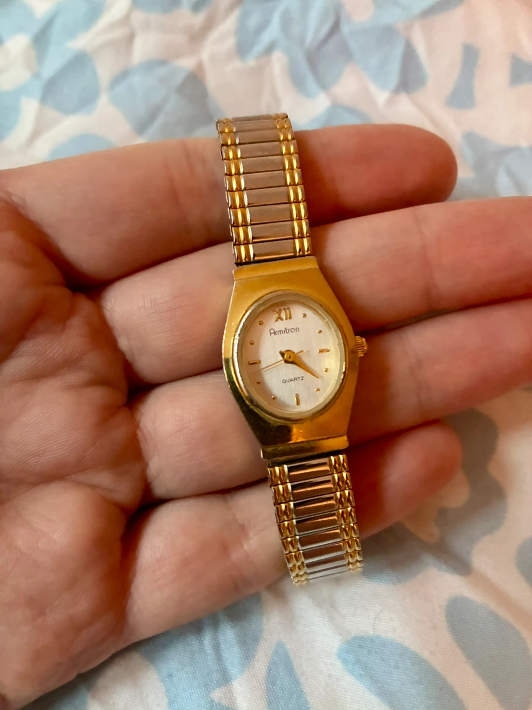 This is an Armitron quartz watch with a gold and silver tone band. It features a classic white dial with Roman numeral XII. The band is a stretch style for easy wear. It's a reliable timepiece for everyday use! Also, it’s stretchable!