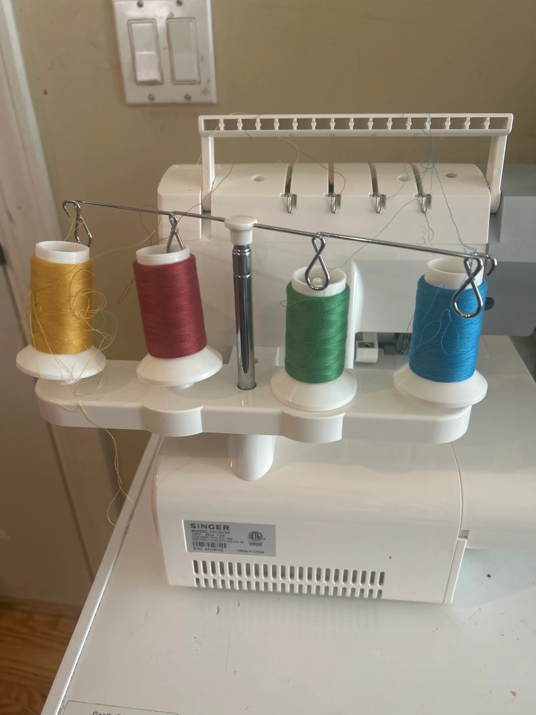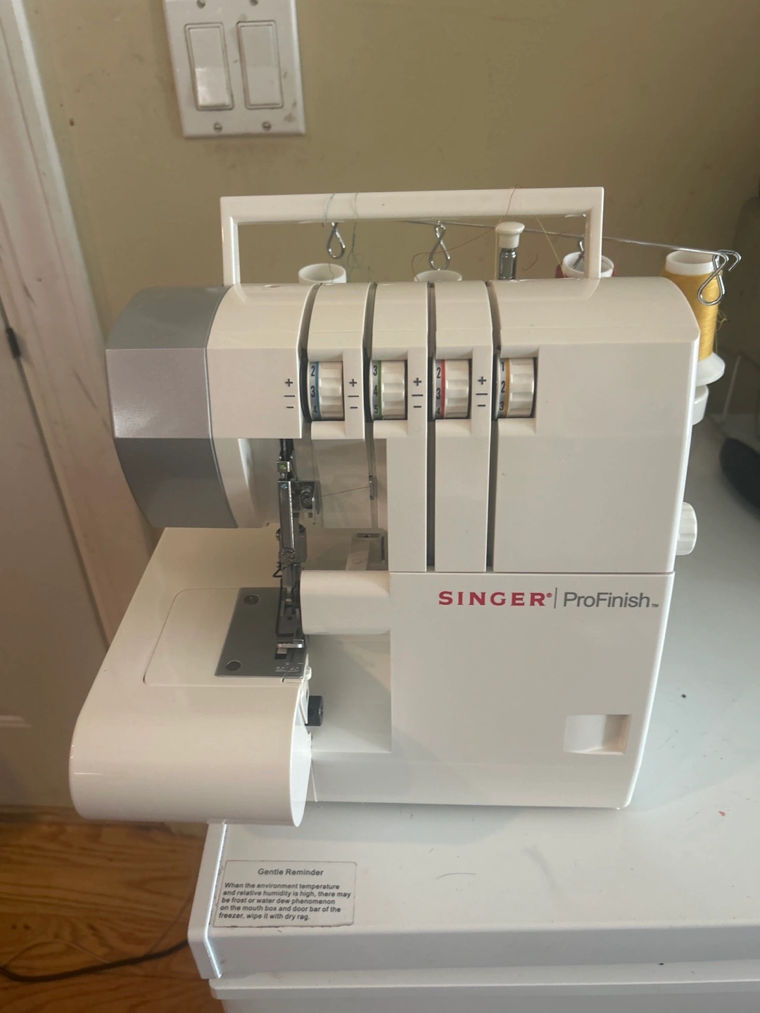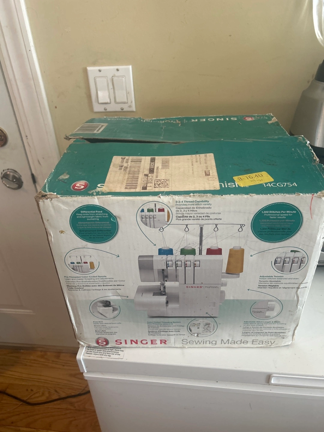 Selling a SINGER ProFinish 14CG754 serger. This serger offers unlimited versatility for professional results. It features 2-3-4 thread capability, providing more stitch variety. The differential feed eliminates stretching and puckering. It also has 4 built-in rolled hems, offering more hem options, especially for lightweight fabrics. Comes with the original box. Has only been used twice