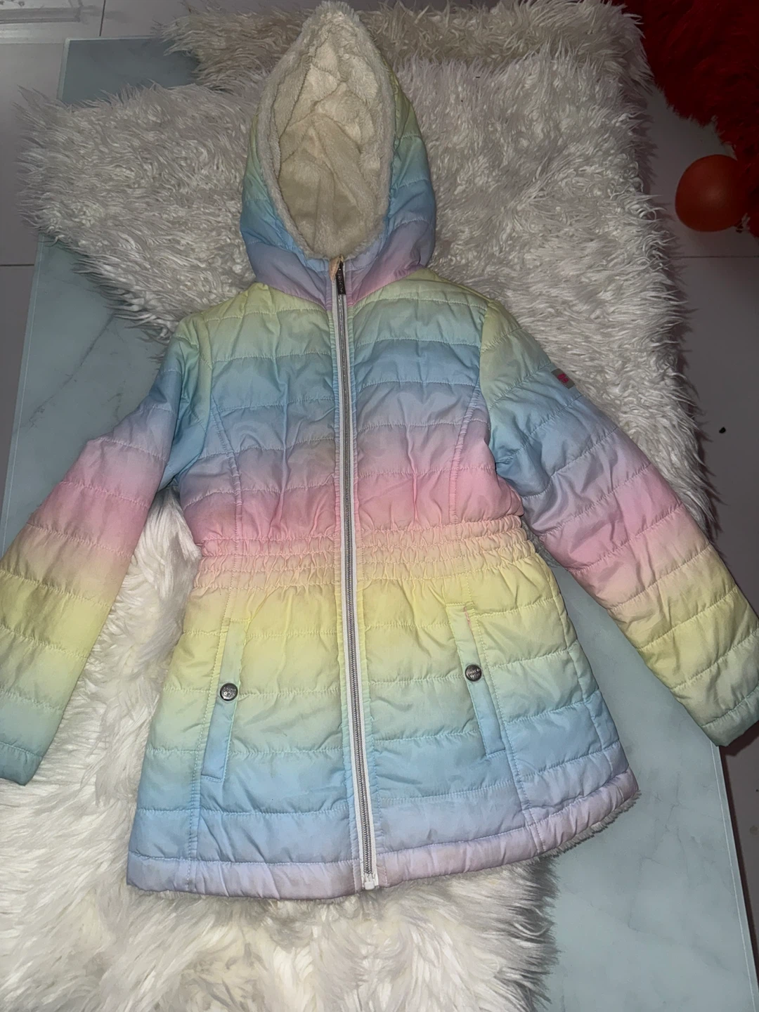 I'm selling a Limited Too girls' puffer jacket in size 7/8. It features a colorful rainbow ombre design and a cozy, soft lining. Perfect for keeping your little one warm and stylish!