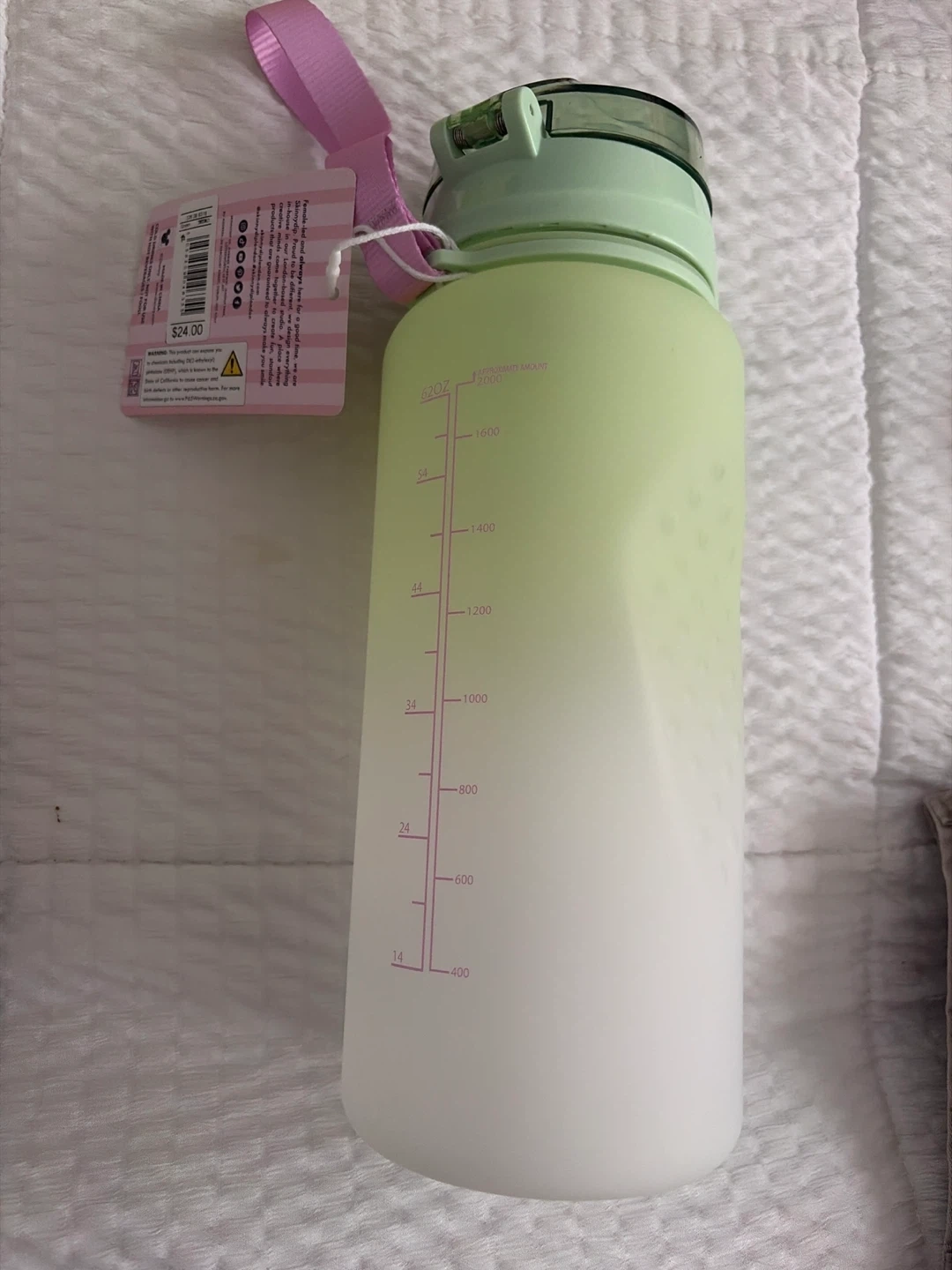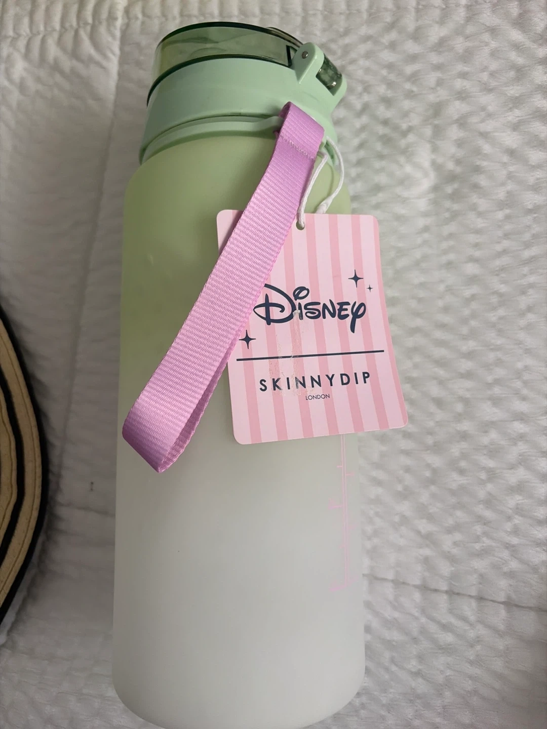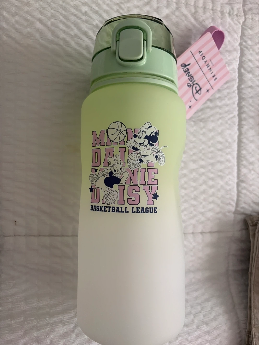 This Skinnydip x Disney water bottle features Minnie and Daisy in a basketball league design. It has measurement markings up to 32oz and includes a pink carrying strap. Great for staying hydrated on the go!