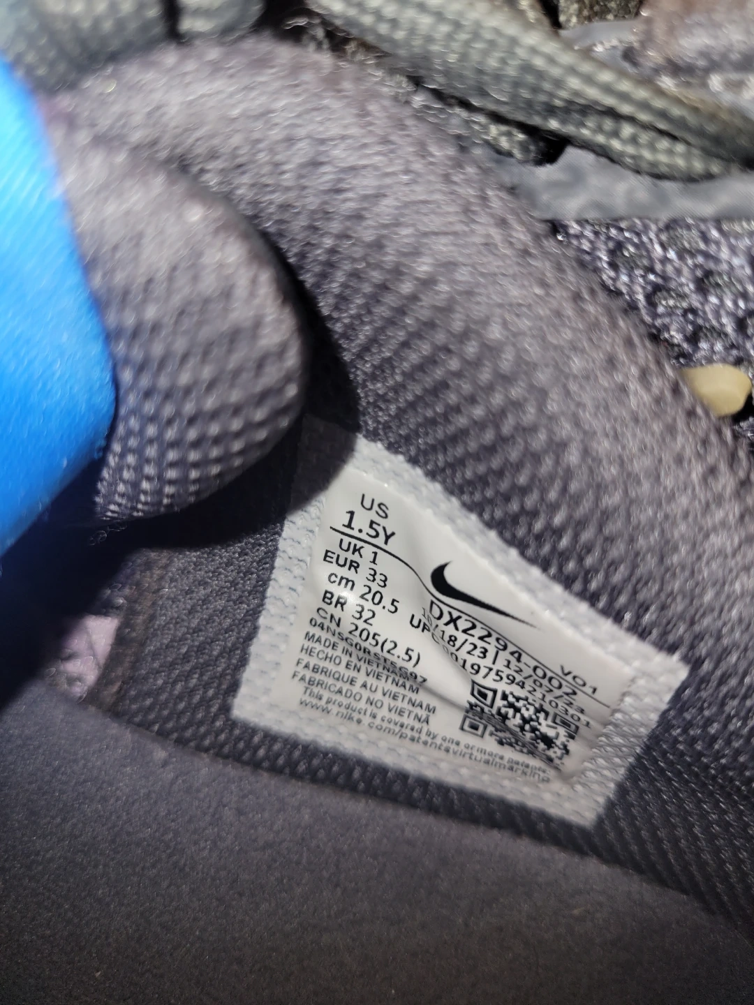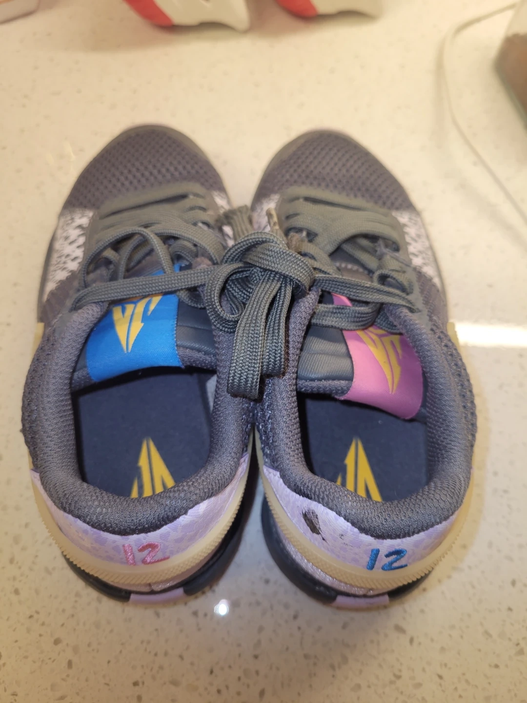 These Nike Kyrie Low basketball shoes are in youth size 1.5Y. They feature a grey mesh upper with accents of blue and pink on the tongue. The soles have '12' printed on them. Made in Vietnam.