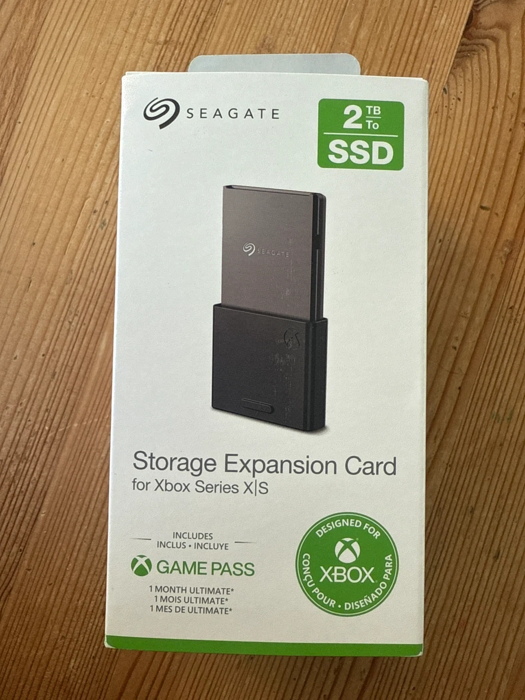 Selling a Seagate 2TB Storage Expansion Card for Xbox Series X|S. It's designed for Xbox and includes a full-speed add-on storage exclusively for Xbox Series X|S. The box includes the storage expansion card