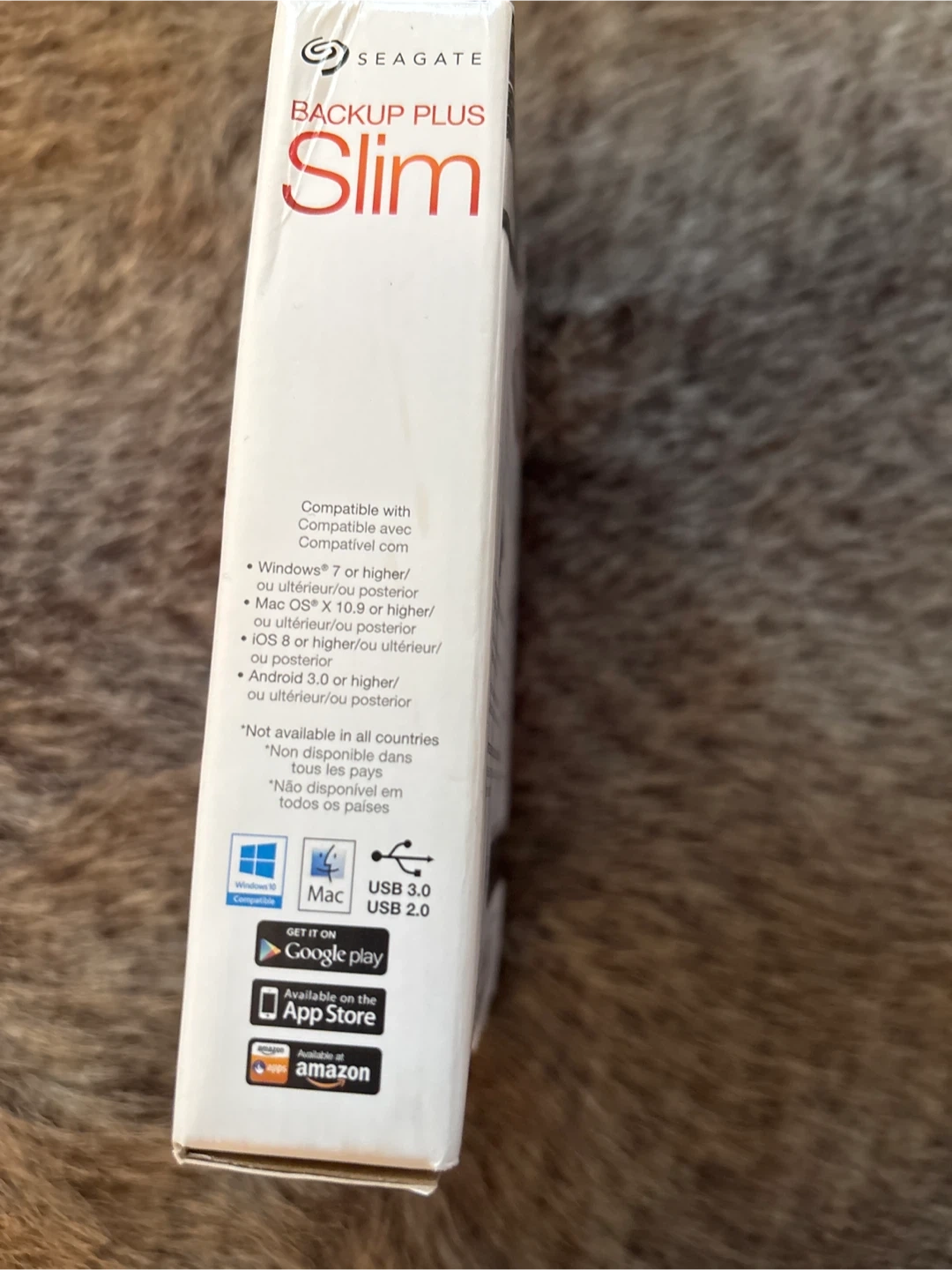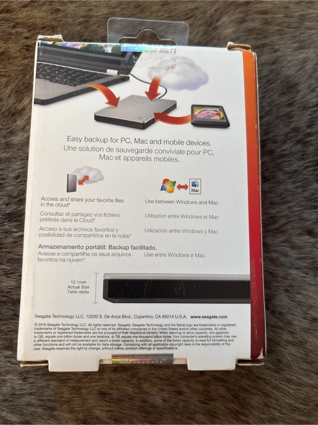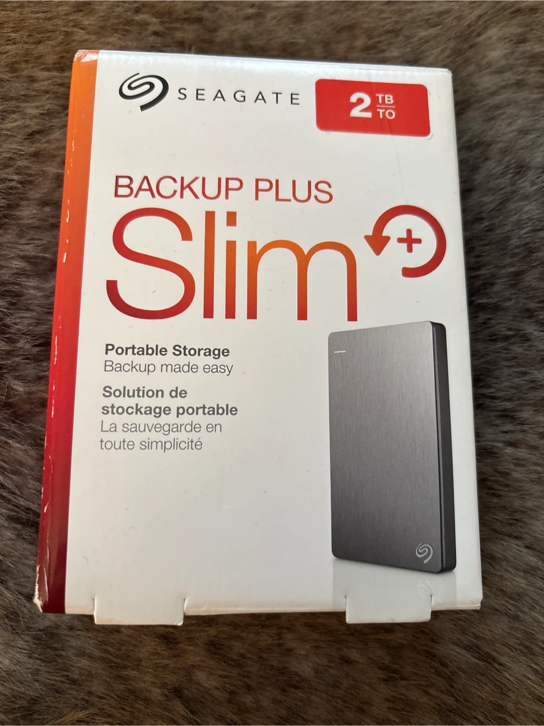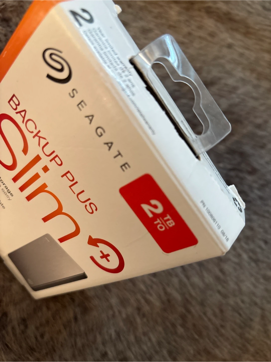 261Brand new Seagate Backup Plus Slim portable storage drive with 2TB of space! It's in great condition and comes with the box. It's easy to use for PC, Mac, and mobile devices. The actual size is 12.1mm, never opened.