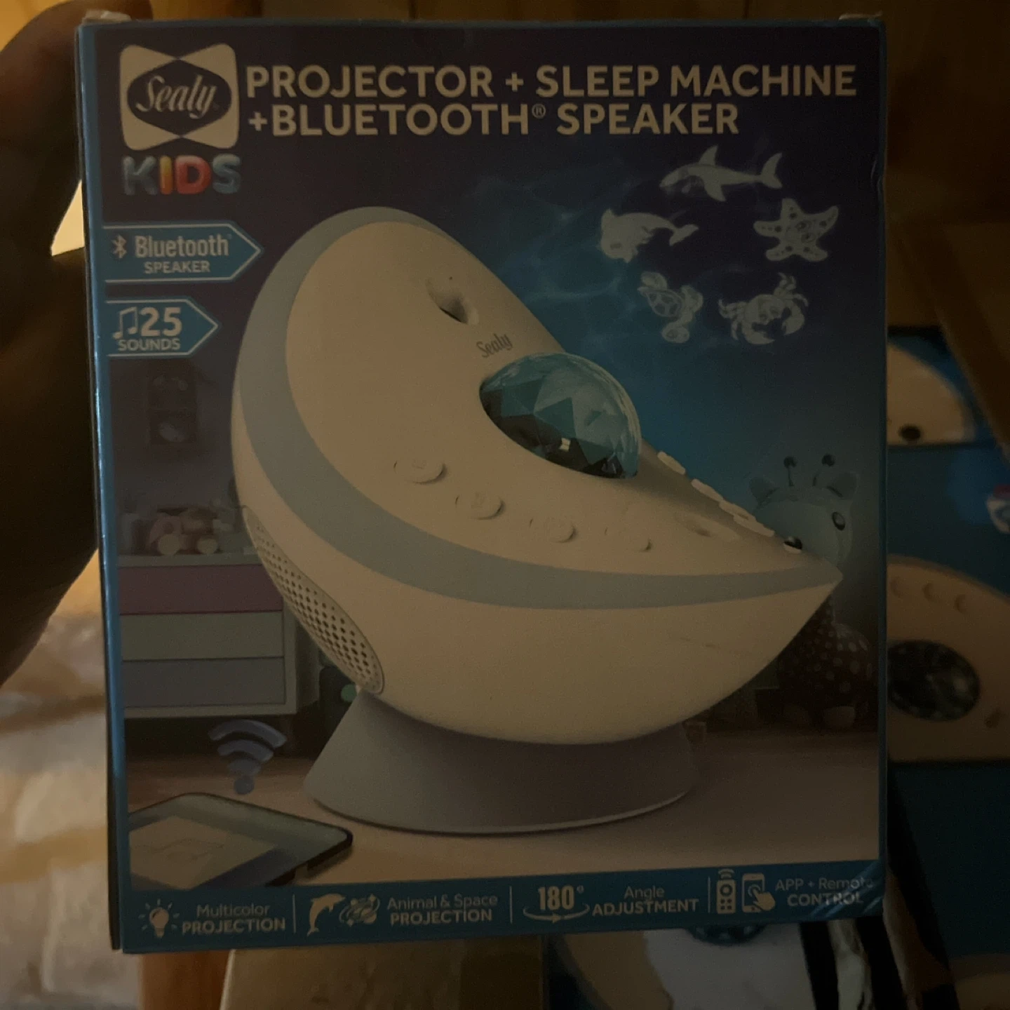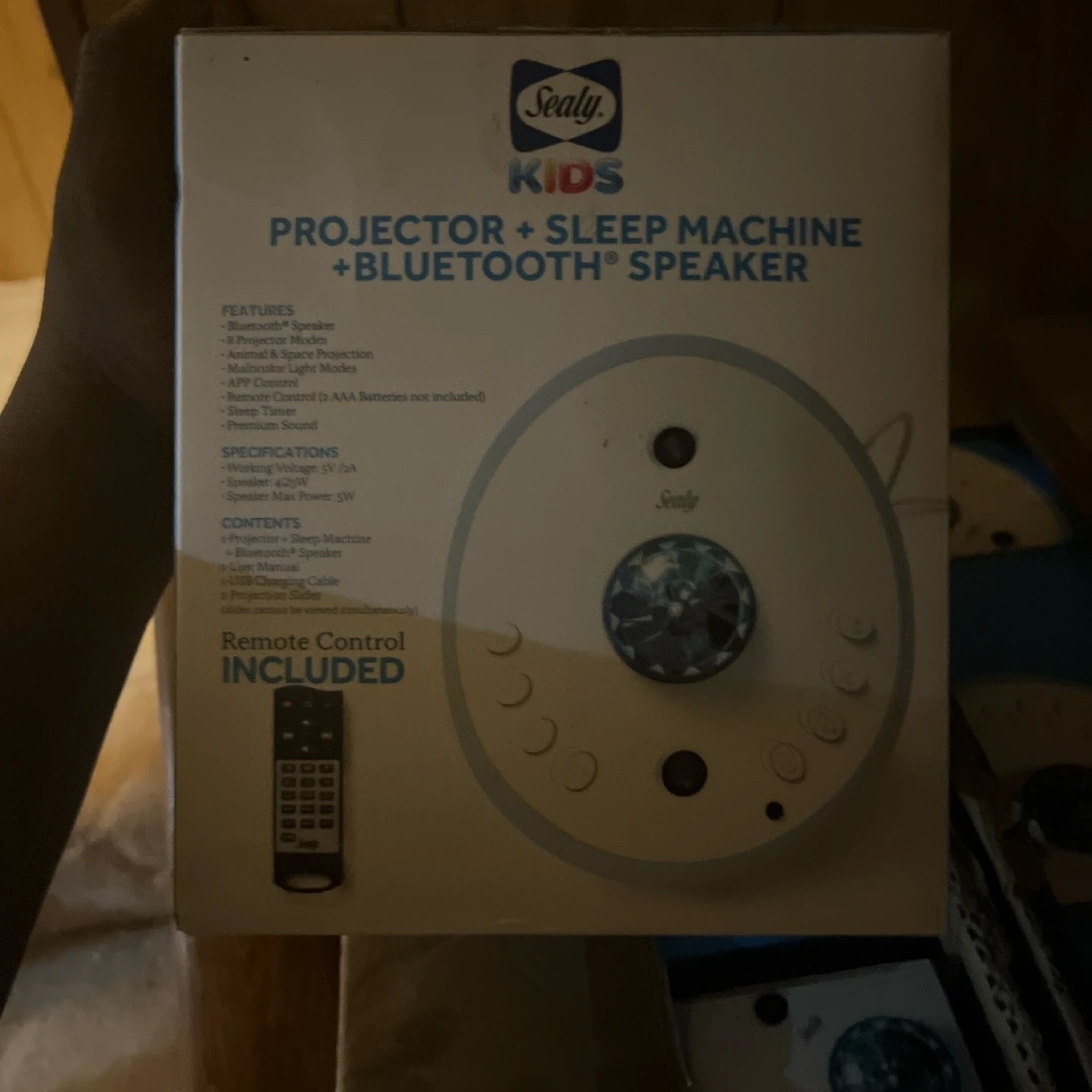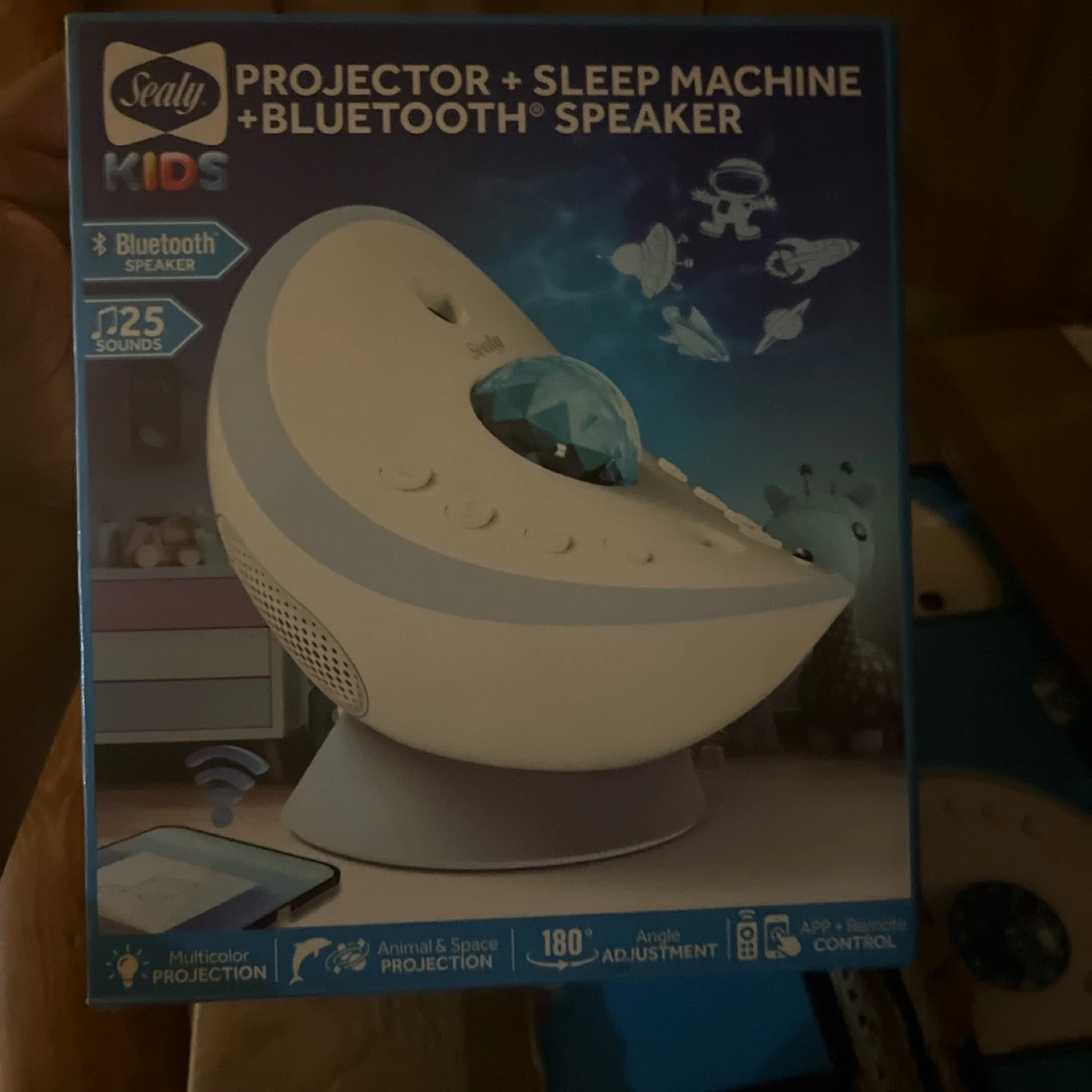 Selling a Sealy Kids Projector + Sleep Machine + Bluetooth Speaker! It comes with: - Bluetooth speaker - 25 sounds - Multicolor projection - Animal & Space Projection - 180° Angle Adjustment - App & Remote Control Remote control included!