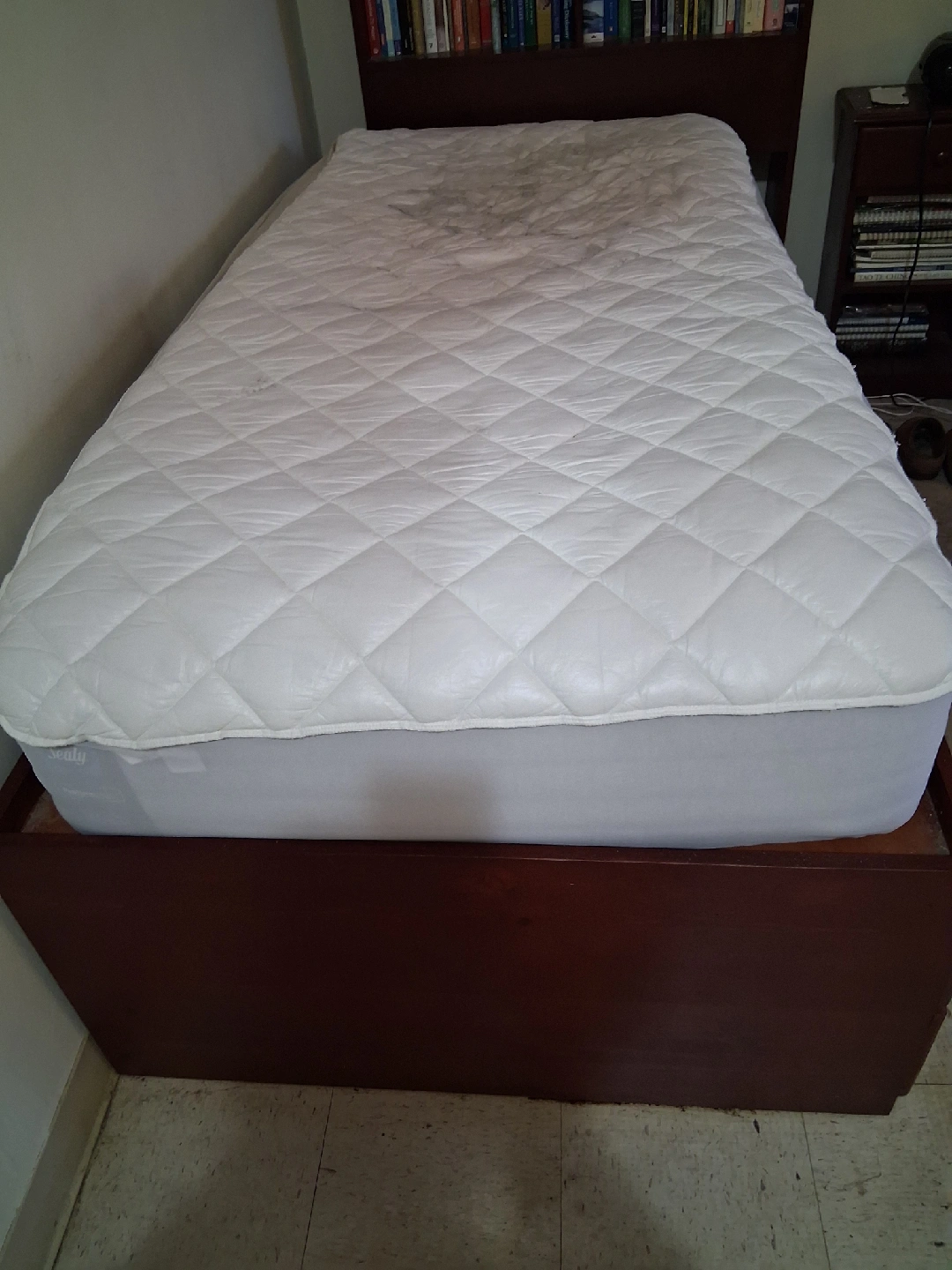 70Selling a twin-size Sealy mattress along with a wooden bed frame that has built-in storage. The bed frame features several drawers and cabinets, perfect for keeping things organized. The mattress and frame are in good condition and ready for a new home