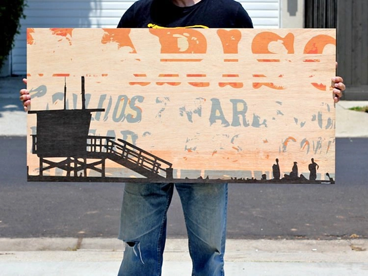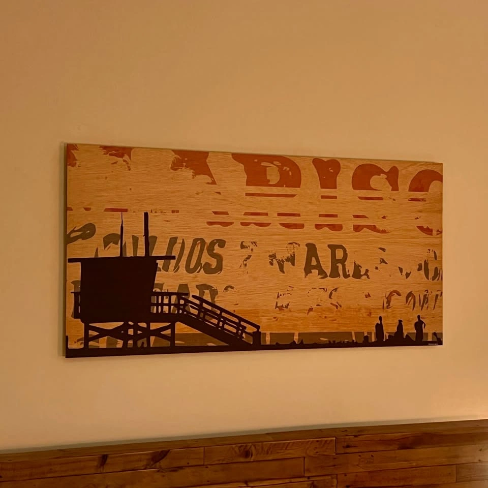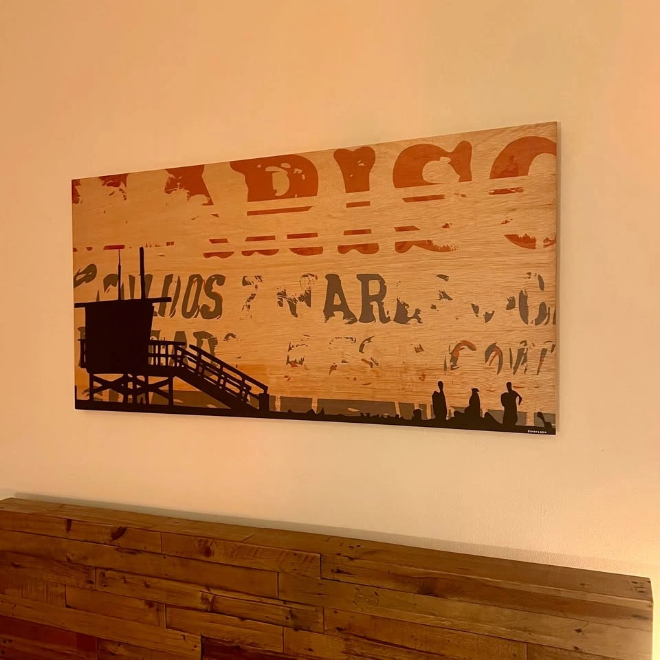 For sale: signed, one-of-a-kind original artwork by California artist Sean Finocchio (33stew). Dimensions: 24” x 48” Condition: Excellent, ready to hang Retail Price: $550 This striking piece features a lifeguard tower silhouette and layered typography, capturing the energy and culture of the California coast. The natural wood grain adds warmth and texture, making it a bold statement piece for modern spaces, lofts, or studios. This is one of Sean Finocchio’s rare larger works, originally shipped from California, making it a unique find here in New York City. You can see more of the artist’s work at 33stew.com Available for pickup in Hell's Kitchen, Manhattan – message me with questions or to schedule a time to see it!