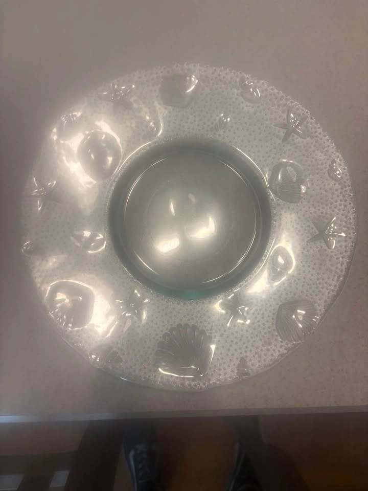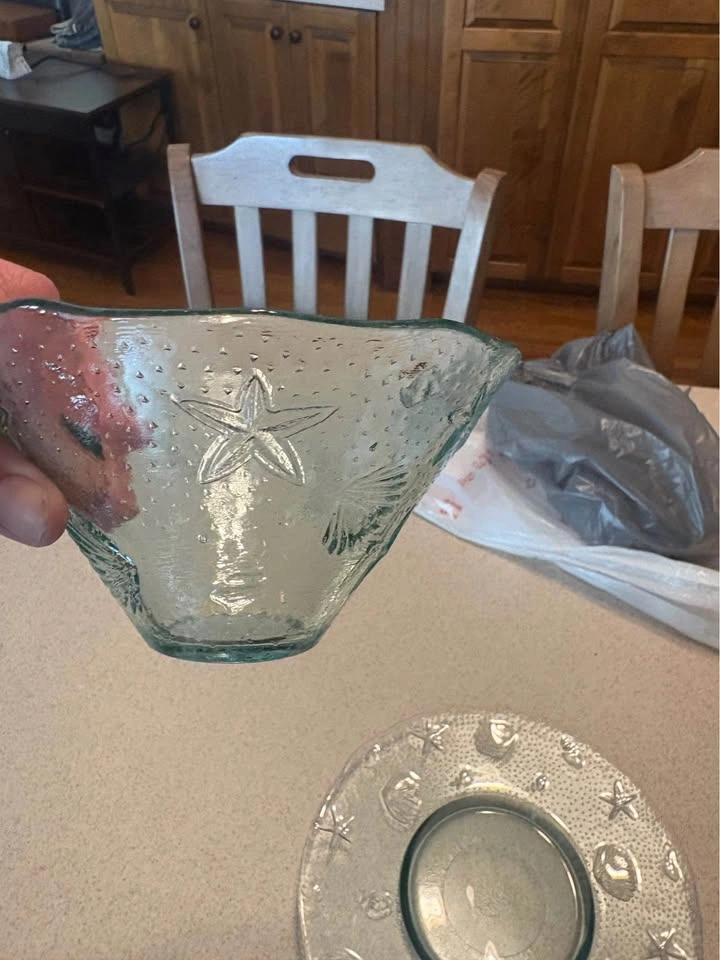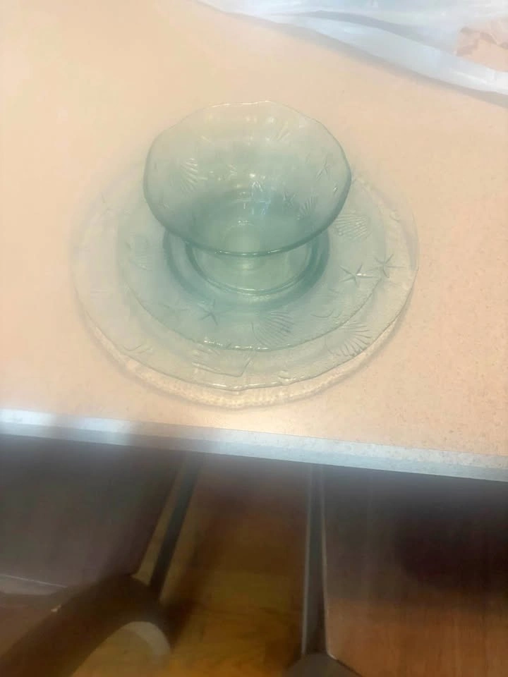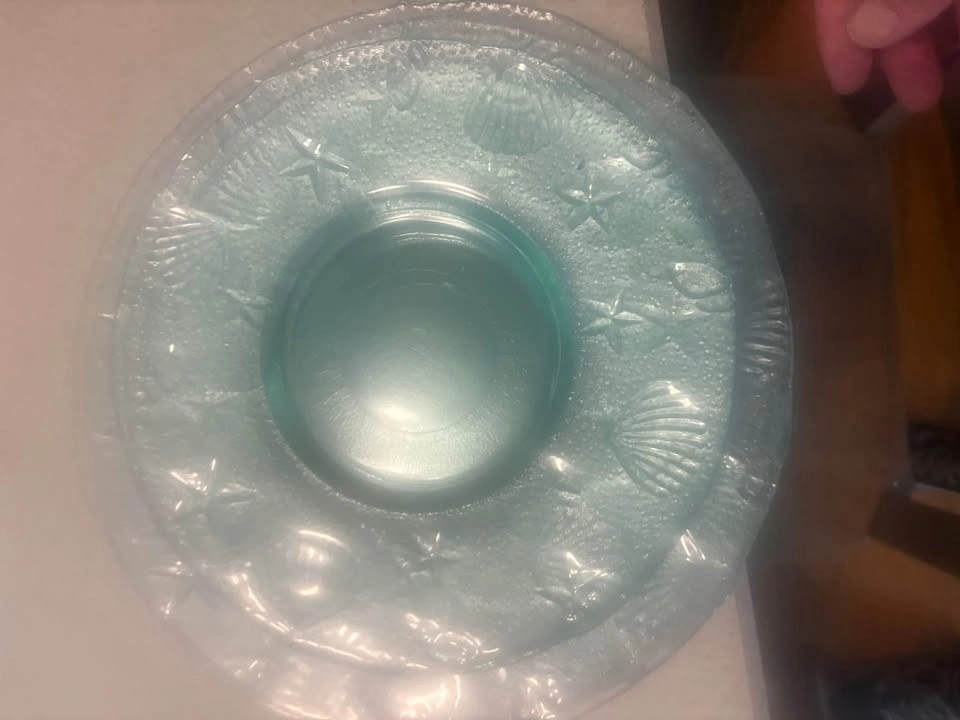 Almost new seashell dishes set. Used the bowls once I think. Comes with four bowls, 4 small plates, 4 big plates. Clear green color. Great condition because they never really have been used.