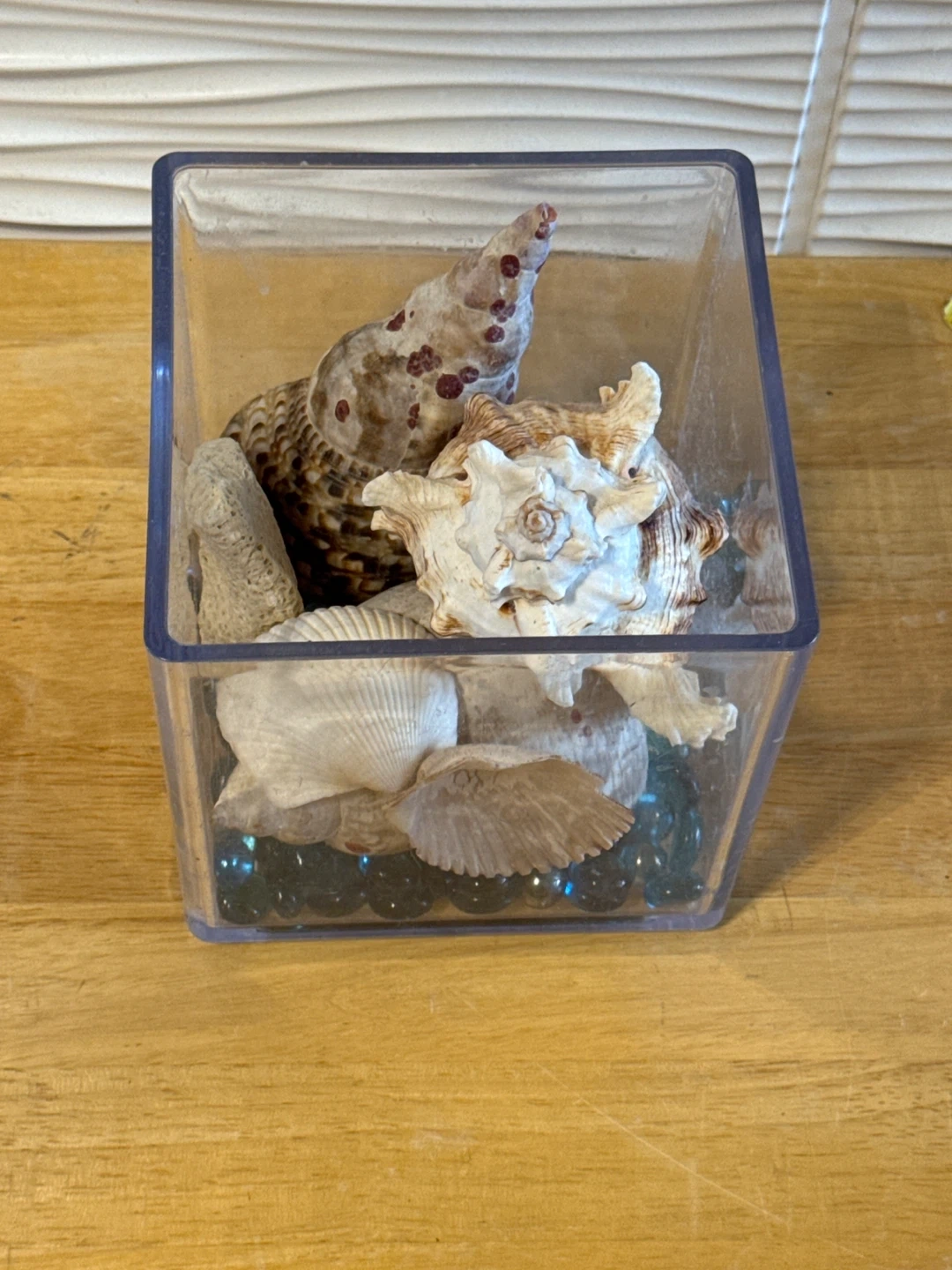 A collection of seashells arranged in a clear plastic box. Perfect for adding a touch of the beach to your home decor
