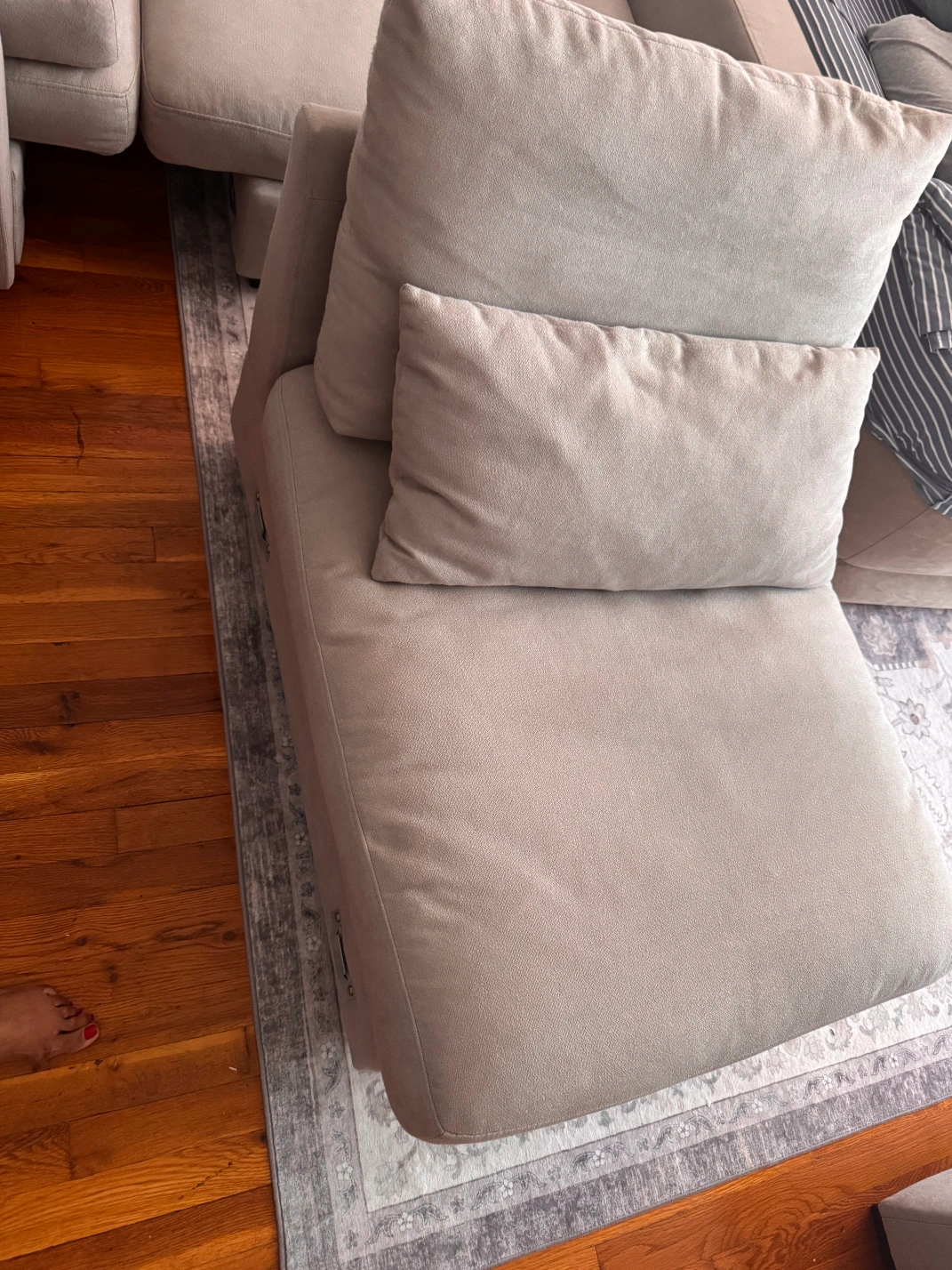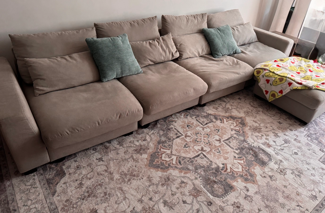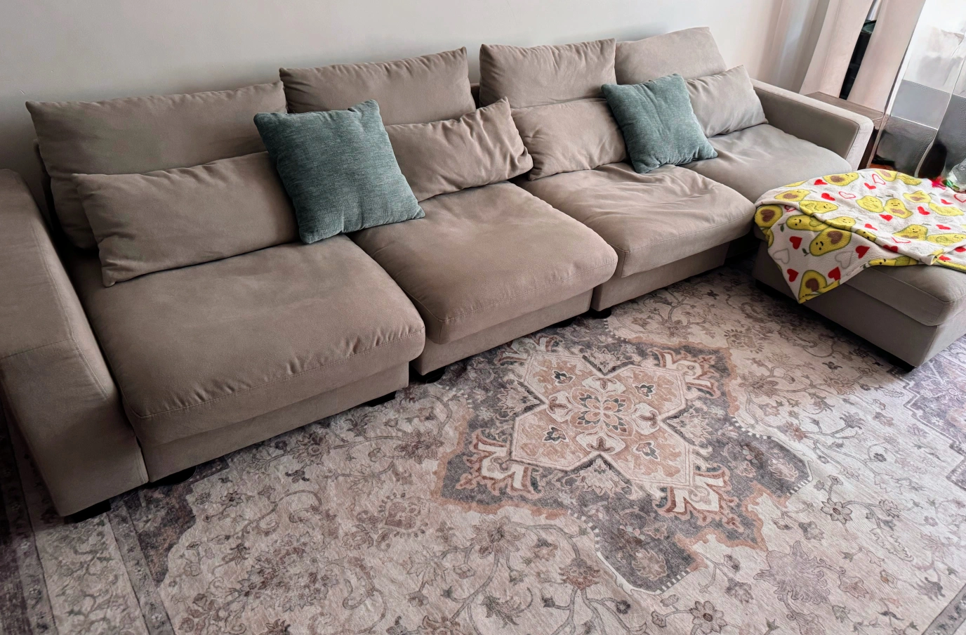 130" sectional Sofa couch for living room, large 4 seat L-Shape modern sofa couch with convertible ottoman, feather filled reversible sofa couch with waist pillows, light grey. One year old and must pick up.