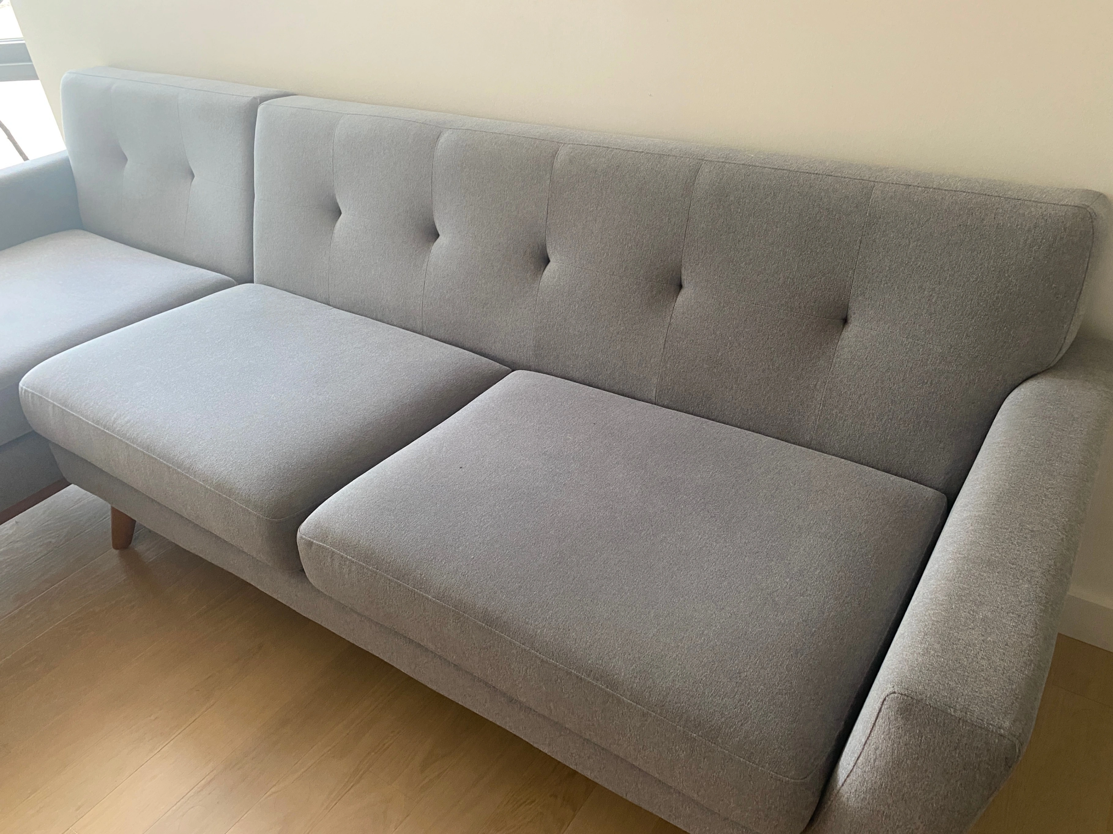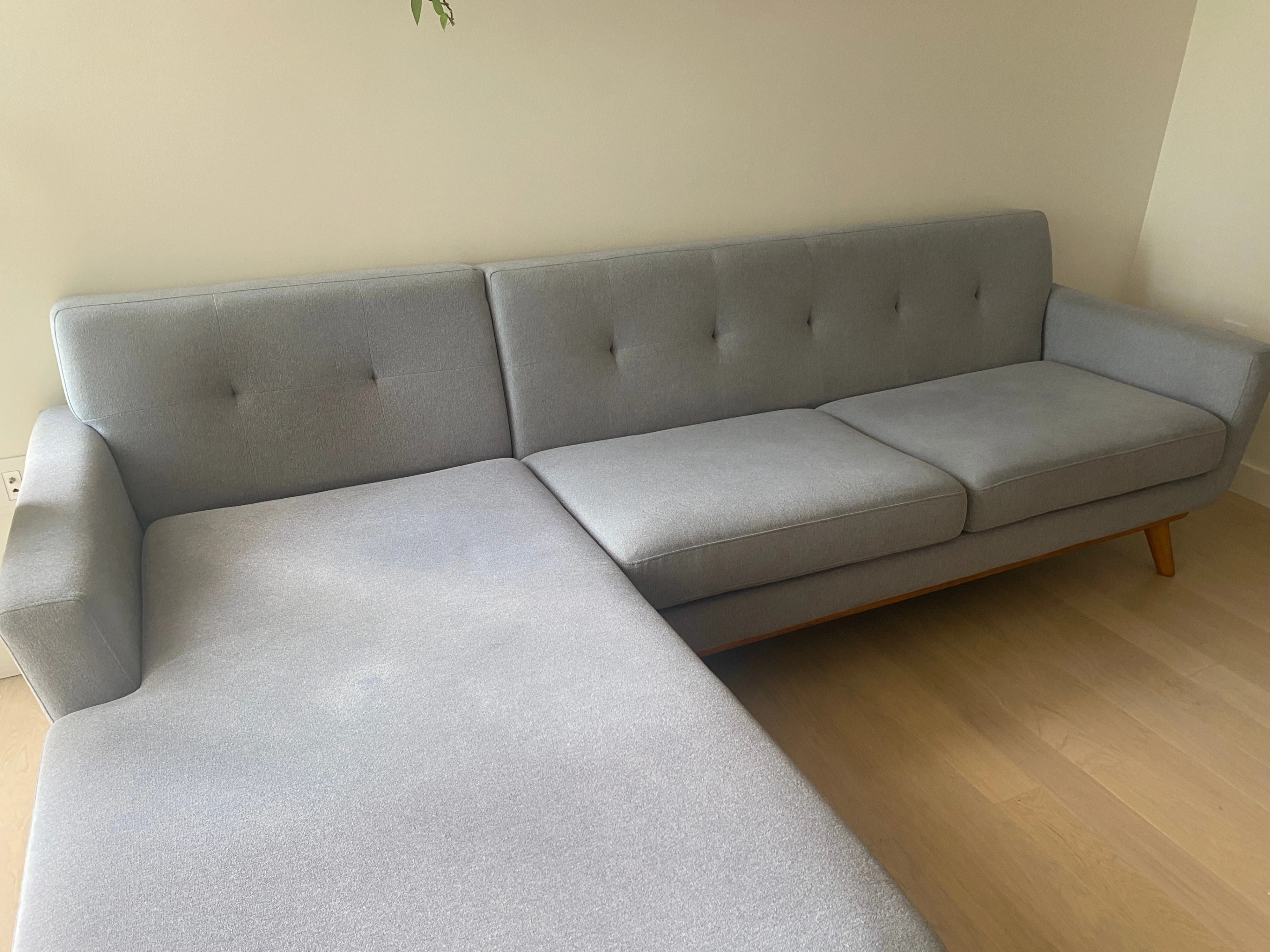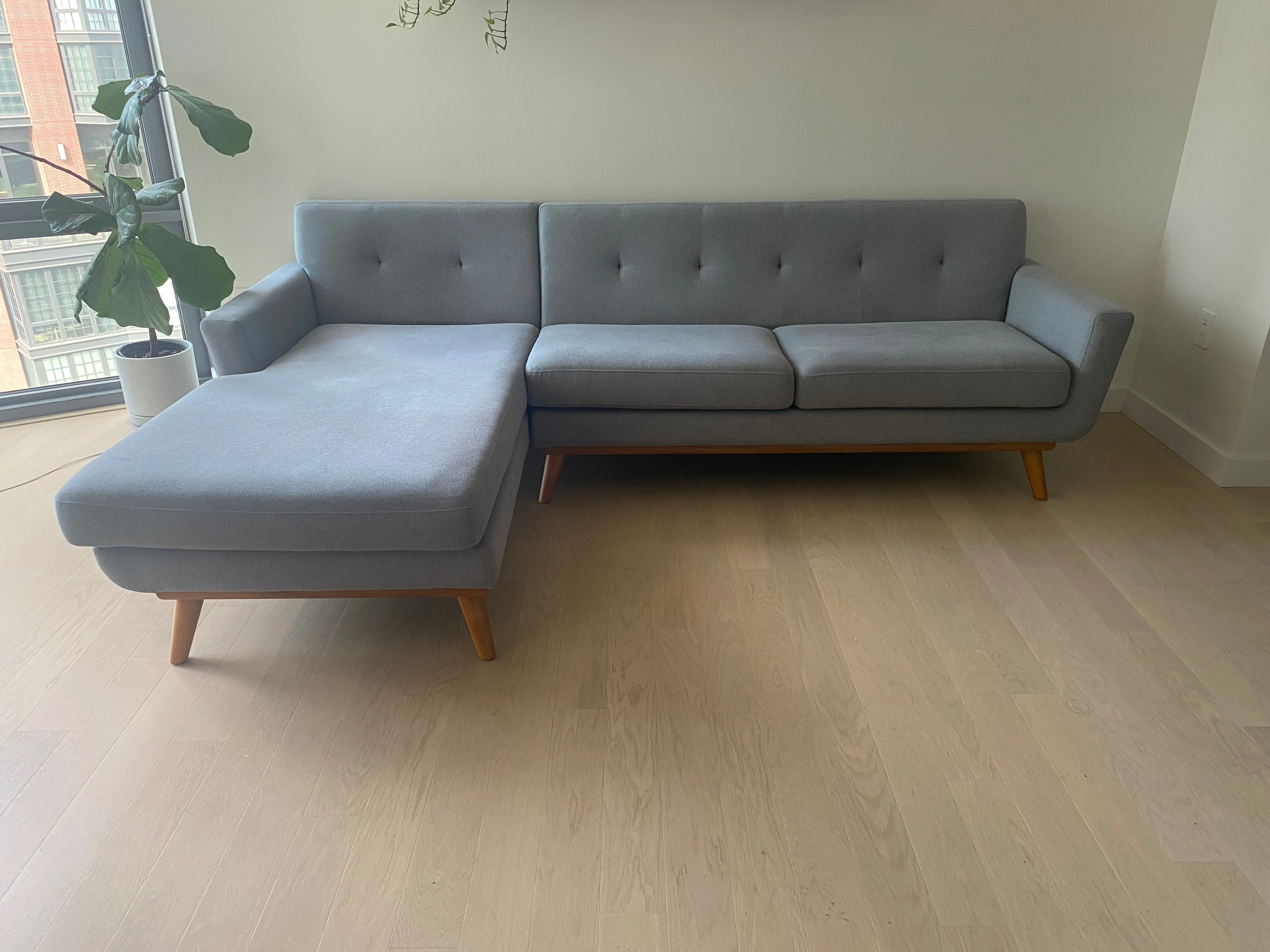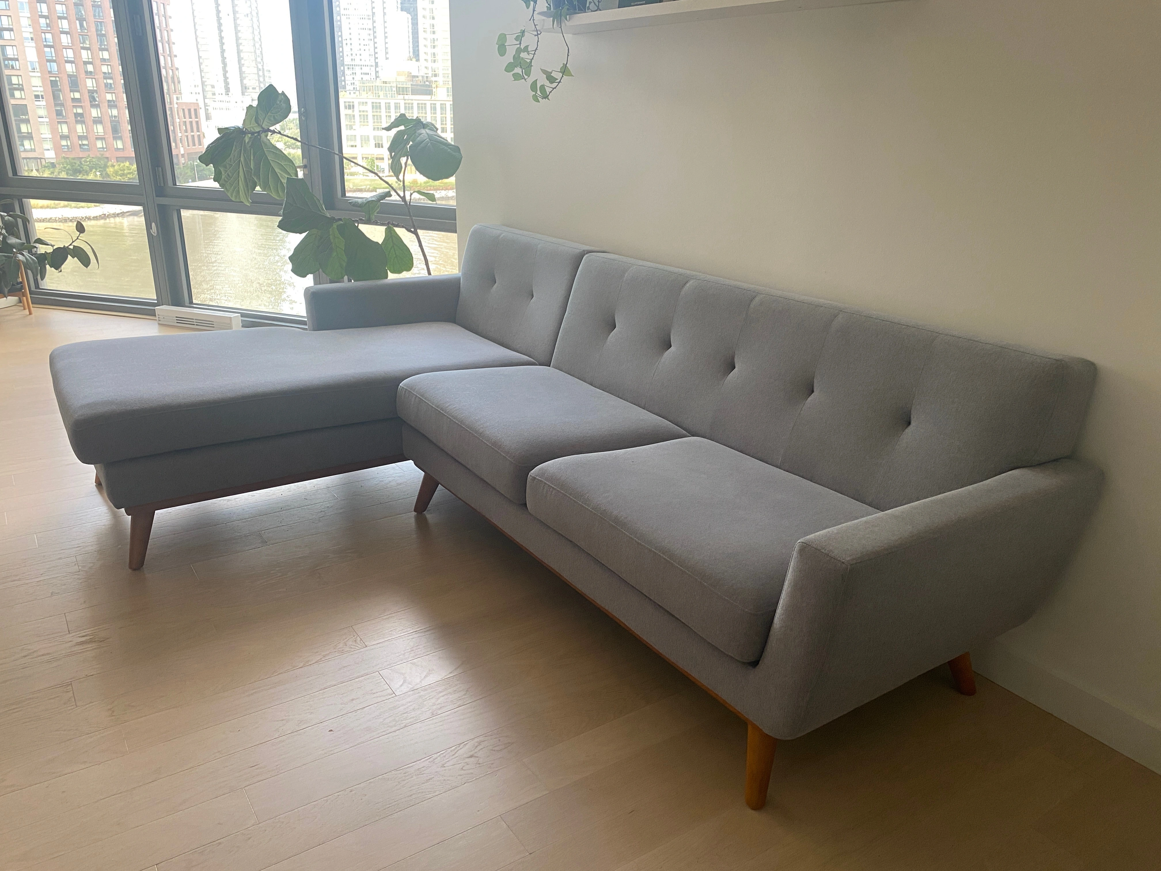 Moving and need this gone asap. Left facing gray sectional sofa. Original price $1,700. Greenpoint pick up (elevator building) – or if you need a mover, I have someone that can help door to door at an extra cost. Price dependent on distance. Measurements: About 34" H x 109.5" W x 70" D (regular seat depth 34”). Light brown rubberwood splayed legs. Large removable cushions. Disassembles into two pieces to fit through doorways. Mid-century modern.