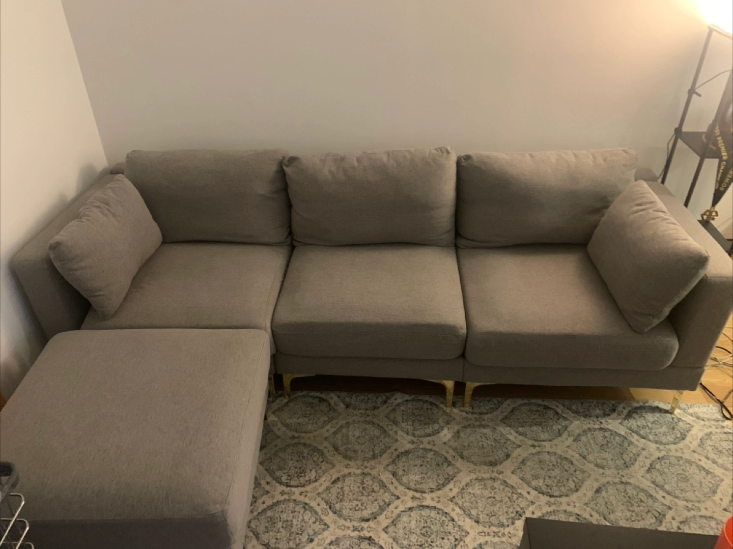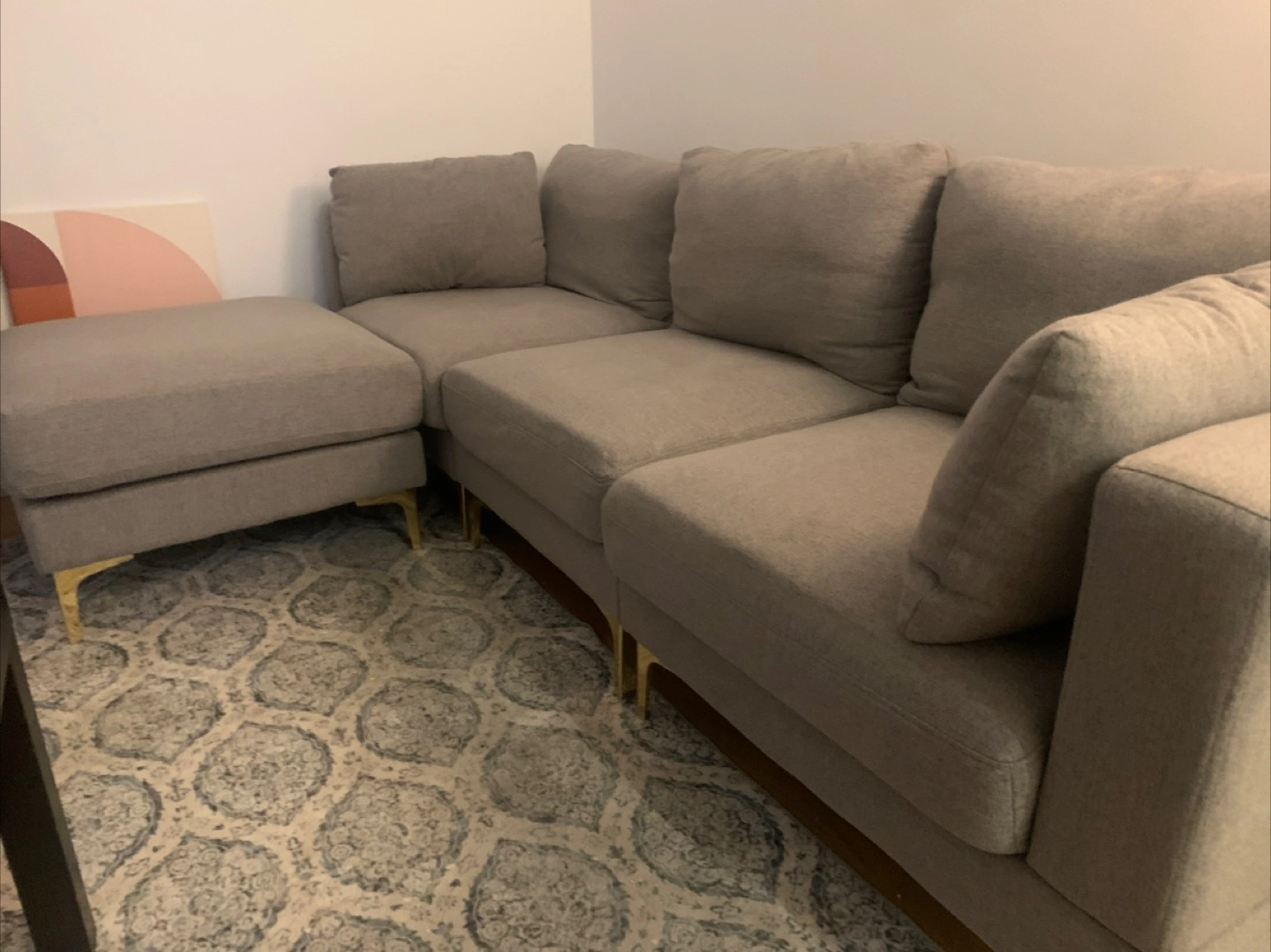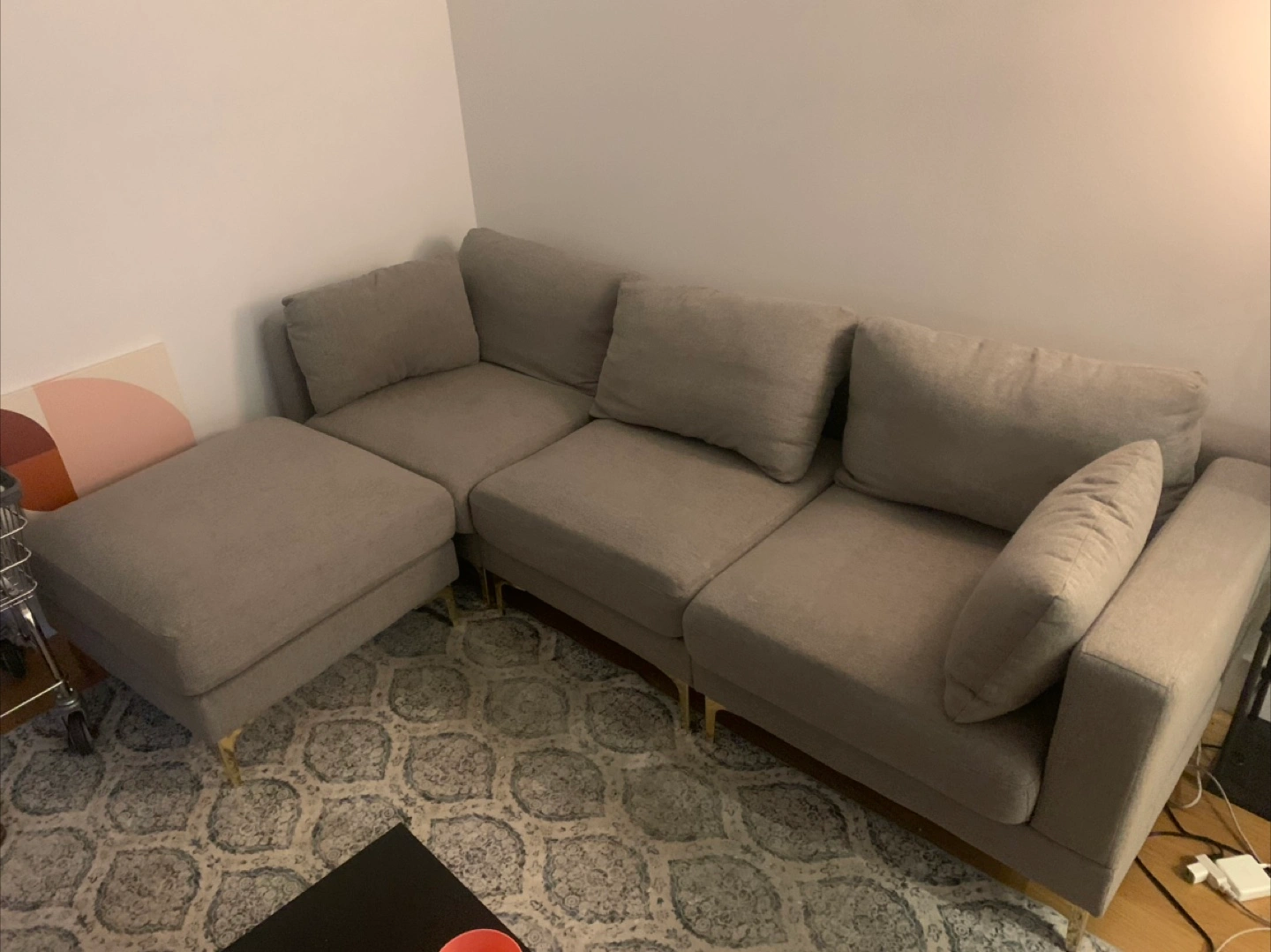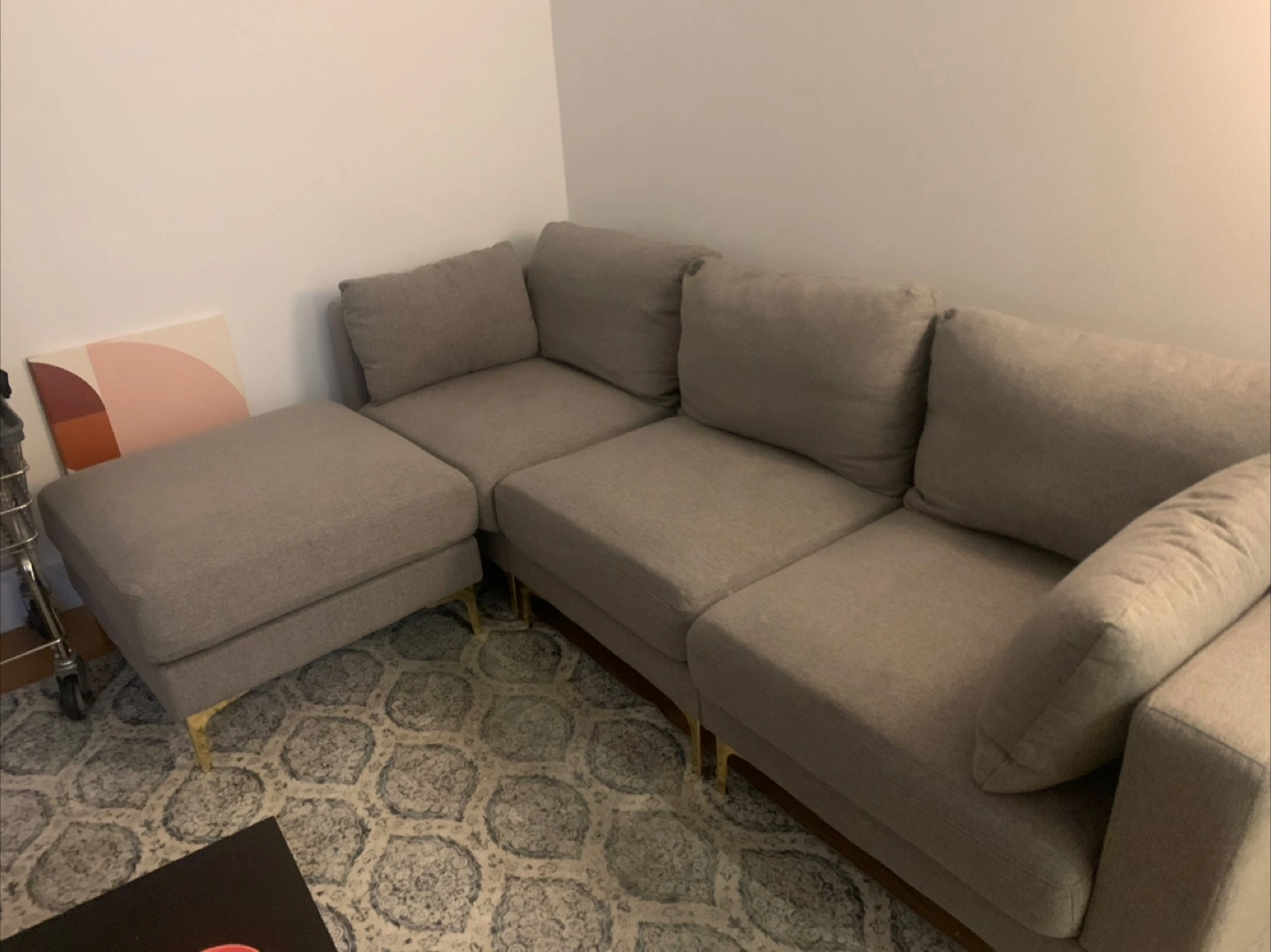 MUST SELL / financial district 99 John street. Selling a comfortable sectional sofa with an ottoman! It's in great condition and features a stylish light gray color. This sectional is perfect for lounging and adds a touch of elegance to any living space. The ottoman provides extra seating or a place to kick your feet up. It's a great addition to any home!