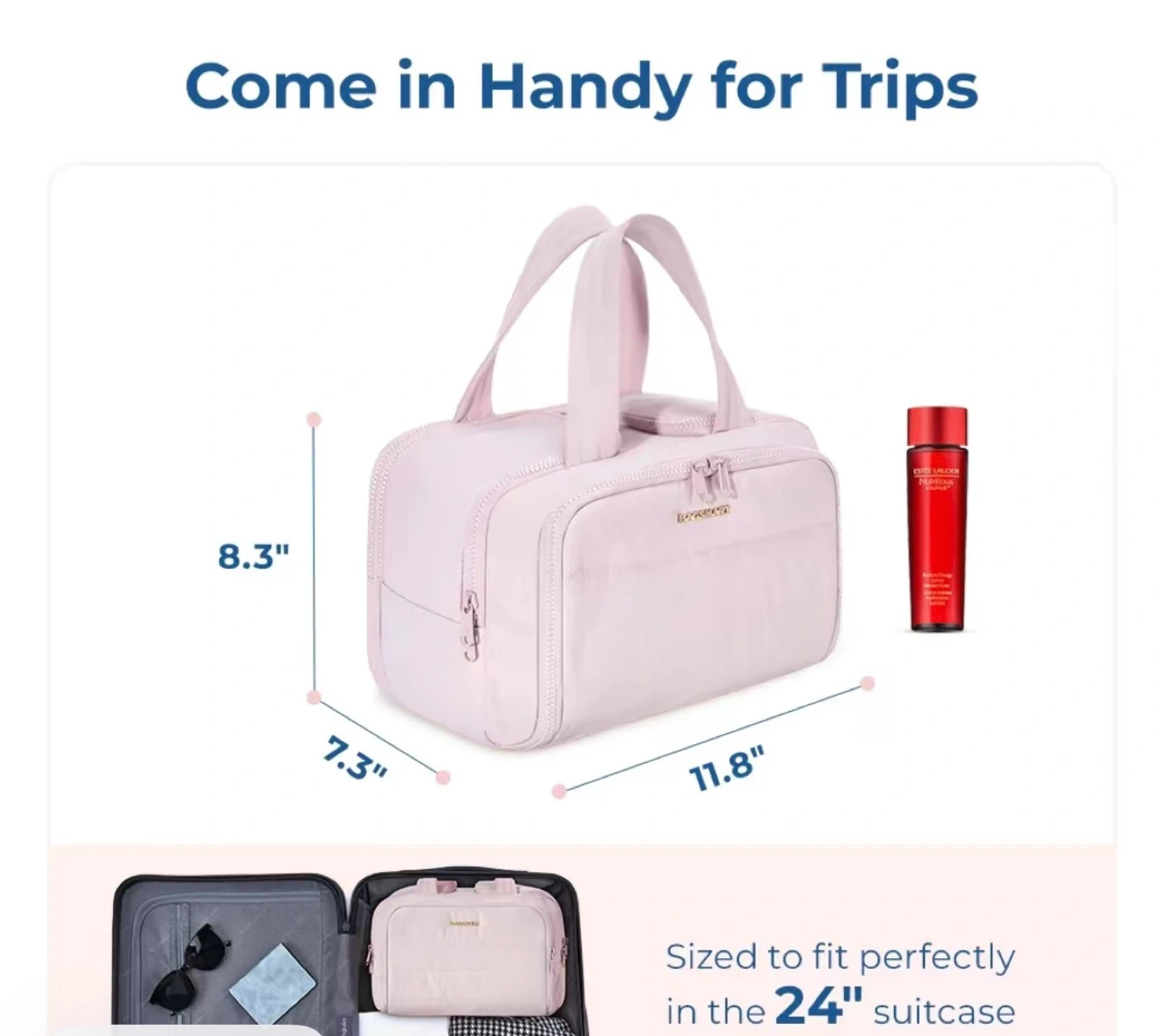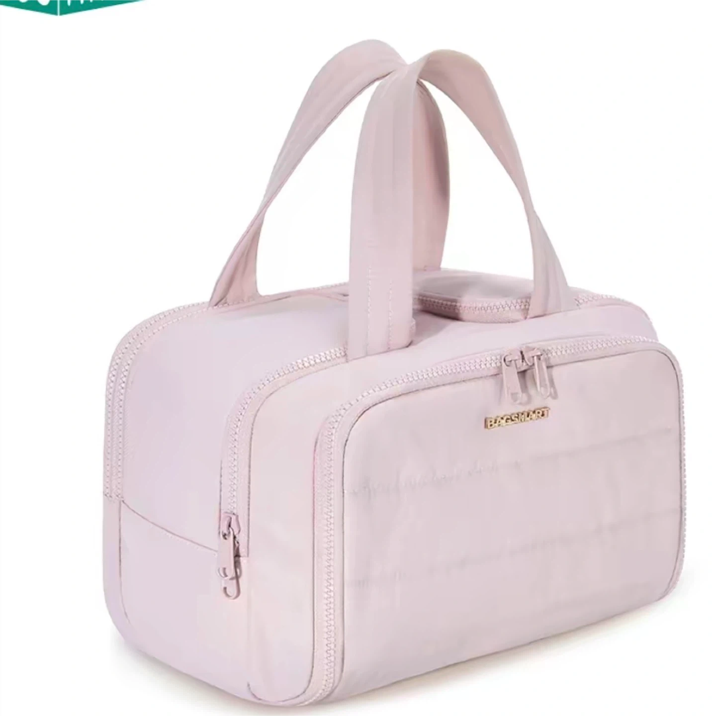 Brand new travel toiletry bag is perfect for trips! It's a pale pink color and features dual pockets, a wide-mouth opening, and elastic straps for brushes. The material is easy-to-clean PVC.