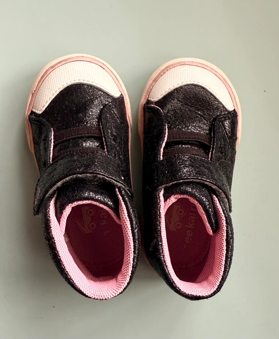 Cute pair of See Kai Run “Drew” high-top sneakers in black sparkle texture textile and pink detailing. They are in excellent used condition. Just need a good wipe down. Toddler size 5.