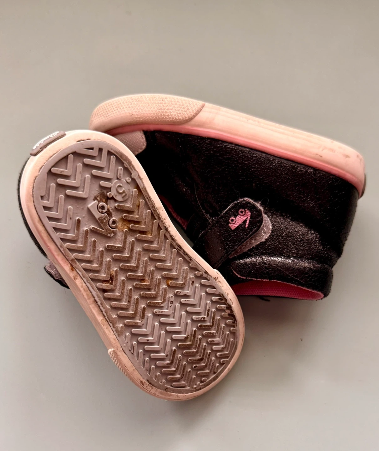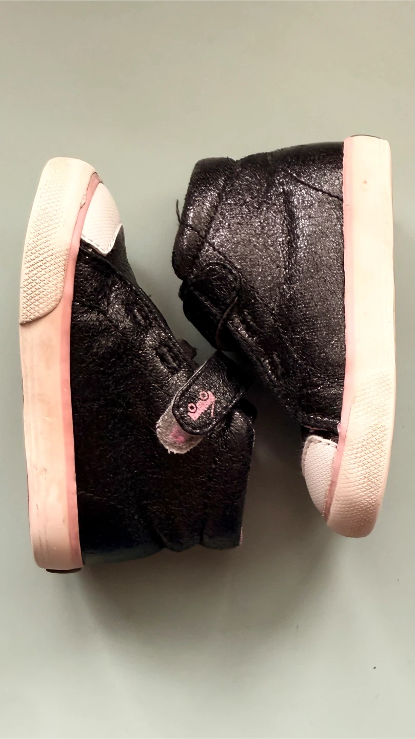 Cute pair of See Kai Run “Drew” high-top sneakers in black sparkle texture textile and pink detailing. They are in excellent used condition. Just need a good wipe down. Toddler size 5.