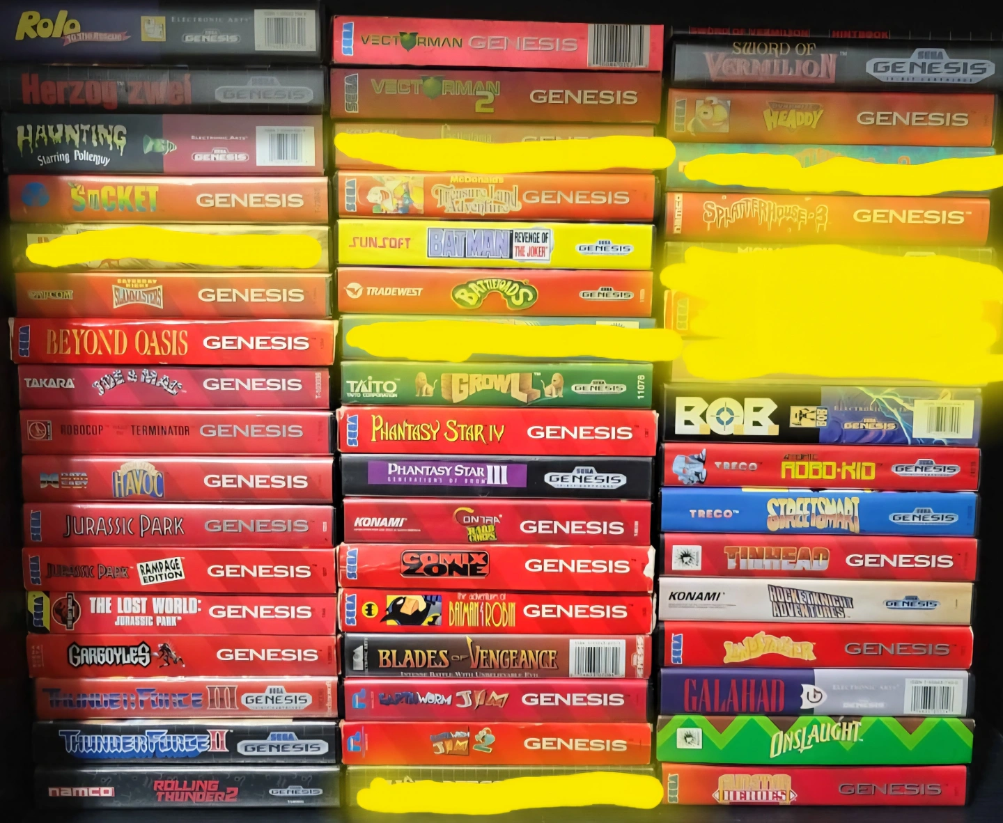 Phantasy Star III doesn't have the map or hint book. Everything is 100% original. No repros. Adventures of Batman & Robin - $130 Aero the Acrobat - $30 After Burner II - $30 Aladdin - $20 Alien 3 - $40 Alien Storm - $50 Art of Fighting - $40 Asterix and the Great Rescue - $20 Atomic Robo-Kid - $50 B.O.B. - $50 Batman - $100 Batman Forever - $20 Batman Returns - $30 Batman: Revenge of the Joker - $120 Beyond Oasis - $160 Bio-Hazard Battle - $60 Blades of Vengeance - $100 Bubsy II - $30 Bubsy in Claws Encounters of the Furred Kind - $20 Captain America and the Avengers - $60 Castle of Illusuion Starring Mickey Mouse - $50 Chakan - $30 Championship Bowling - $20 Chuck Rock - $40 Chuck Rock II: Son of Chuck - $30 Cliffhanger - $20 Columns - $20 Combat Cars - $20 Comix Zone - $100 Contra: Hard Corps - $150 Cyborg Justice - $20 Deadly Moves - $40 Death & Return of Superman - $230 Decap Attack - $40 Desert Strike: Return to the Gulf - $20 Dinosaurs for Hire - $70 DJ Boy - $40 Dr. Robotnik's Mean Bean Machine - $40 Dynamite Headdy - $60 Earthworm Jim - $60 Earthworm Jim 2 - $120 Ecco the Dolphin - $20 Ecco the Dolphin: The Tides of Time - $20 E-SWAT: City Under Siege - $40 Ex-Mutants - $30 Fatal Fury - $40 Fatal Fury 2 - $70 Fire Shark - $70 Flashback: The Quest for Identity - $30 Frank Thomas Big Hurt Baseball - $20 Frogger - $20 Galahad - $80 Gargoyles - $130 General Chaos - $40 Great Circus Mystery Starring Mickey Mouse - $40 Growl - $170 Gunstar Heroes - $140 Hard Drivin' - $10 Herzog Zwei - $100 High Seas Havoc - $80 Hook - $40 Incredible Hulk - $40 Jewel Master - $40 Joe & Mac - $100 Journey from Darkness: Strider Returns - $40 Jungle Strike - $20 Jurassic Park - $20 Jurassic Park: Rampage Edition - $40 Justice League Task Force - $30 Kid Chameleon - $30 King of the Monsters - $40 King of the Monsters - $30 Landstalker - $60 Light Crusader - $40 Lion King - $20 The Lost World: Jurassic Park - $160 Marble Madness - $20 McDonald's Treasureland Adventure - $160 Mercs - $40 Mickey Mania: The Timeless Adventures of Mickey Mouse - $30 Mortal Kombat - $20 Mortal Kombat II - $20 Mortal Kombat 3 - $20 Mystic Defender - $40 Onslaught - $140 Out of This World - $40 Phantasy Star III: Generations of Doom - $60 Phantasy Star IV: The End of the Millennium - $200 Phelios - $60 Predator 2 - $50 Primal Rage - $20 Pugsy - $20 QuackShot Starring Donald Duck - $40 Rastan Saga II - $60 Risky Woods - $70 RoboCop Versus the Terminatior - $70 Rocket Knight Adventures - $70 Rolo to the Rescue - $60 Rolling Thunder 2 - $90 Samurai Shodown - $30 Saturday Night Slam Masters - $140 Shadow Blasters - $50 Shadow of the Beast - $30 Shadow of the Beast II - $30 Socket - $80 Space Harrier II - $30 Speedball 2: Brutal Deluxe - $40 Spider-Man - $30 Spider-Man: The Animated Series - $40 Spider-Man & Venom: Maximum Carnage - $50 Spider-Man/X-Men: Arcade's Revenge - $30 Steel Empire - $80 Street Fighter: Special Champion Edition - $20 Street Smart - $40 Super Street Fighter II: The New Challengers - $30 Super Thunder Blade - $20 Superman - $60 Sword of Vermillion - $40 Techno Cop - $30 Thunder Force II - $40 Thunder Force III - $80 Tinhead - $40 Tiny Toon Adventures: Buster's Hidden Treasure - $30 ToeJam & Earl in Panic on Funkatron - $30 Toxic Crusaders - $60 Twin Cobra - $50 Tyrants: Fight Through Time - $30 Ultimate Mortal Kombat 3 - $80 Urban Strike - $20 Vectorman - $30 Vectorman 2 - $30 Venom/Spider-Man: Separation Anxiety - $70 Virtua Racing - $40 Warlock - $30 WeaponLord - $70 Wolverine: Adamantium Rage - $50 Wonder Boy in Monster World - $60 World Heroes - $30 World of Illusion Starring Mickey Mouse and Donald Duck - $40 World Championship Soccer - $10 X-Men - $20 X-Men 2: The Clone Wars - $60 Zombies Ate My Neighbors - $50 Zoom! - $20