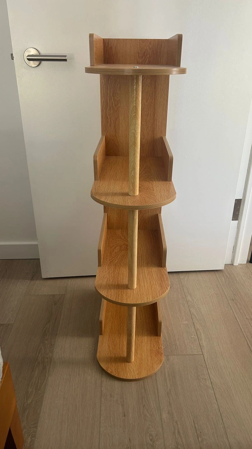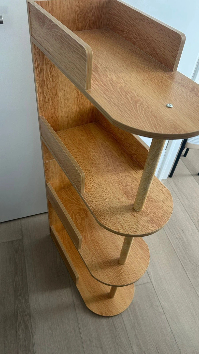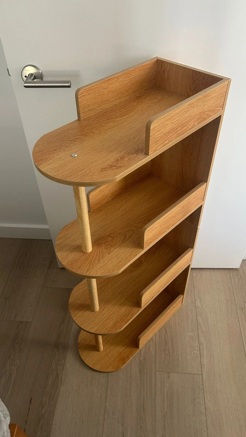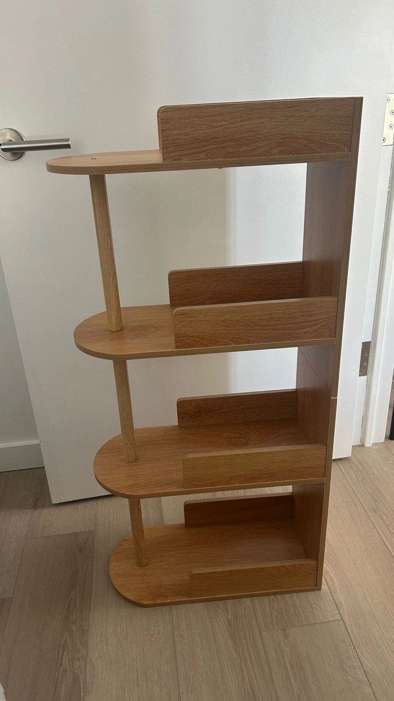 Add a touch of contemporary design and functional storage to your home with this unique 4-tier vertical shelving unit. Featuring a warm, natural wood-grain finish and a distinctive "pill-shaped" shelf design, this piece is engineered to fit perfectly into tight spaces while providing ample room for organization.