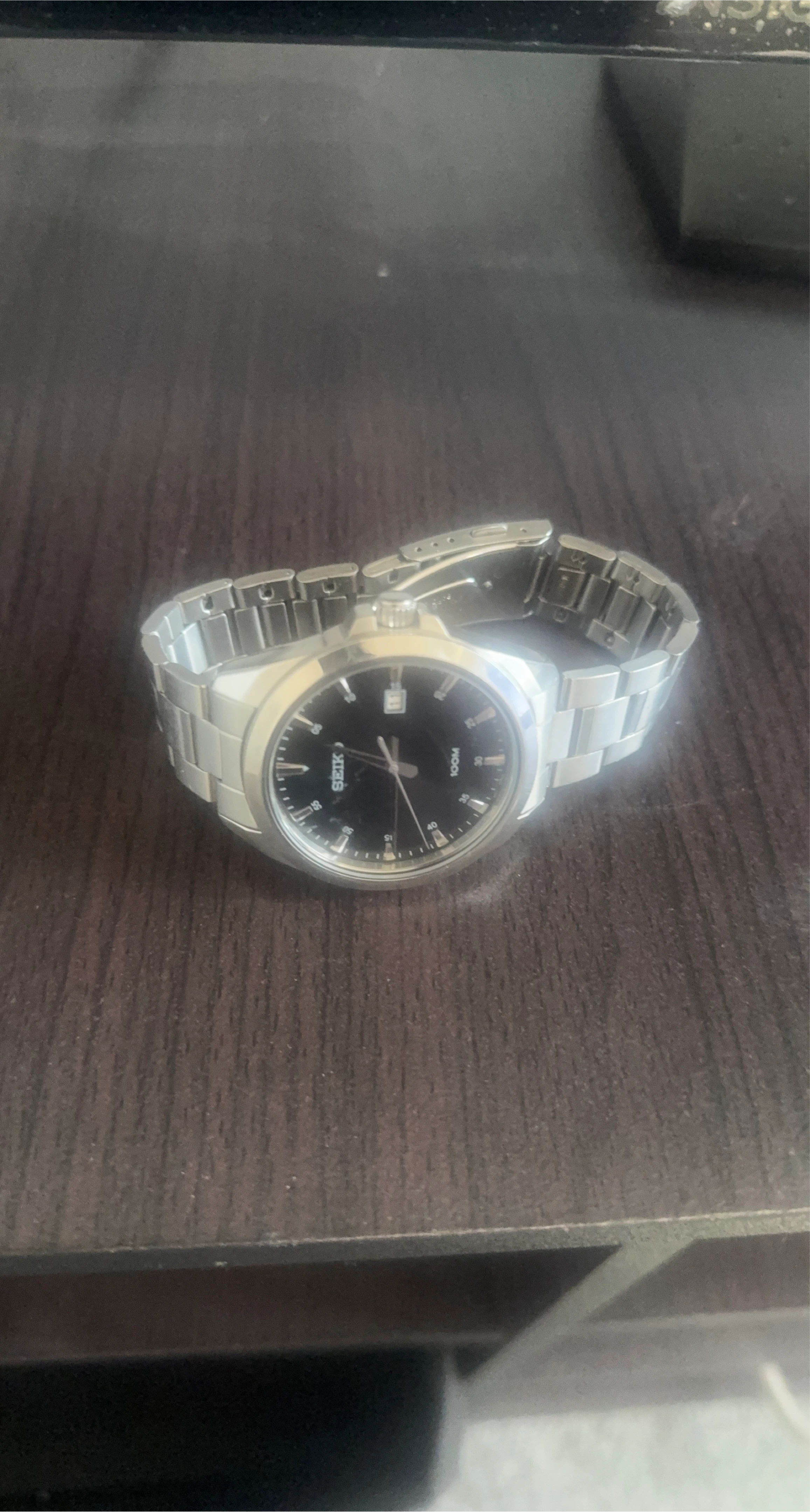 Selling a Seiko watch with a stainless steel band and a black face. It says 100M on the face of the watch.