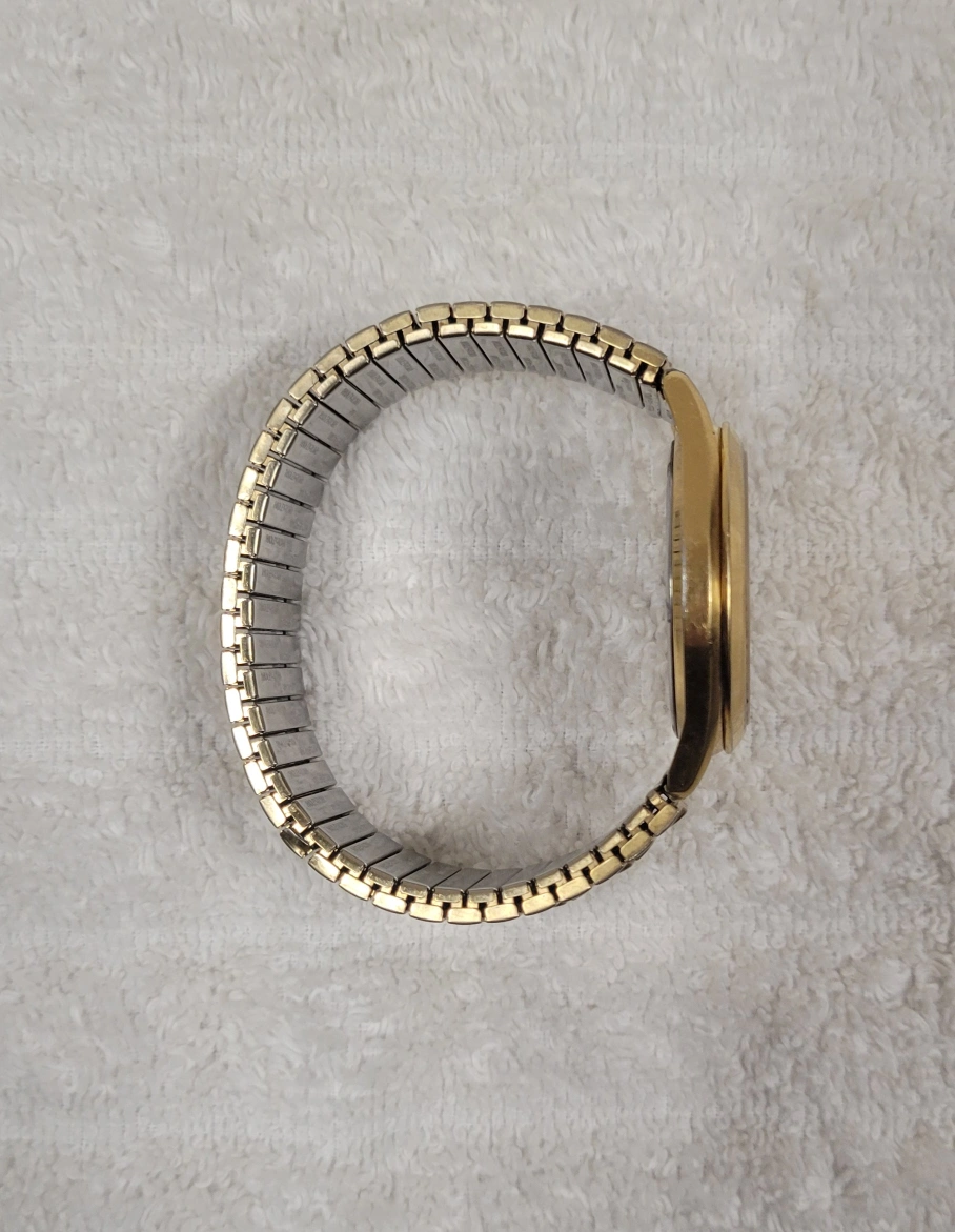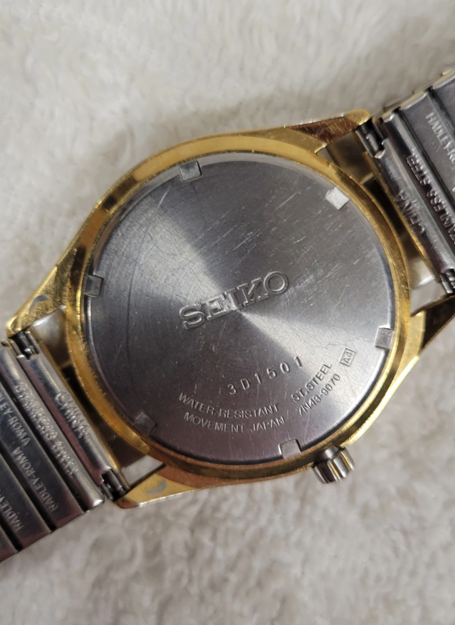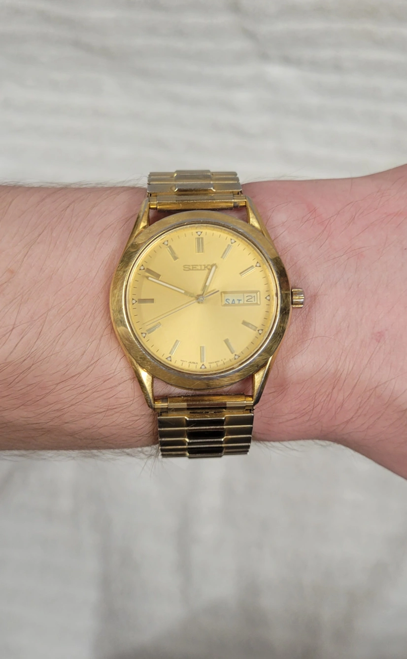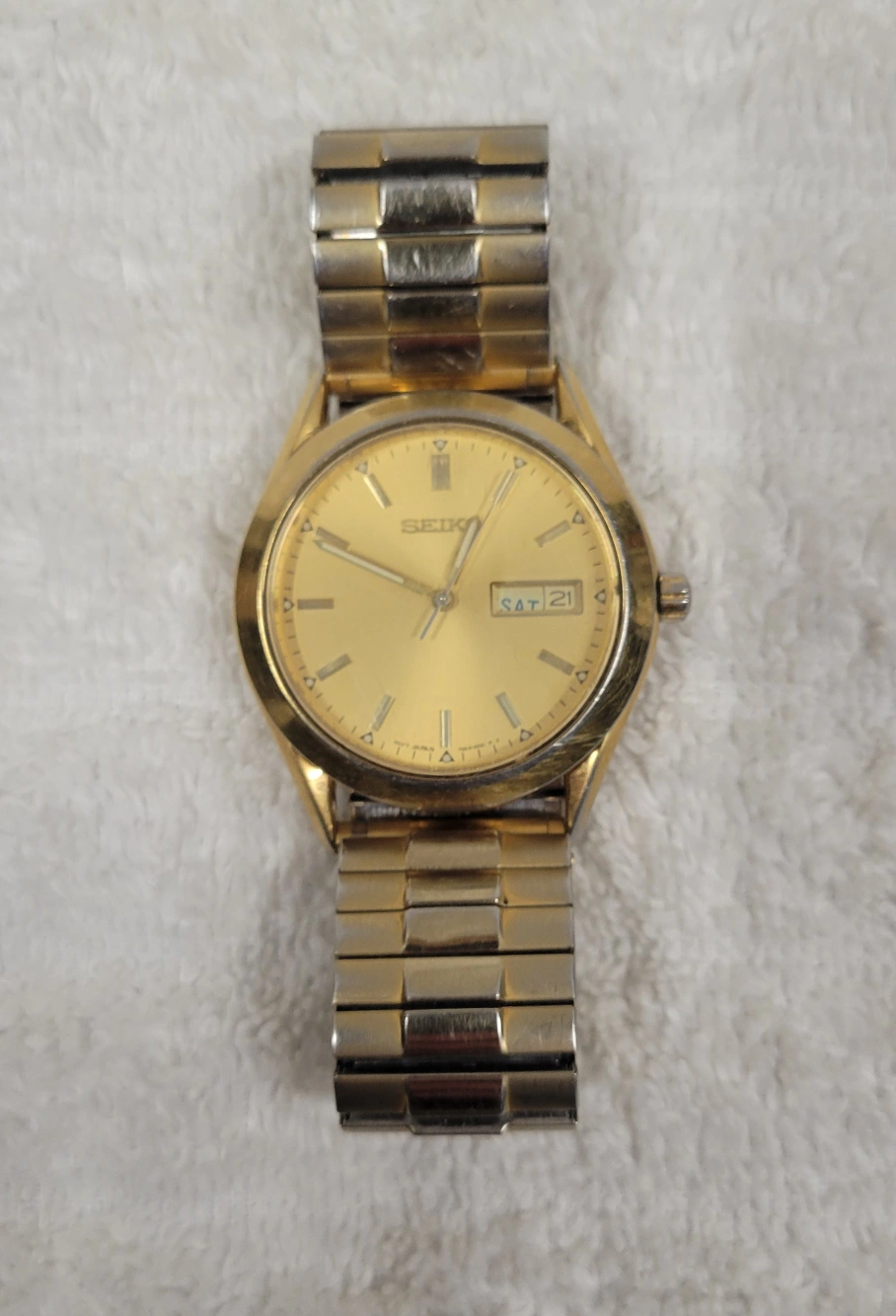 Selling a Seiko men's watch with a gold-tone finish The watch features a day and date display It shows some signs of wear but still looks great